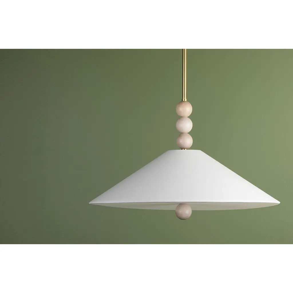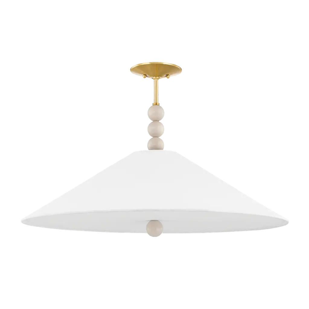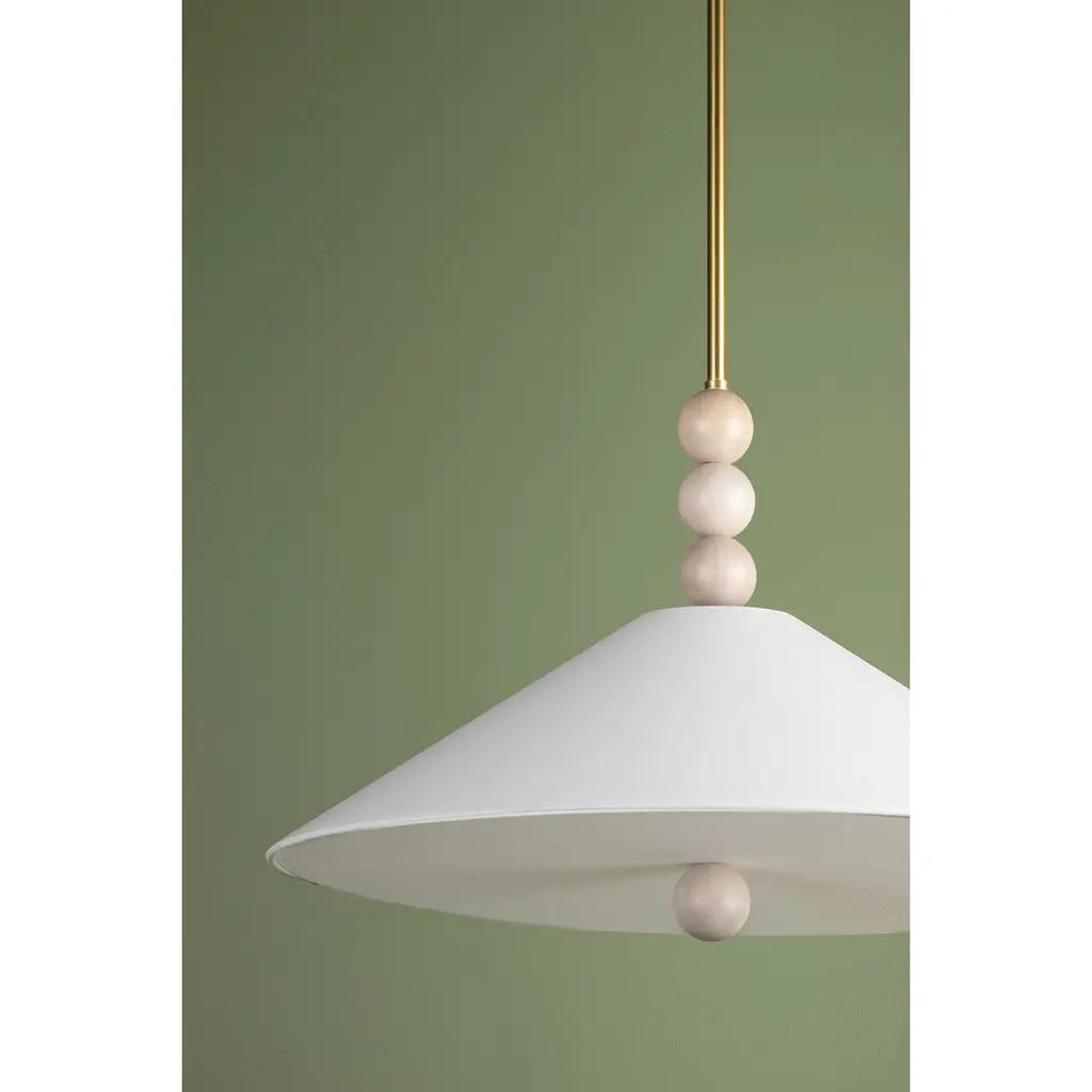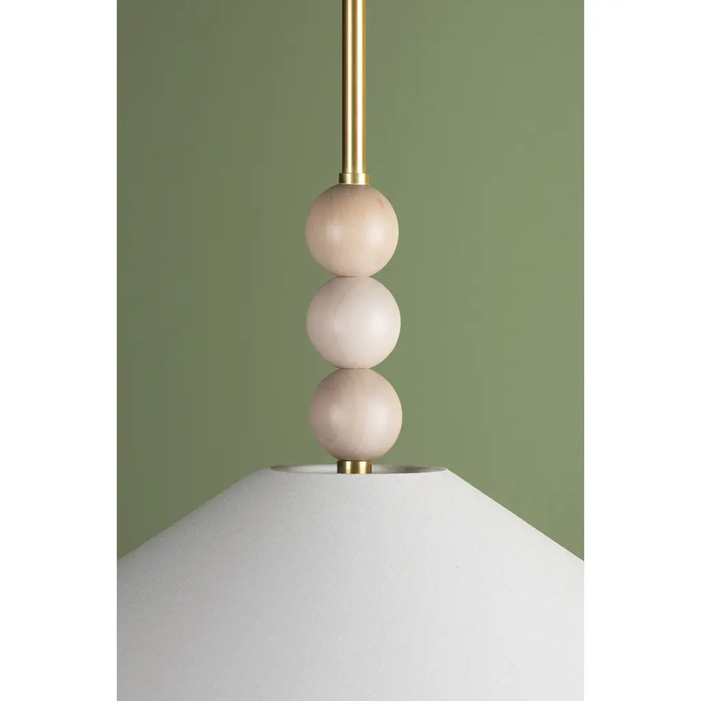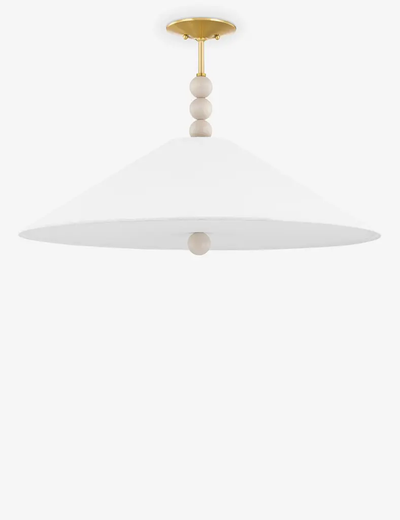 Alexis reimagines a traditional American design detail. Inspired by vintage bobbin furniture pieces, wooden spheres of whitewash ash decorate a white linen shade from both above and below, creating the illusion that they pierce through the shade. Natural elements and a simple silhouette make this pretty pendant a welcome addition to any space.