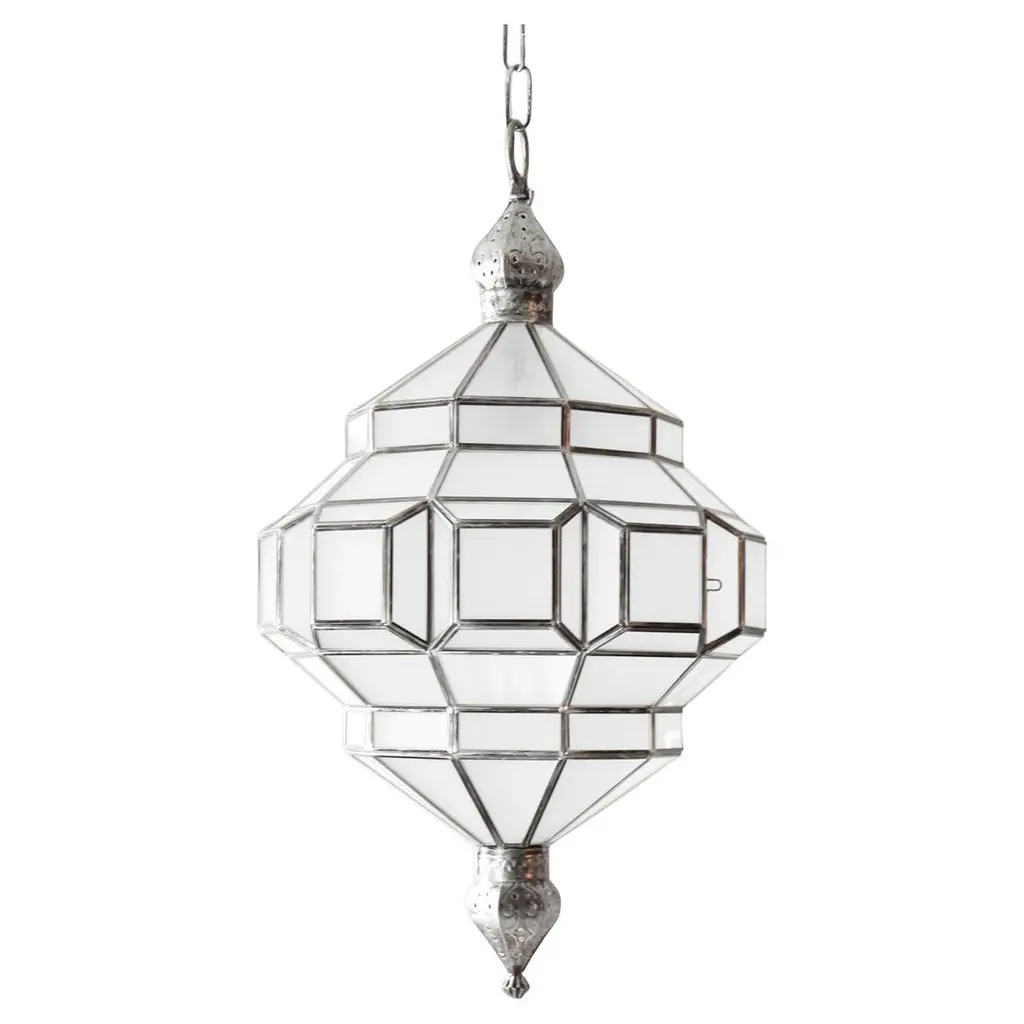 These glass lanterns are made in a generations-old workshop in Granada, Spain. Each pendant light is hand forged, and reflects the influence of Moorish design that can be observed throughout the region.These lanterns, with their multitude of diamond-shaped panes (‘rombus’ is derived from the Spanish word for diamond), carry the Moorish spirit of the Spanish city in which they are made, translating it into a modernist silhouette.Dimensions:14″ Ø x 24″ h35cm Ø x 60cm hLampingE26 bulb, 60W maxFully compatible dimmingCertificationsUL, cUL listed (120V) 240V available upon request.Mountinguniversal ceiling mount; hardwired.Suspension3 ft link chain (standard)Metal finishBrass Patina, Black Satin, Silver Patina