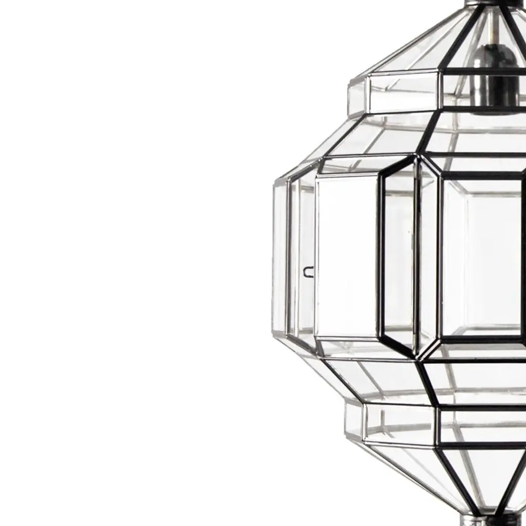 These glass lanterns are made in a generations-old workshop in Granada, Spain. Each pendant light is hand forged, and reflects the influence of Moorish design that can be observed throughout the region.These lanterns, with their multitude of diamond-shaped panes (‘rombus’ is derived from the Spanish word for diamond), carry the Moorish spirit of the Spanish city in which they are made, translating it into a modernist silhouette.Dimensions:5 sockets28” Ø x 49” h70cm Ø x 125cm hLampingE26 bulb, 60W maxFully compatible dimmingCertificationsUL, cUL listed (120V) 240V available upon request.Mountinguniversal ceiling mount; hardwired.Suspension6′ link chain (Standard)Metal finishBrass Patina, Black Satin, Silver Patina