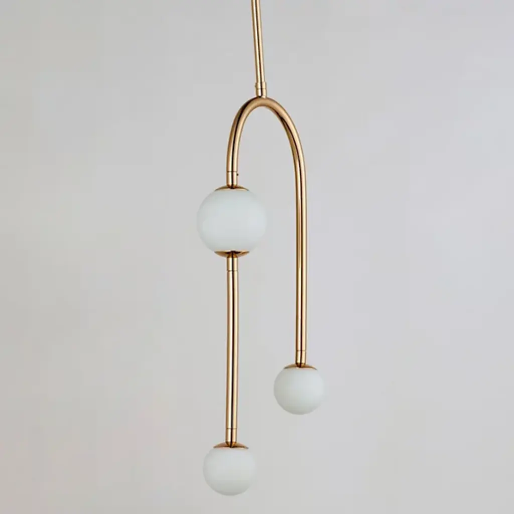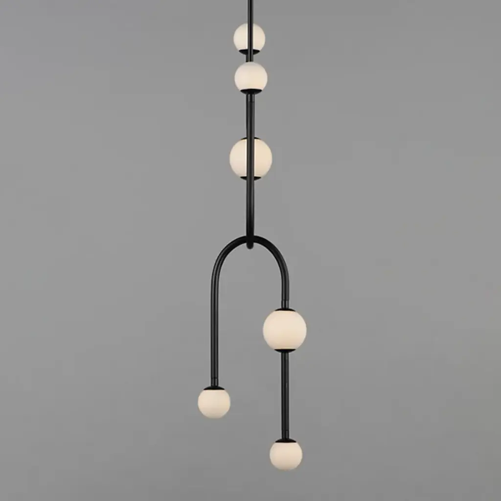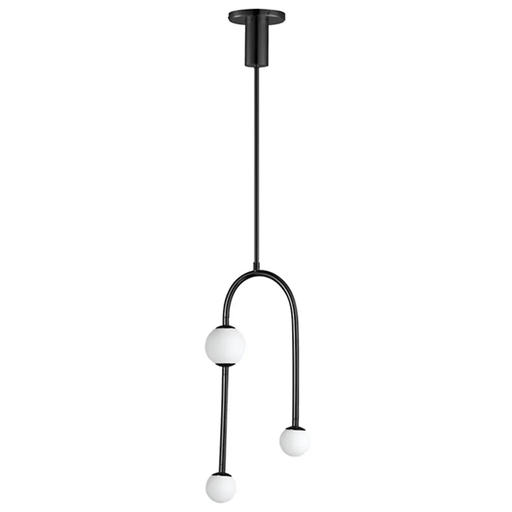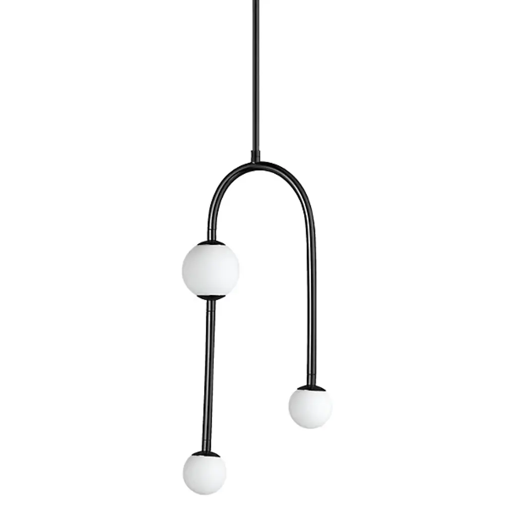 The Alina LED Pendant was designed by Nina Magon for Studio M. The intention was to manifest a style of lighting that adorns a room like fine jewelry. Boasting a mid-century modern silhouette, a curving metallic structure with figurative pearls of white opal glass has been suspended from a metallic stem and canopy. This contemporary piece can be placed in damp locales like a covered patio or entryway and all standard dry interiors, thus offering even further appeal to an already stunning item.