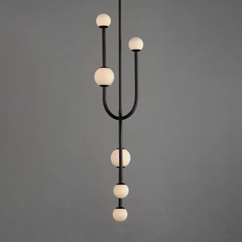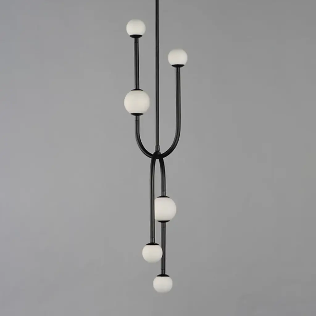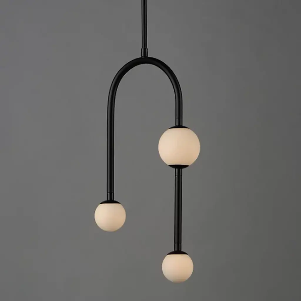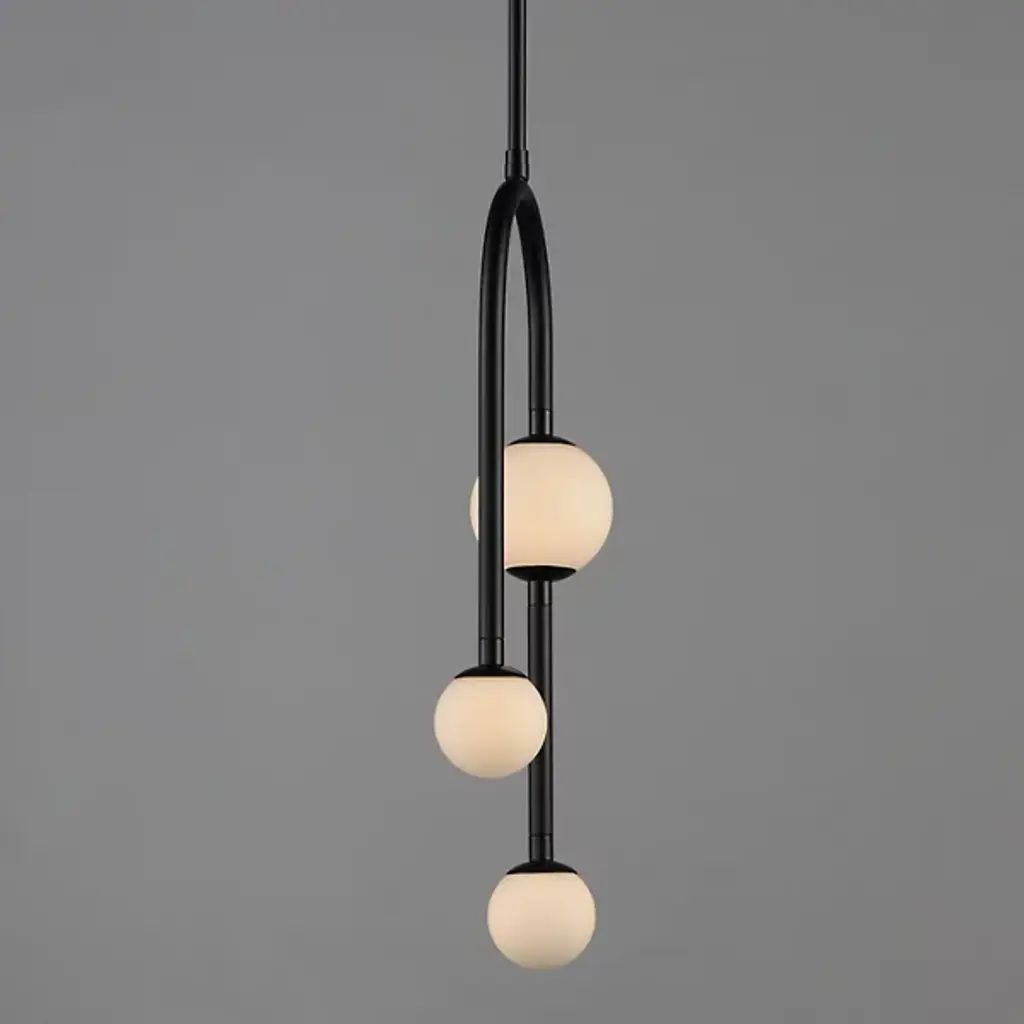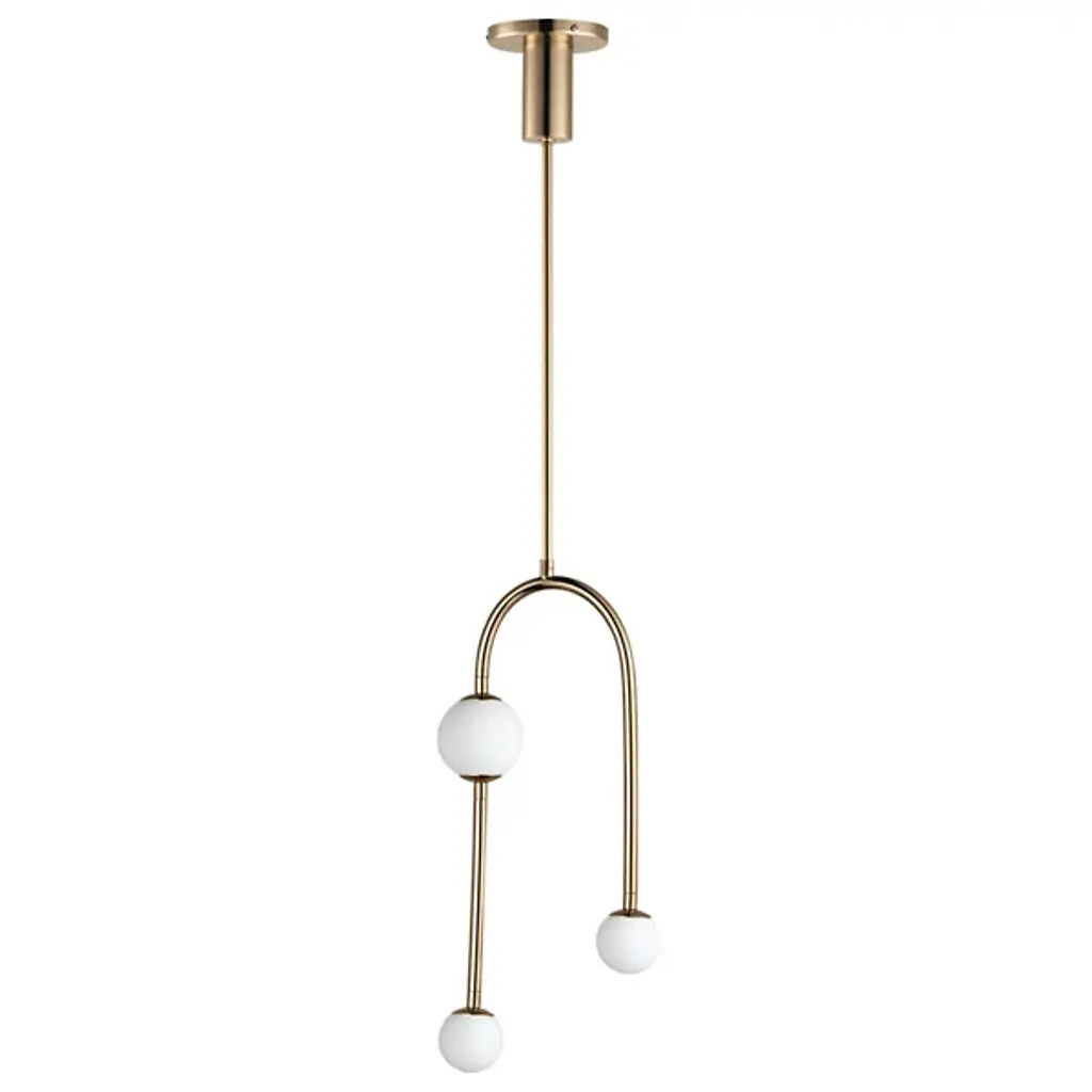 The Alina LED Pendant was designed by Nina Magon for Studio M. The intention was to manifest a style of lighting that adorns a room like fine jewelry. Boasting a mid-century modern silhouette, a curving metallic structure with figurative pearls of white opal glass has been suspended from a metallic stem and canopy. This contemporary piece can be placed in damp locales like a covered patio or entryway and all standard dry interiors, thus offering even further appeal to an already stunning item.