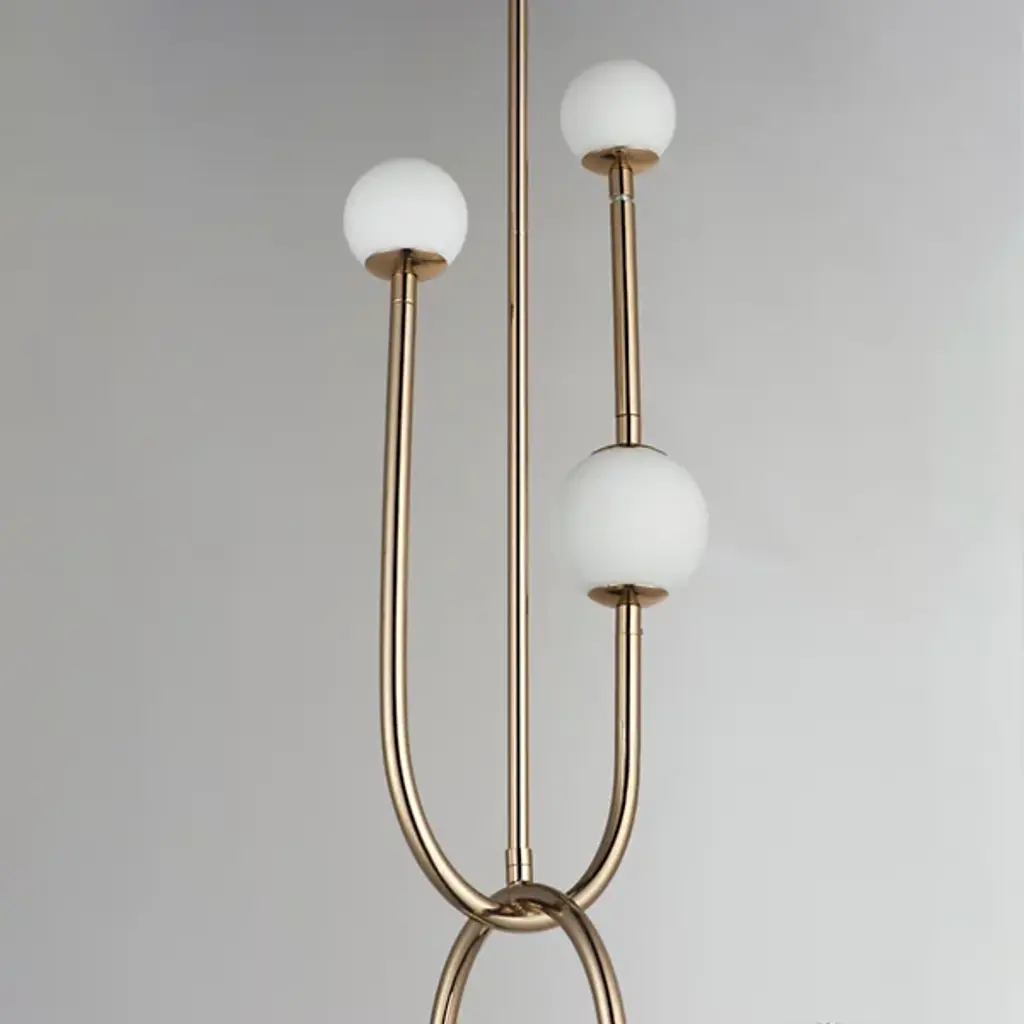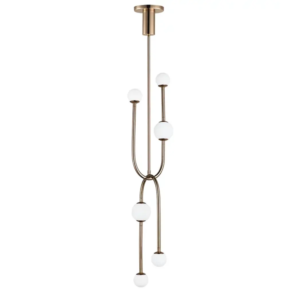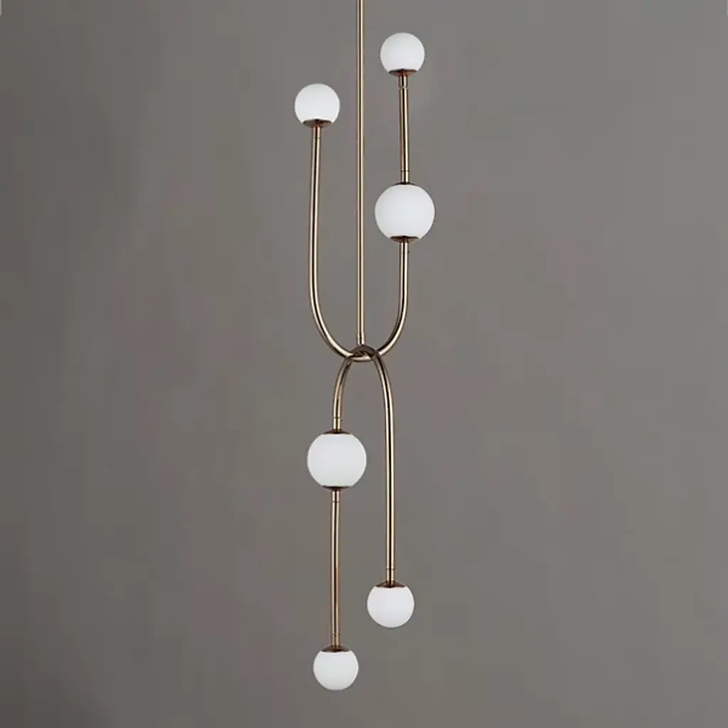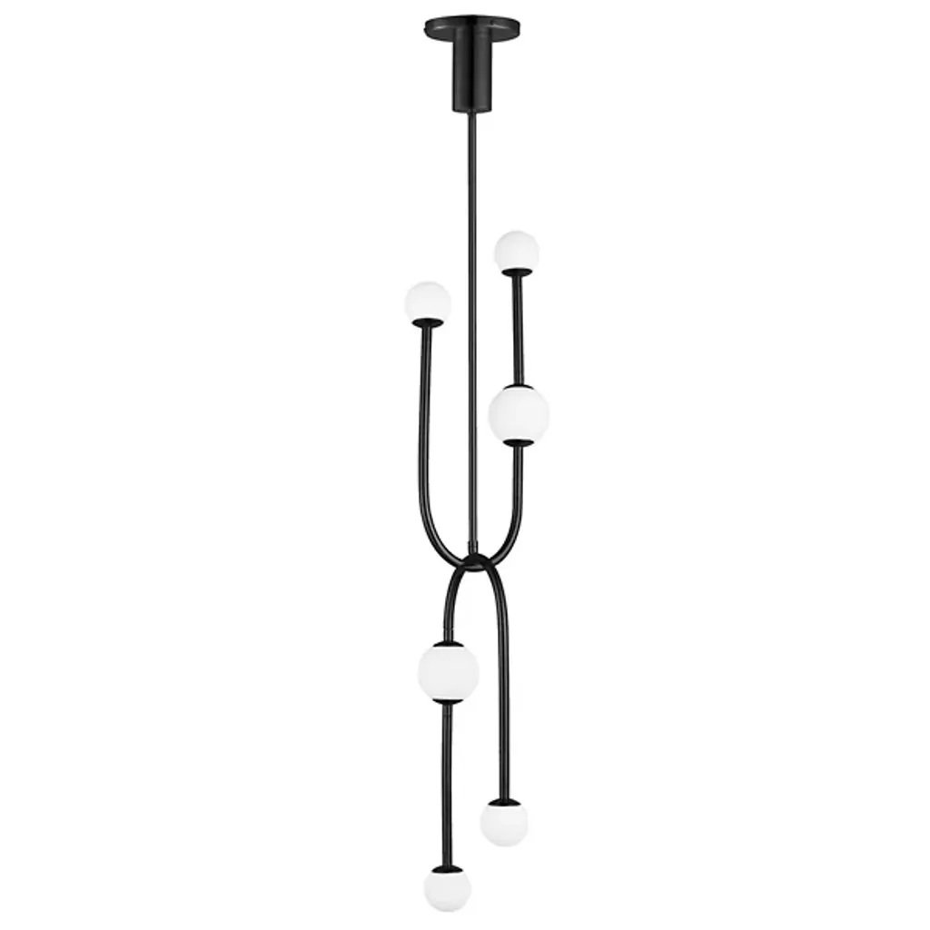 The Alina LED Pendant was designed by Nina Magon for Studio M. The intention was to manifest a style of lighting that adorns a room like fine jewelry. Boasting a mid-century modern silhouette, a curving metallic structure with figurative pearls of white opal glass has been suspended from a metallic stem and canopy. This contemporary piece can be placed in damp locales like a covered patio or entryway and all standard dry interiors, thus offering even further appeal to an already stunning item.