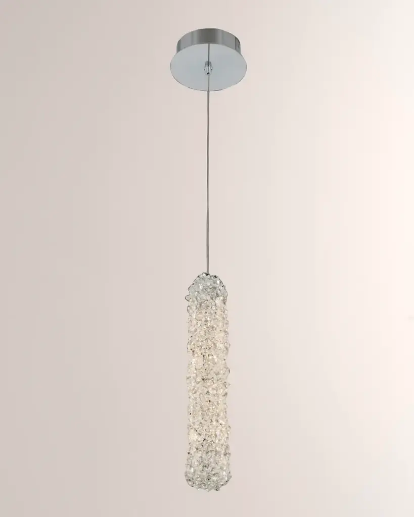 Mini light pendant is made of steel and crystal Uses one 6-watt bulb Approx. 2"Dia. x 14"T Hardware included Assembly required UL listed Backplate dimensions: 6"W x 2"T x 6"L Wipe clean Imported Weight, 5.0lbs Boxed weight, approximately 7.0lbs Proposition 65 warning for California residents Backed by a limited manufacturer’s warranty. ( Click here for warranty information ) undefined
