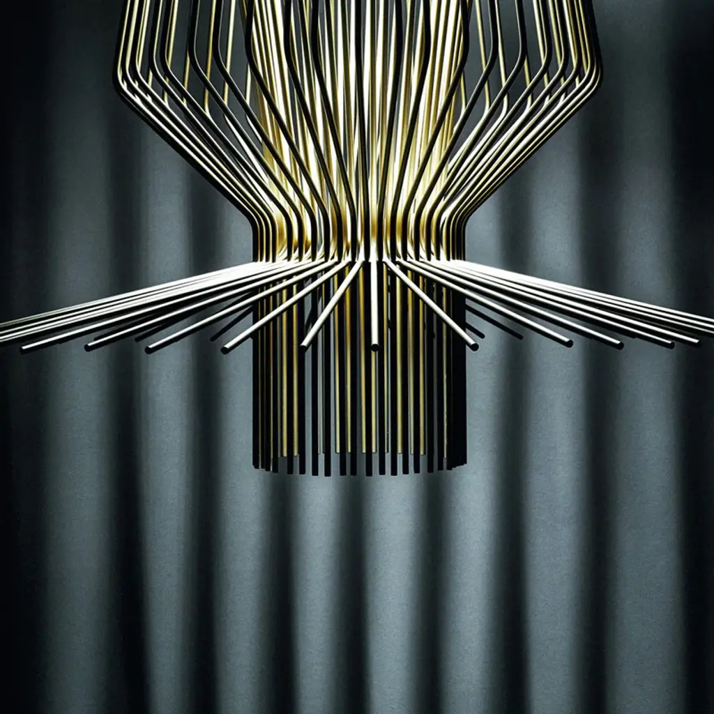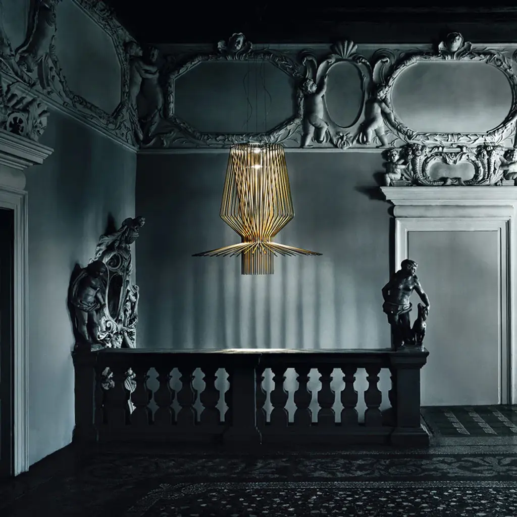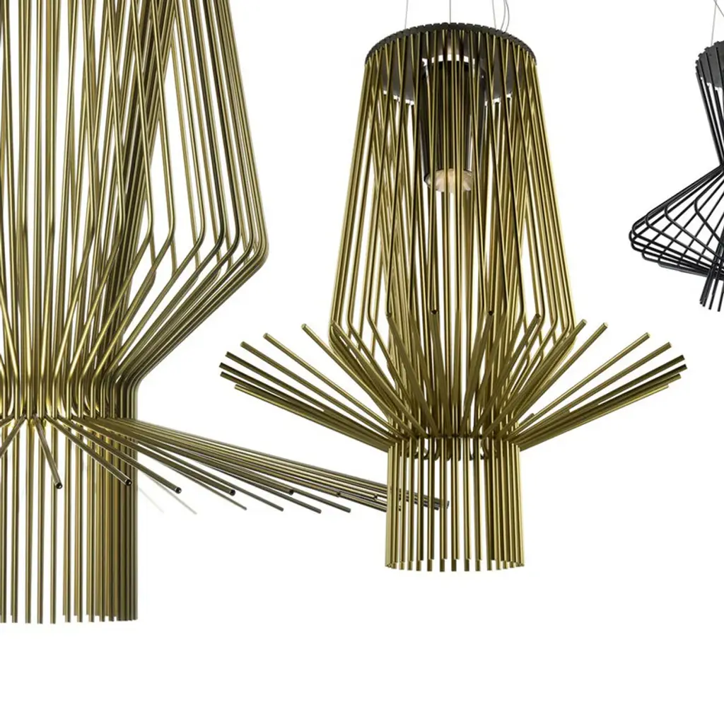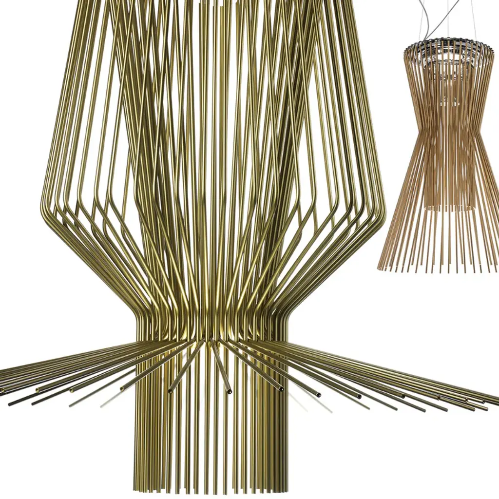 The Foscarini Allegro Assai Suspension Light is part of the Allegro family of modern pendant lights, each defined by their striking metal shapes. Composed of powder coated aluminum rods anchored to a metal frame, each Allegro pendant light has a distinct profile of sculptural beauty, and boasts a trio of metallic finishes: gold, copper and graphite. The Foscarini Allegro Assai Suspension Light is a modern lighting design of impressive size, making it a perfect choice for large public and private spaces, where its diffused downward light provides enviable nuance as it reflects attractively off the ceiling. Features