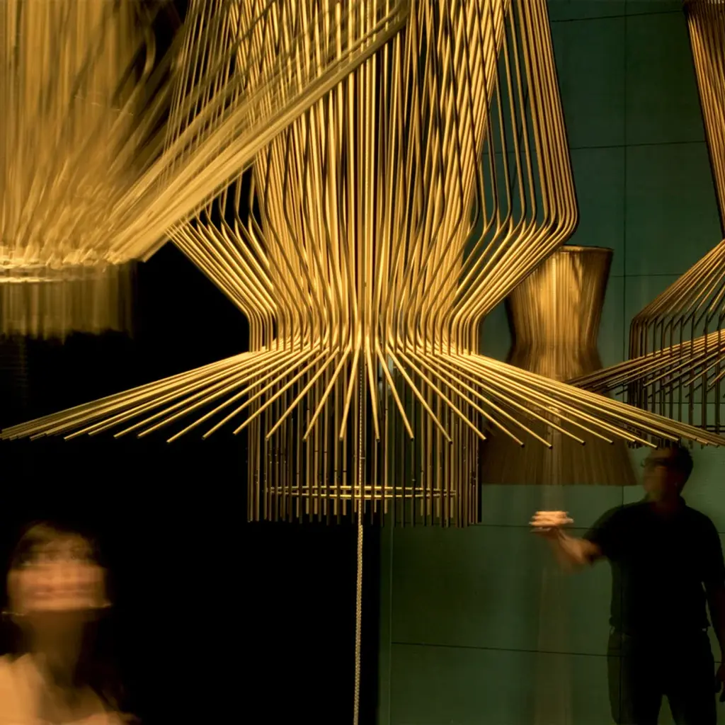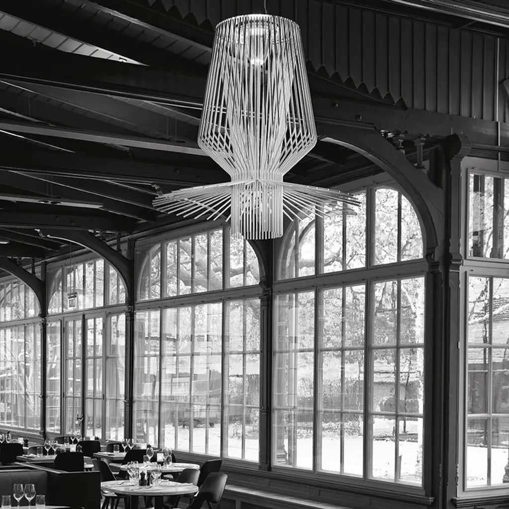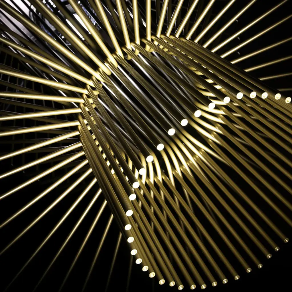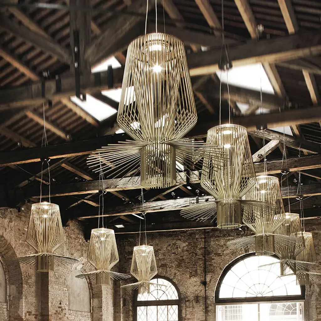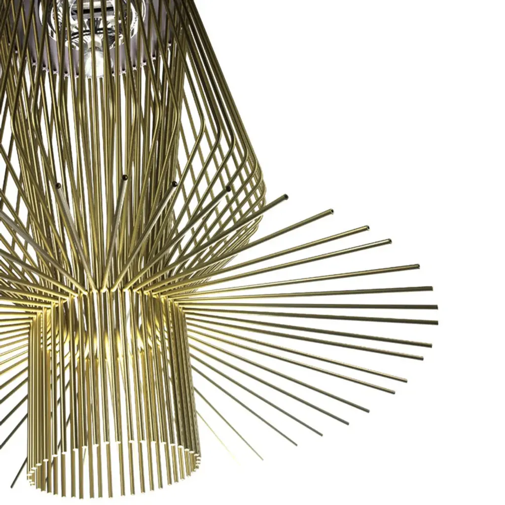 The Foscarini Allegro Assai Suspension Light is part of the Allegro family of modern pendant lights, each defined by their striking metal shapes. Composed of powder coated aluminum rods anchored to a metal frame, each Allegro pendant light has a distinct profile of sculptural beauty, and boasts a trio of metallic finishes: gold, copper and graphite. The Foscarini Allegro Assai Suspension Light is a modern lighting design of impressive size, making it a perfect choice for large public and private spaces, where its diffused downward light provides enviable nuance as it reflects attractively off the ceiling. Features