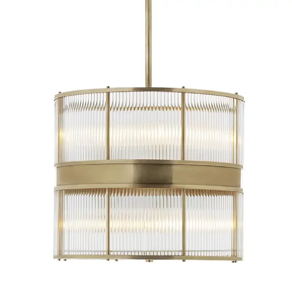 Bring an elegant modern piece to your home with the Allen Drum Pendant from Visual Comfort Signature, formerly known as Visual Comfort, Expressing universal appeal with a precise and tasteful formation of metal and glass, this piece works with a range of styles, uplifting the space with a welcoming glow. Two matching ends of glass are separated into distinct halves and sections by a wide, central metal band and thinner, vertical lines. A set of eight bulbs rest within, sending out a bright and pleasing glow that plays with the ribbed texture on the glass to create an eye-catching end result.