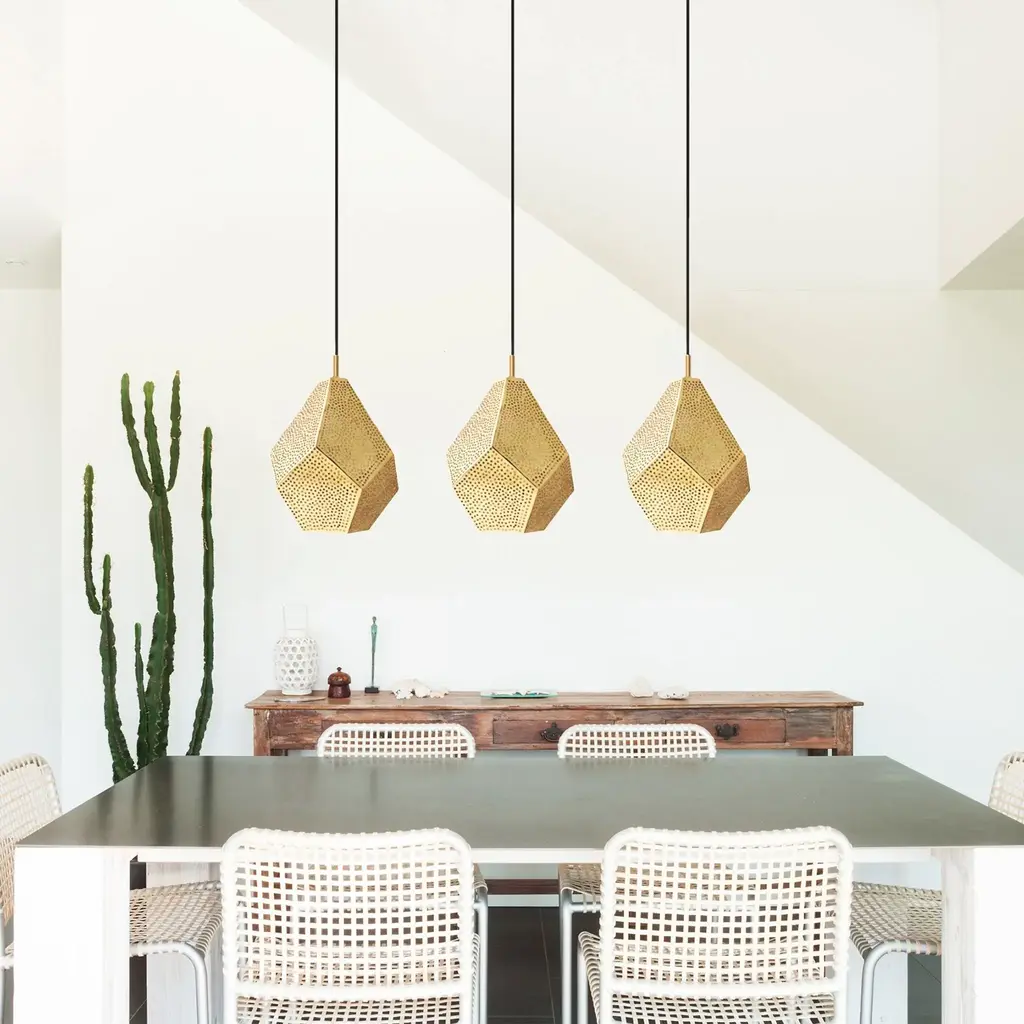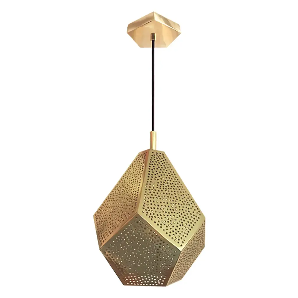 Introducing the Almas Geometric Pendant Lighting, a sleek and modern fixture that adds a touch of industrial elegance to any room. This multi-sided hanging light is named after its diamond shape, and is handcrafted in Morocco using repurposed metal. Its unique design and warm brass finish make it the perfect choice for accent lighting in a bedroom, hallway, kitchen or living room., The precise hand-pierced holes of the Almas geometric pendant light allow light to seep through and create a captivating shadow motif, making it an eye-catching addition to any space. Its versatile design is perfect for modern and industrial farmhouse styles. For a functional yet stylish addition to your bedroom, consider hanging the geometric pendant light above your bedside table. Alternatively, use it as a hanging light fixture in your living room or kitchen to create an intimate and cozy atmosphere., The geometric pendant light is UL listed and ships with a matching metal ceiling cup and adjustable cord for easy installation. Its high-quality construction and attention to detail make it a commercial and luxury grade lighting fixture that you can enjoy for years to come.