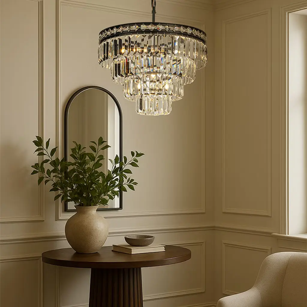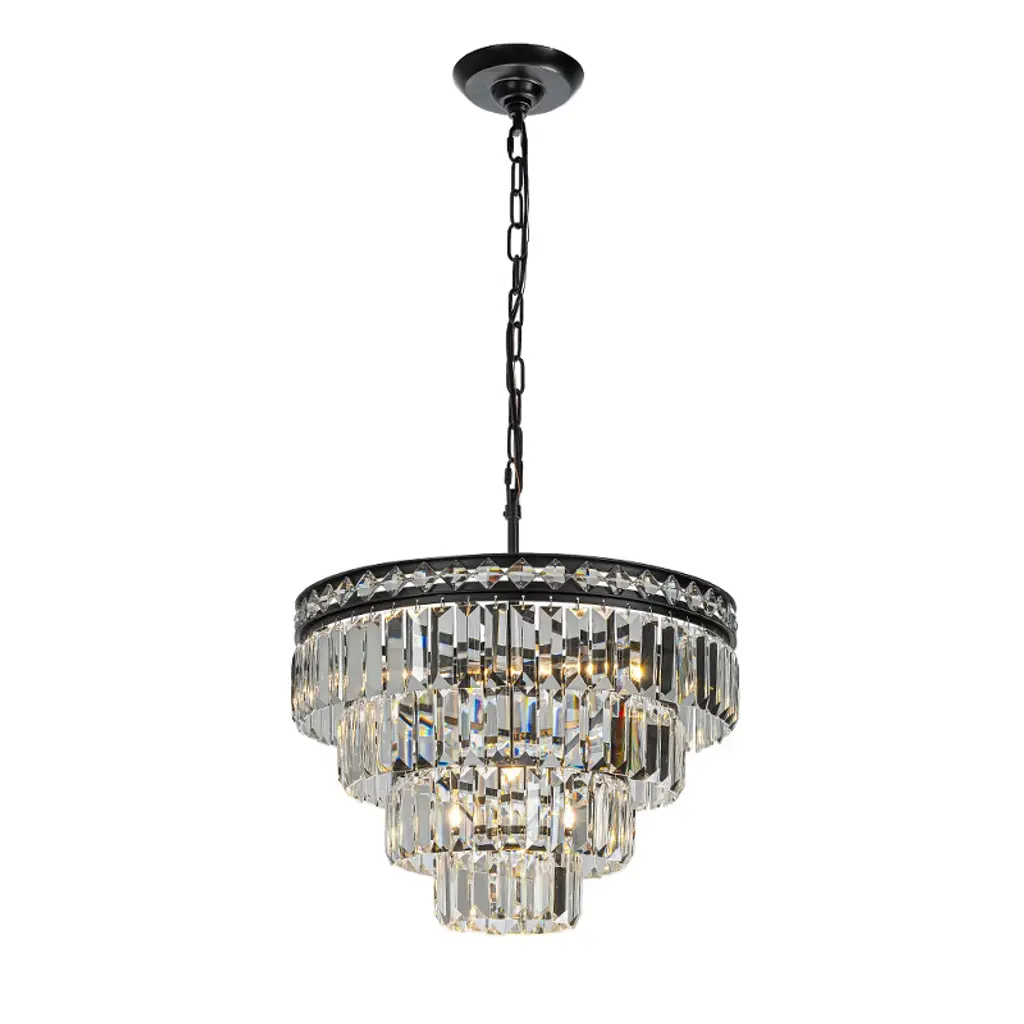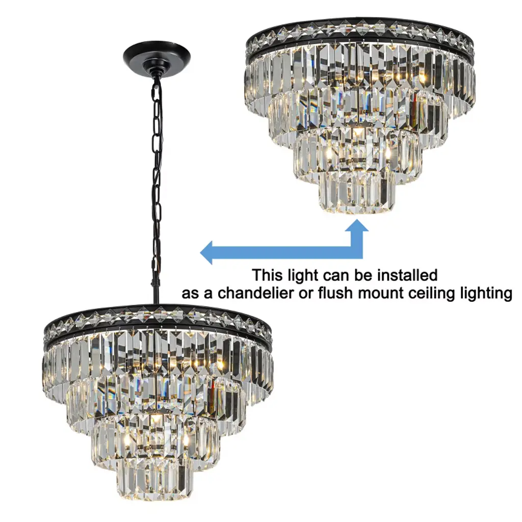 Illuminate your space with timeless elegance and dazzling brilliance. This modern crystal chandelier showcases a luxurious tiered design, featuring precision-cut rectangular crystals that capture and reflect light from every angle. Each crystal is shaped into a multi-faceted prism, expertly engineered to maximize light refraction and create a stunning rainbow sparkle. Whether the chandelier is lit or not, the clear crystal surfaces shimmer beautifully, adding a touch of glamour and sophistication to any room. The matte black metal frame provides a bold contrast and contemporary edge, making this chandelier a striking centerpiece for your dining room, foyer, entryway, bedroom, or kitchen. This modern glam chandelier is designed for flexible installation, making it ideal for both high and low ceilings. Use the adjustable chain to install it as a traditional hanging pendant light, or mount it flush to the ceiling for a more compact and streamlined look. Installation is simple with the included step-by-step manual. Compatible with four E12 base bulbs (max 40W each, not included), and dimmable when used with suitable dimmer switches and bulbs (not included), this fixture offers both beauty and function in one versatile design.