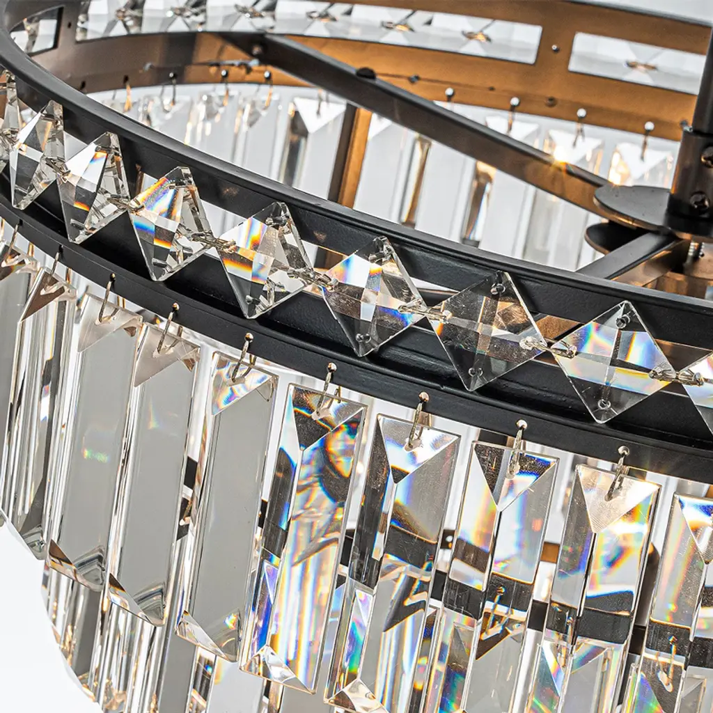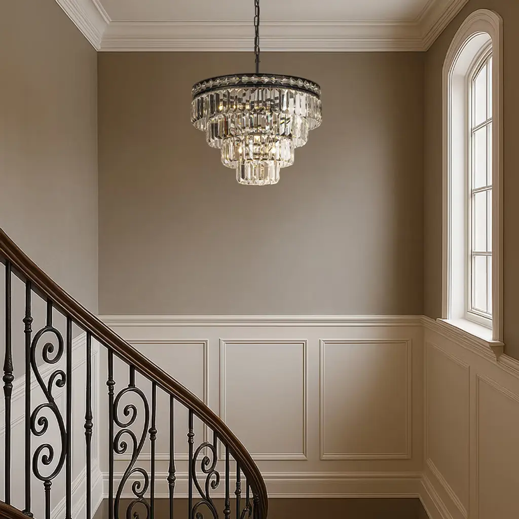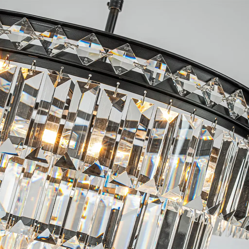 Illuminate your space with timeless elegance and dazzling brilliance. This modern crystal chandelier showcases a luxurious tiered design, featuring precision-cut rectangular crystals that capture and reflect light from every angle. Each crystal is shaped into a multi-faceted prism, expertly engineered to maximize light refraction and create a stunning rainbow sparkle. Whether the chandelier is lit or not, the clear crystal surfaces shimmer beautifully, adding a touch of glamour and sophistication to any room. The matte black metal frame provides a bold contrast and contemporary edge, making this chandelier a striking centerpiece for your dining room, foyer, entryway, bedroom, or kitchen. This modern glam chandelier is designed for flexible installation, making it ideal for both high and low ceilings. Use the adjustable chain to install it as a traditional hanging pendant light, or mount it flush to the ceiling for a more compact and streamlined look. Installation is simple with the included step-by-step manual. Compatible with four E12 base bulbs (max 40W each, not included), and dimmable when used with suitable dimmer switches and bulbs (not included), this fixture offers both beauty and function in one versatile design.
