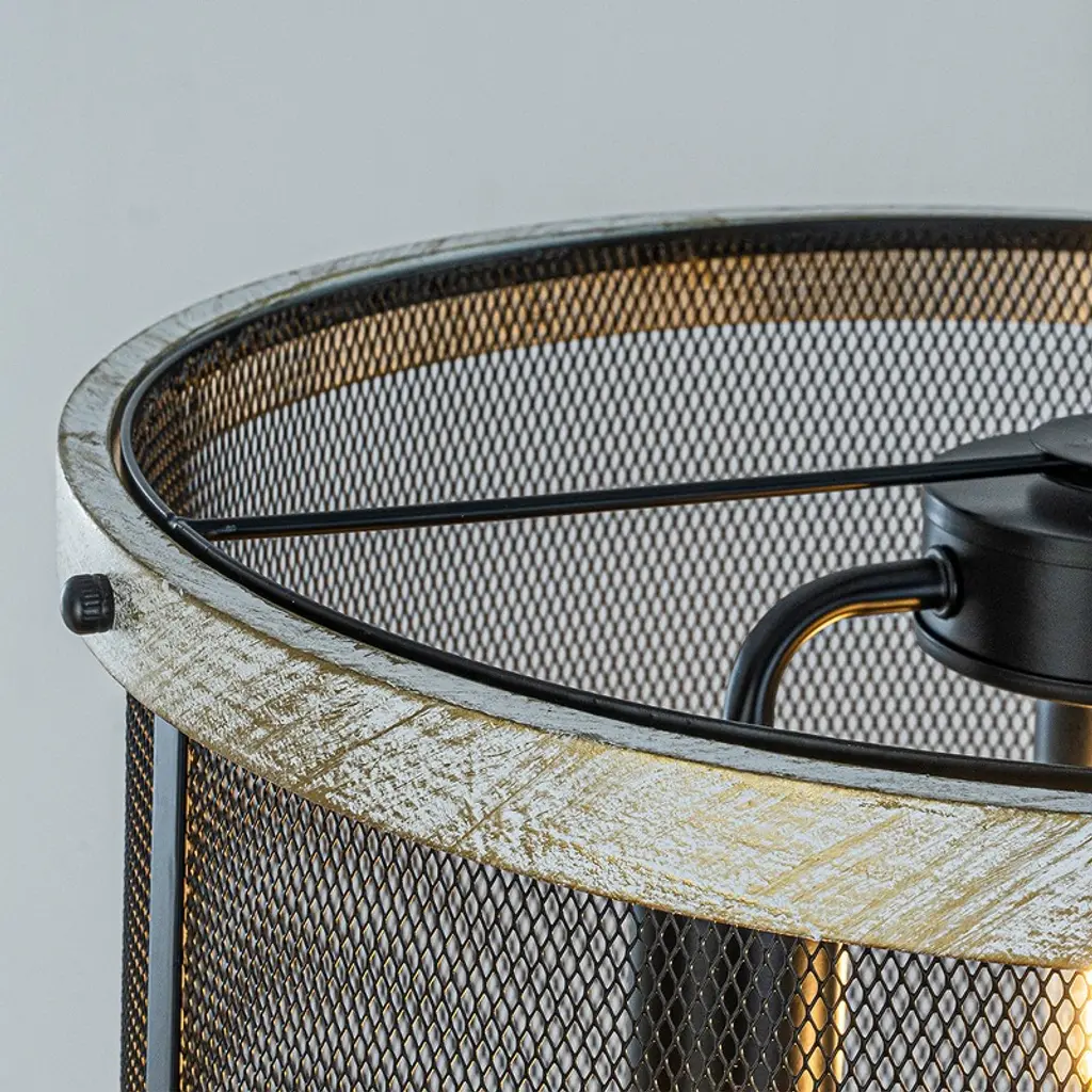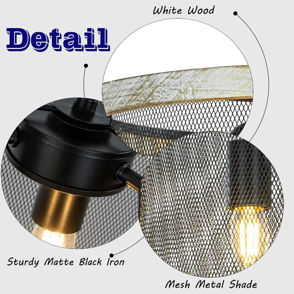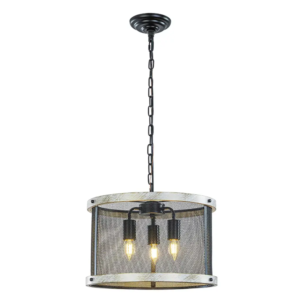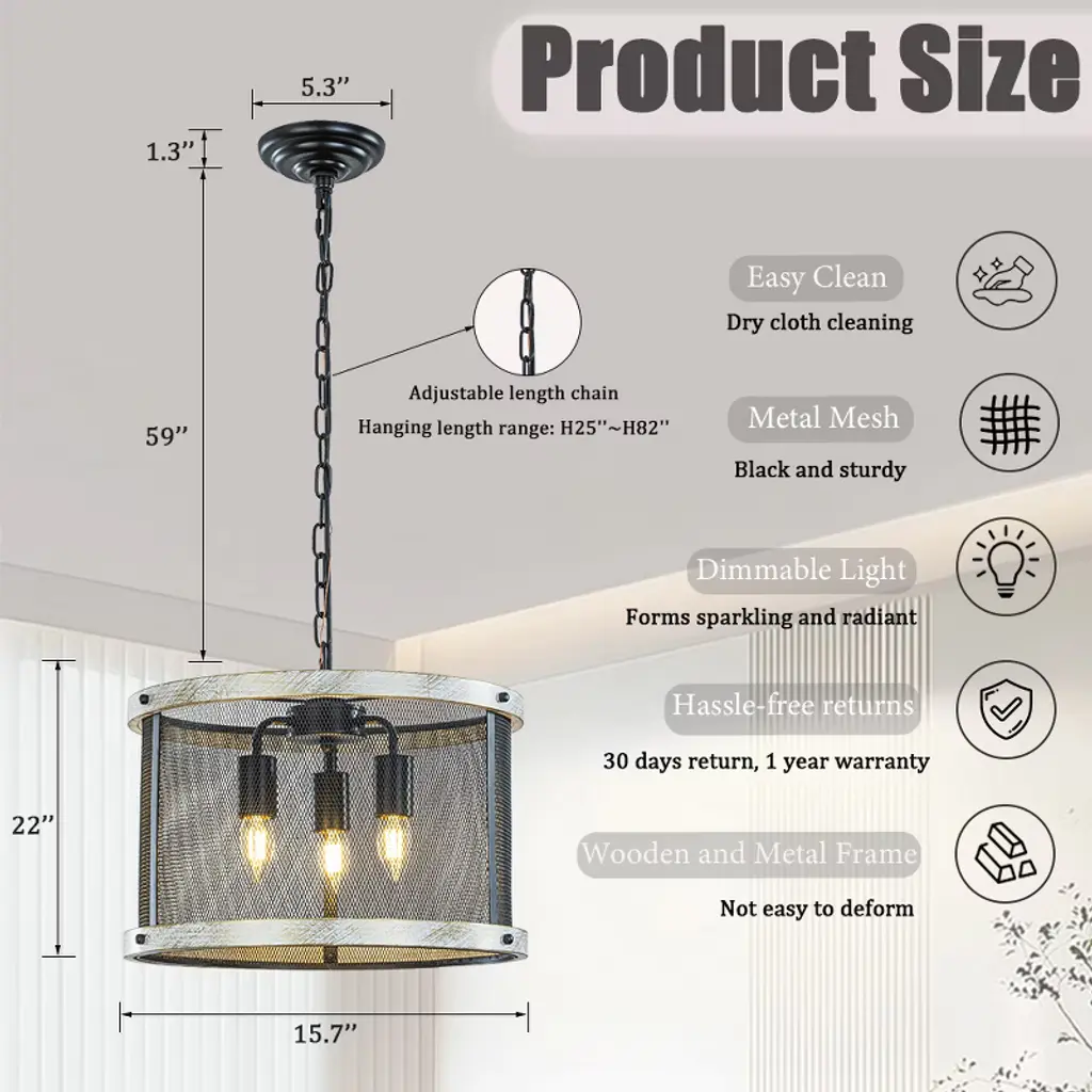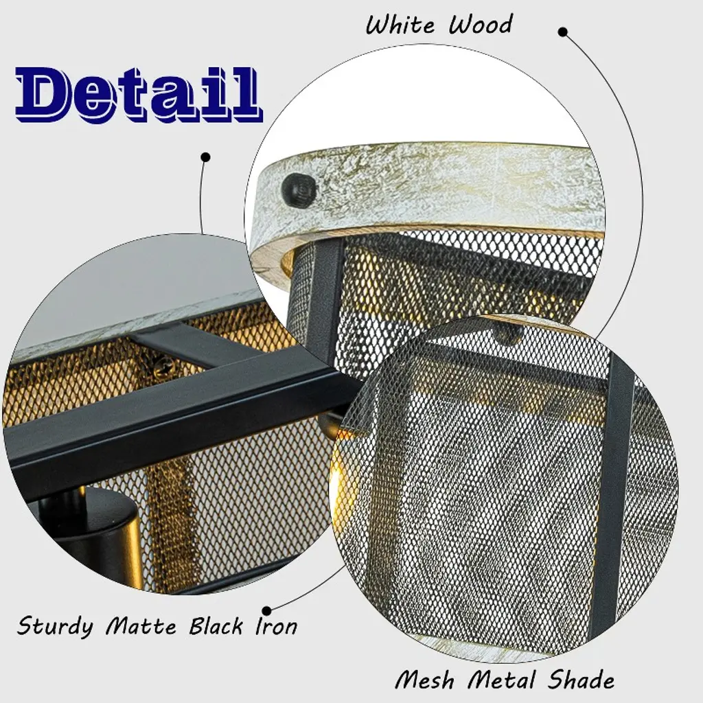 Aloadecor 3-light 16" Black Mesh And Weathered White Wood Frame Rustic Farmhouse Drum Chandelier Pendant Dining Room Industrial Chandelier