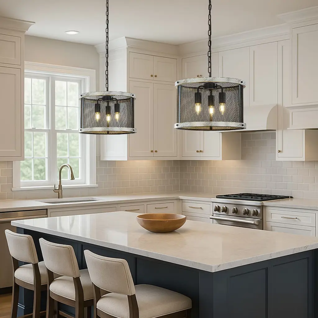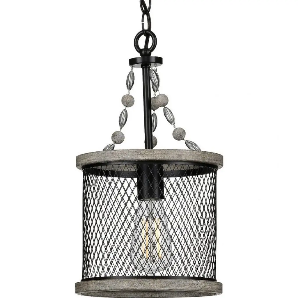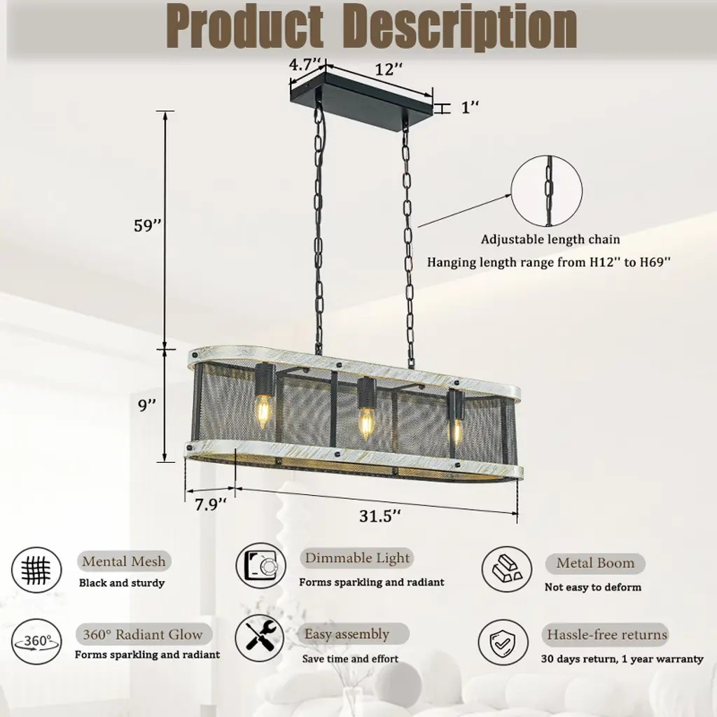 This round pendant light is ideal for your modern farmhouse, rustic kitchen, or industrial interior design. It is perfect over a small kitchen or dining table, or hang two over a kitchen island. This statement piece features a rectangular open cage crafted from solid wood with a weathered white finish, exuding a vintage-inspired aesthetic that complements various interior styles.