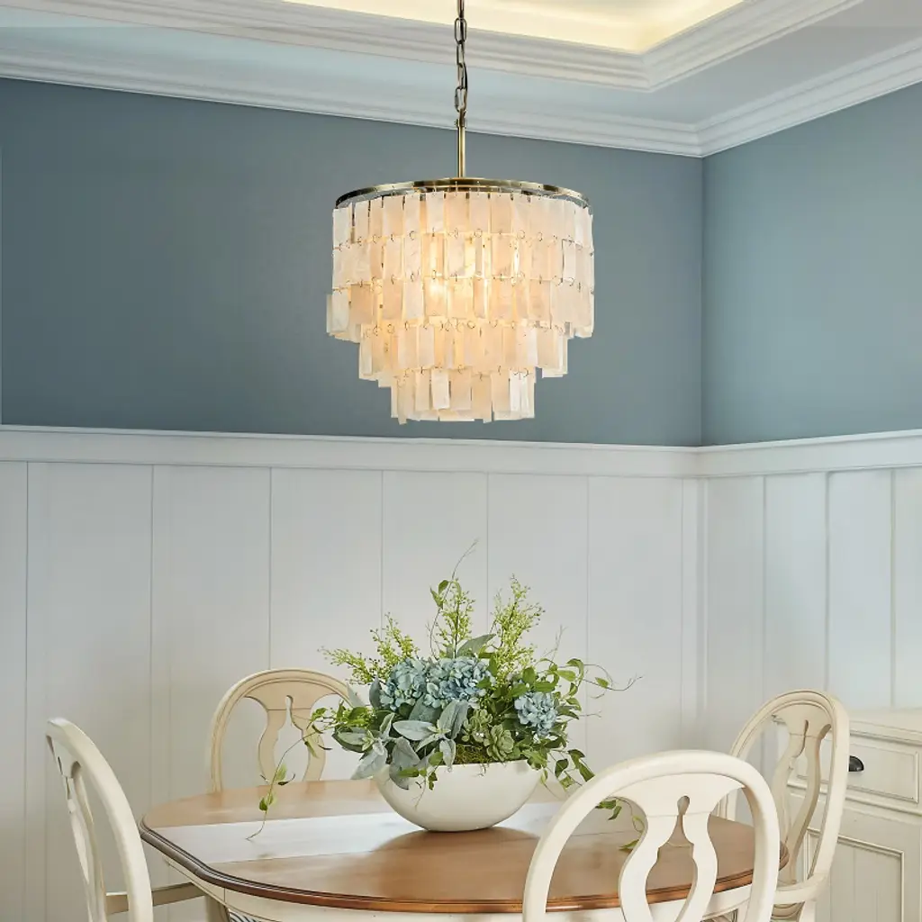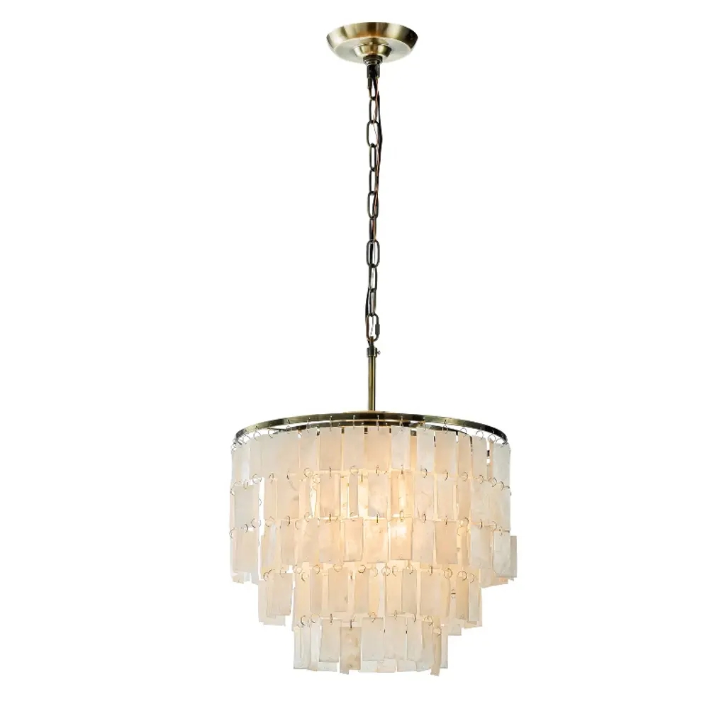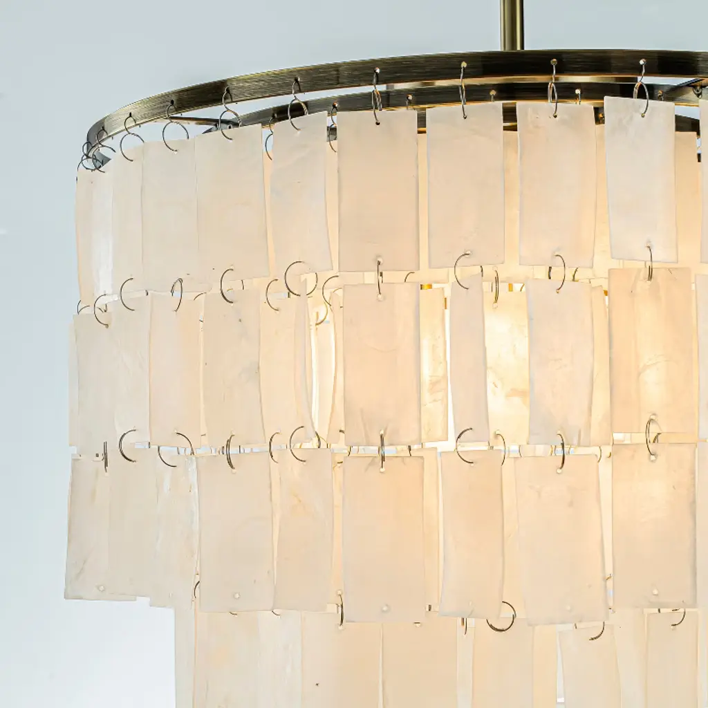Indulge in the timeless elegance of our Antique Bronze Capiz Shell Chandelier, a stunning blend of nature and sophistication. This 3-light pendant chandelier features exquisite natural capiz shells delicately suspended from an antique bronze frame, creating a captivating visual harmony. Each shell accent allows light to permeate, casting a soft, ambient glow that transforms any room into a warm and inviting sanctuary. The antique bronze finish adds a classic touch, ensuring this chandelier stands out as a piece of art even when not illuminated. Transform your space with the laid-back luxury of coastal living and the chic allure of glamorous style. Our Antique Bronze Capiz Shell Chandelier is not just a lighting fixture; it is a statement of sophisticated charm and timeless beauty. Order now and elevate your home decor.