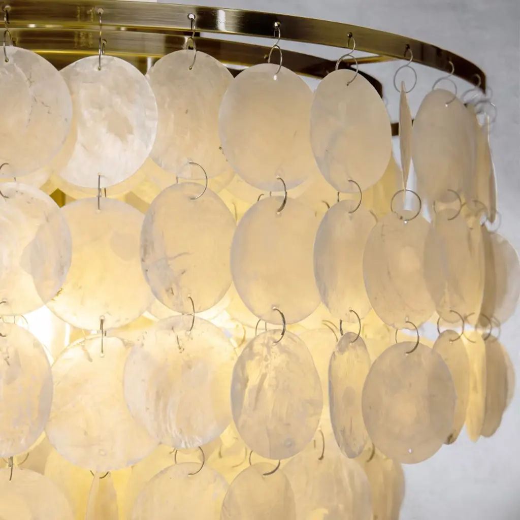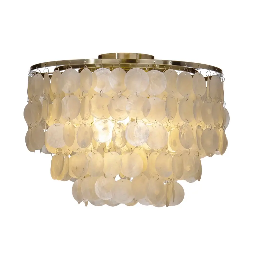 A grand unique piece that adds lustrous natural beauty to any room, our exclusive waterfall capiz flush mount ceiling lighting is composed with over 300 white capiz disc by hand, arranging the shells in flowing tiers over a antique bronze frame in a gorgeous cascade, this timeless chandelier is the perfect lighting piece for over your dining table or kitchen island. Three 40 Watt bulbs provide ample light for your space while making the shells glow at the same time.