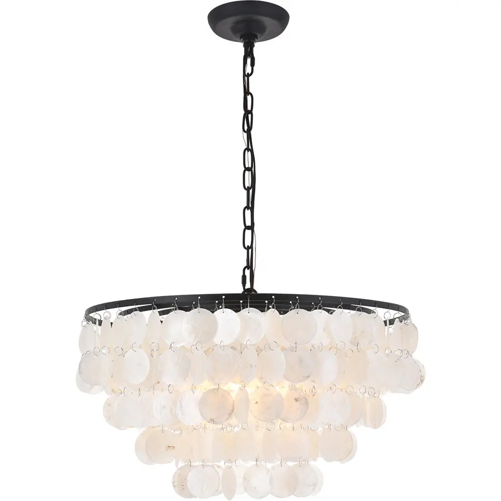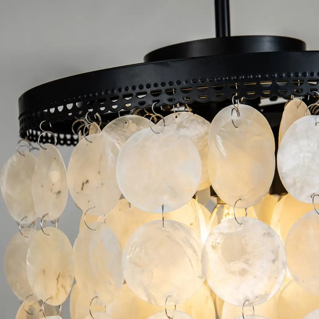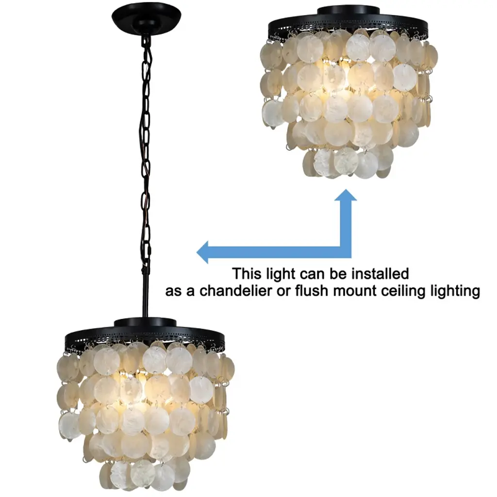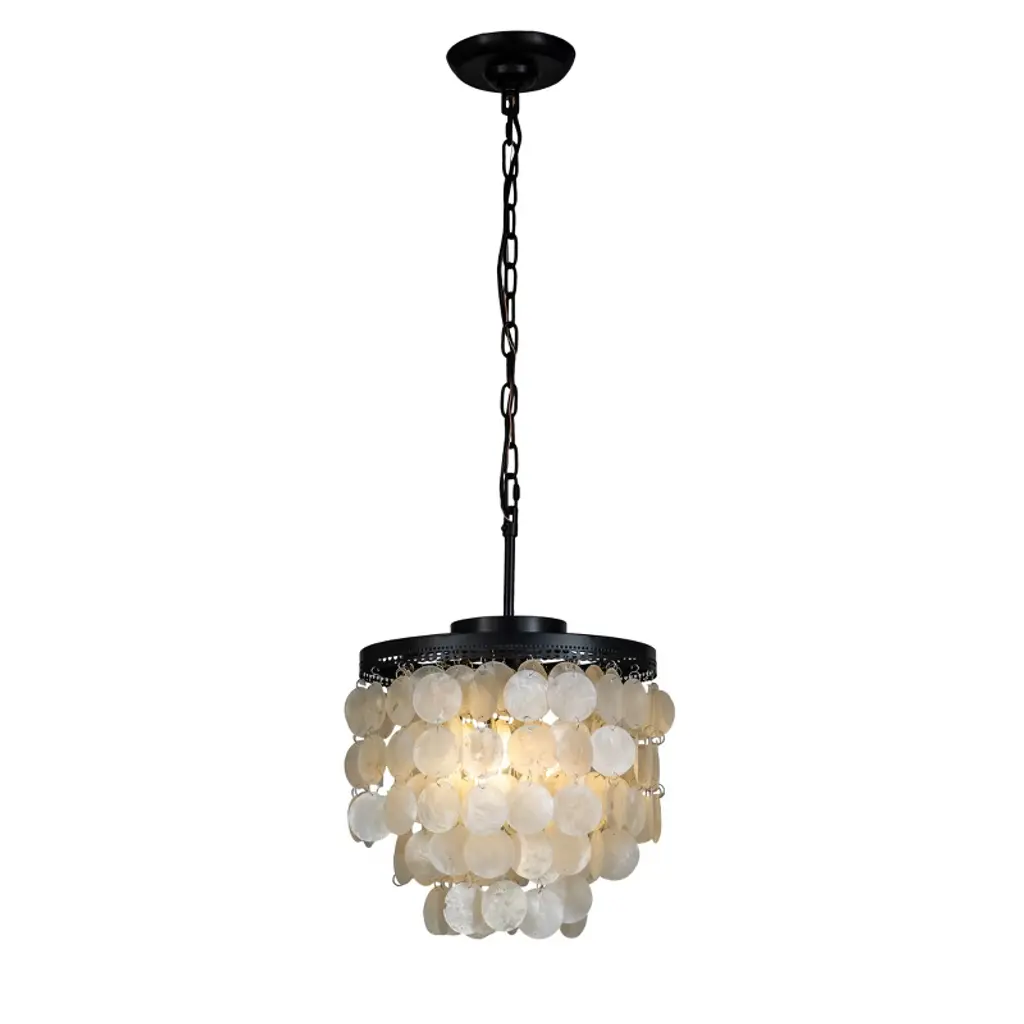 3 - Tier 13" Capiz Shell Matt Black Chandelier Coastal Indoor Coastal Pendant lamp,our exclusive shell chandelier lighting is composed with over 100 natural capiz shell, hanging the shells in a gorgeous black finish frame , this timeless chandelier is the perfect lighting for your dining room or bedroom.It is also a nice coastal decor lighting to give you a fresh feeling .