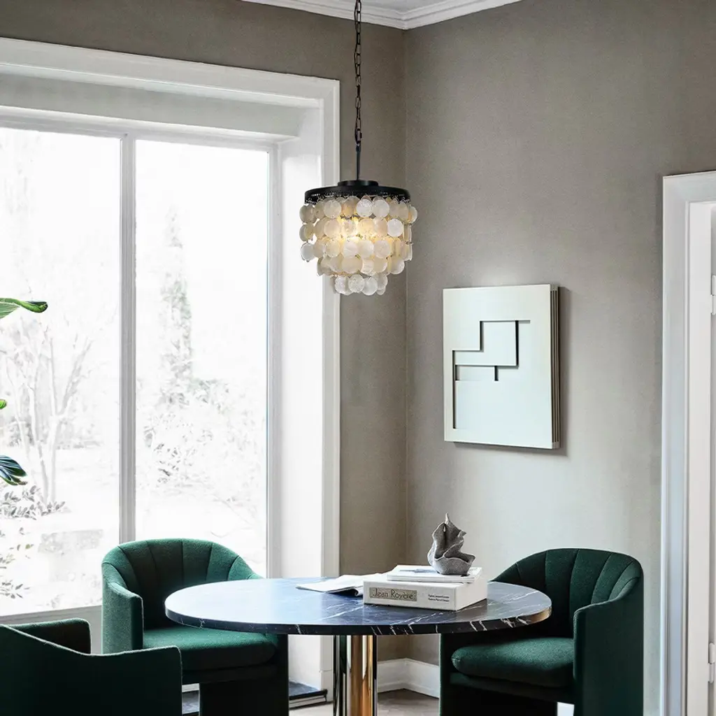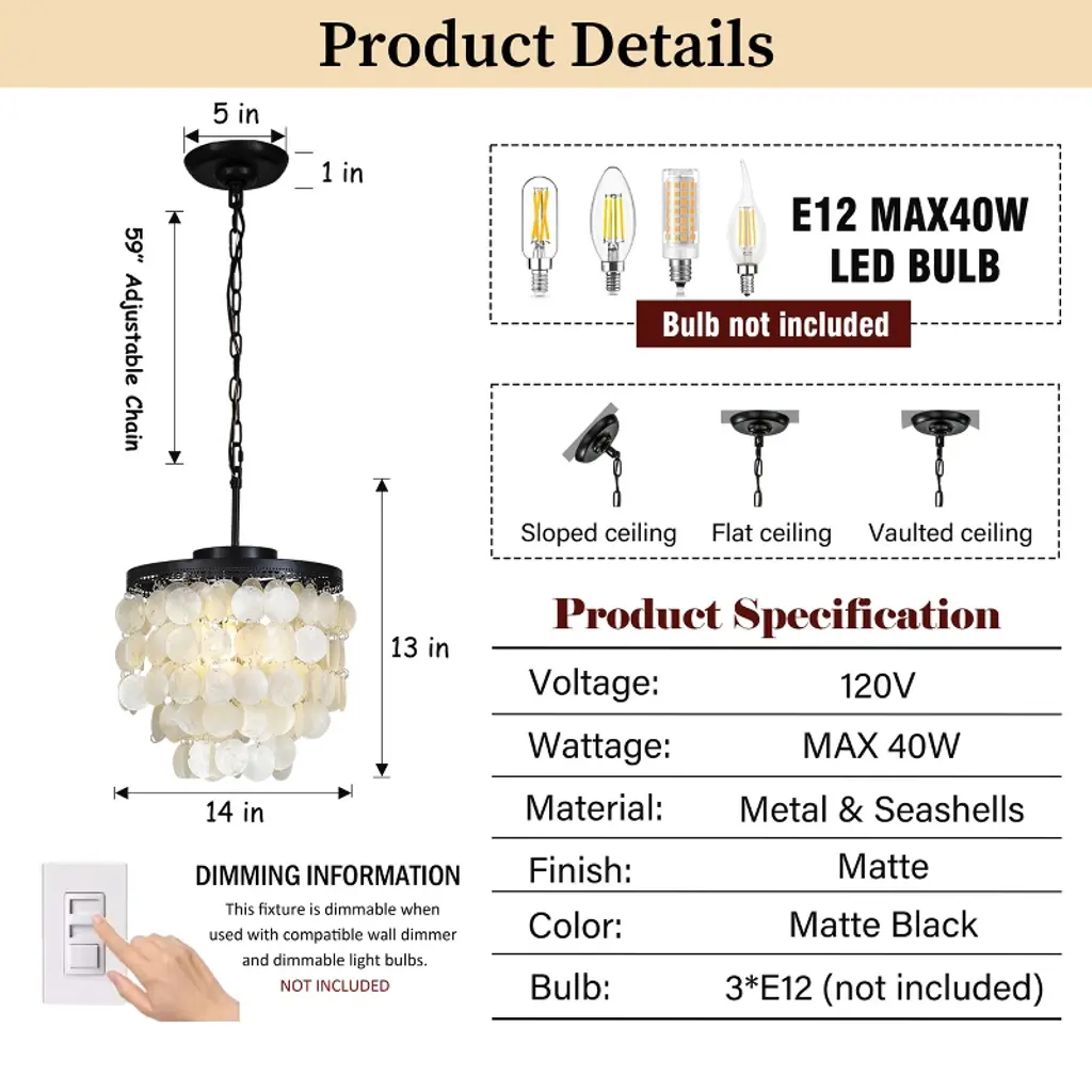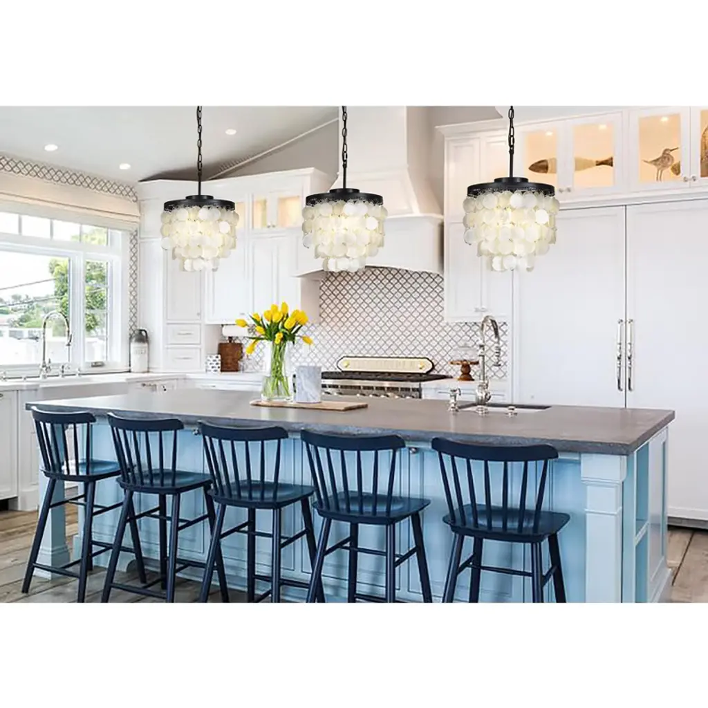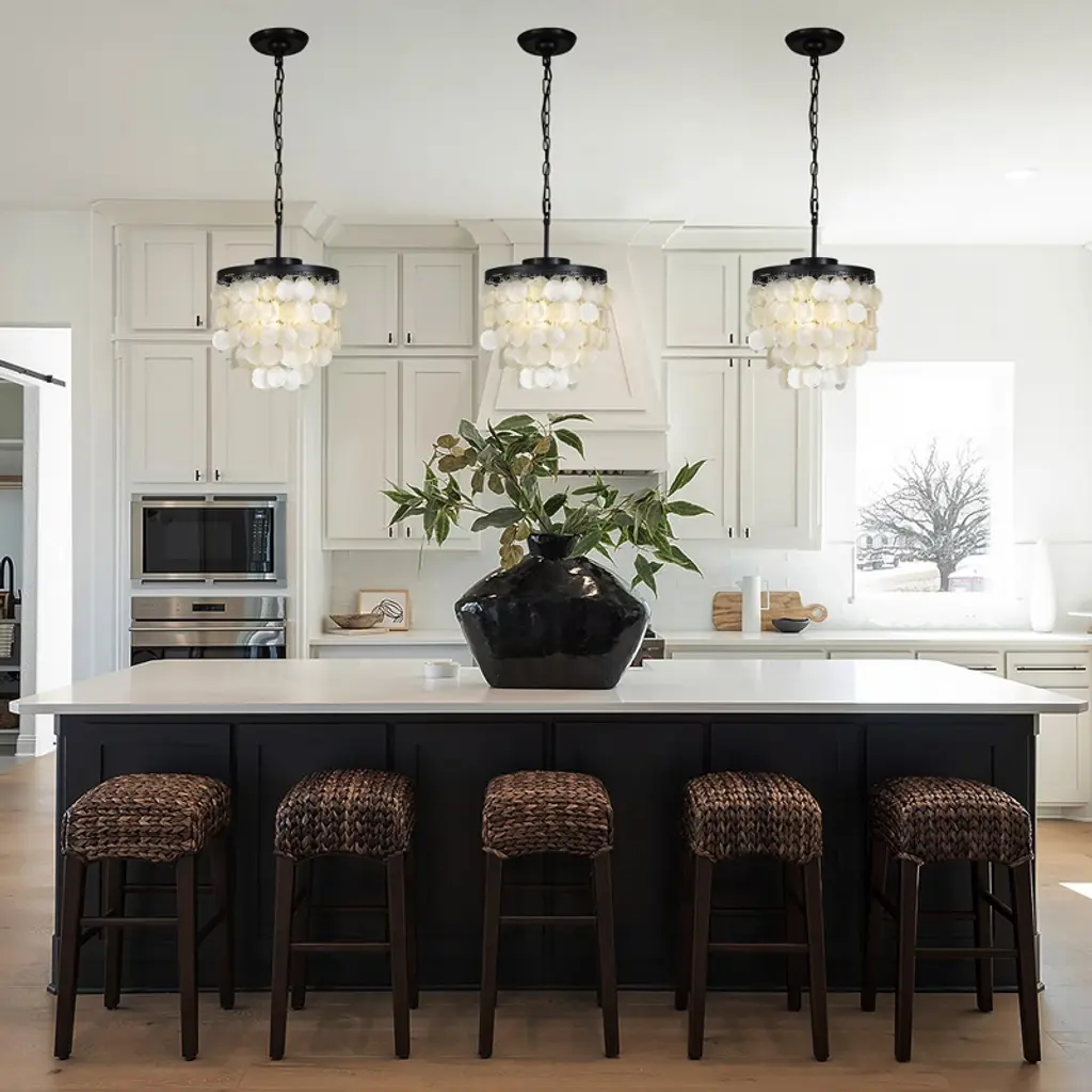 3 - Tier 13" Capiz Shell Matt Black Chandelier Coastal Indoor Coastal Pendant lamp,our exclusive shell chandelier lighting is composed with over 100 natural capiz shell, hanging the shells in a gorgeous black finish frame , this timeless chandelier is the perfect lighting for your dining room or bedroom.It is also a nice coastal decor lighting to give you a fresh feeling .
