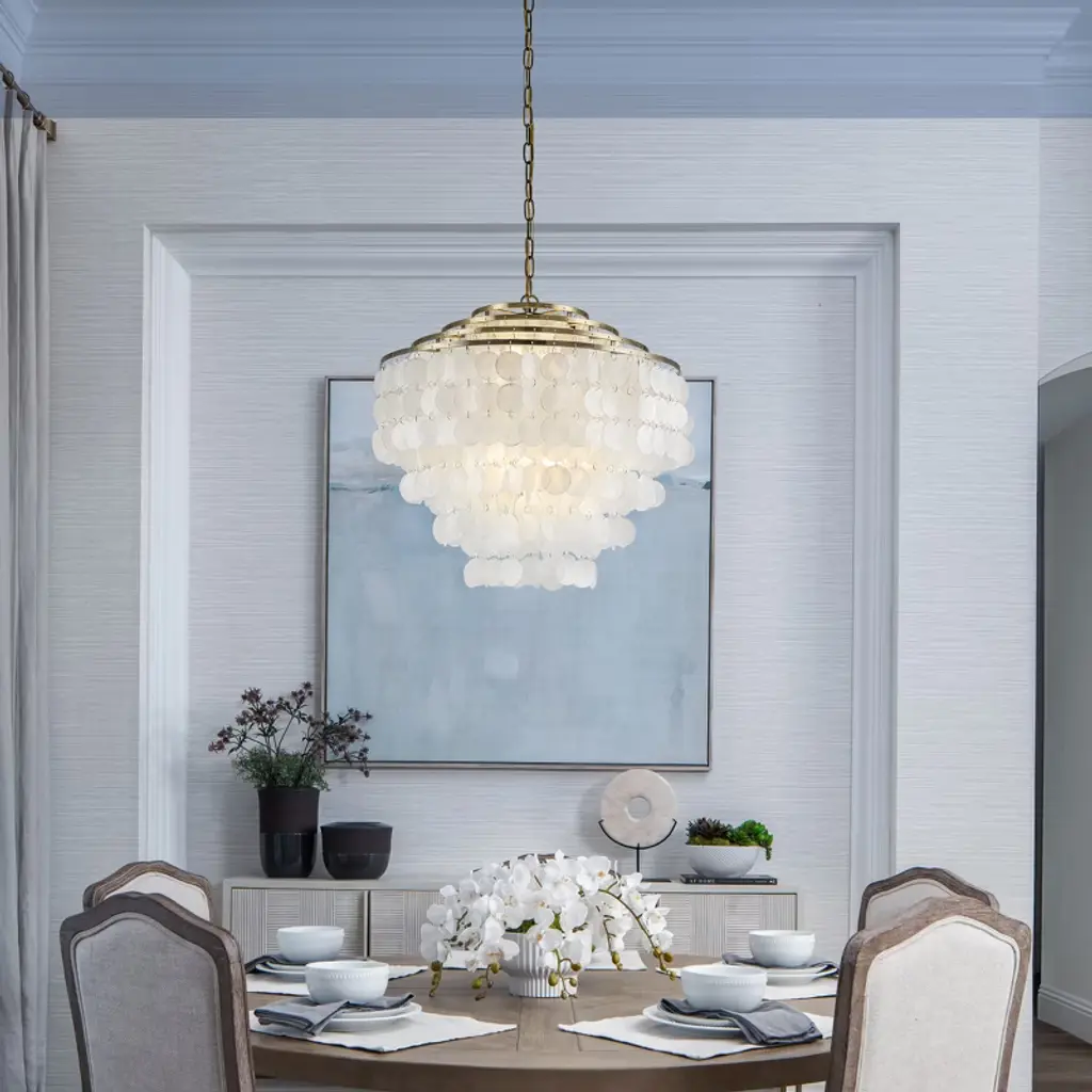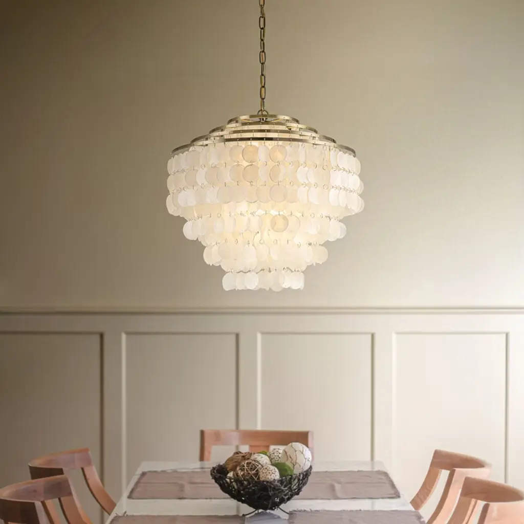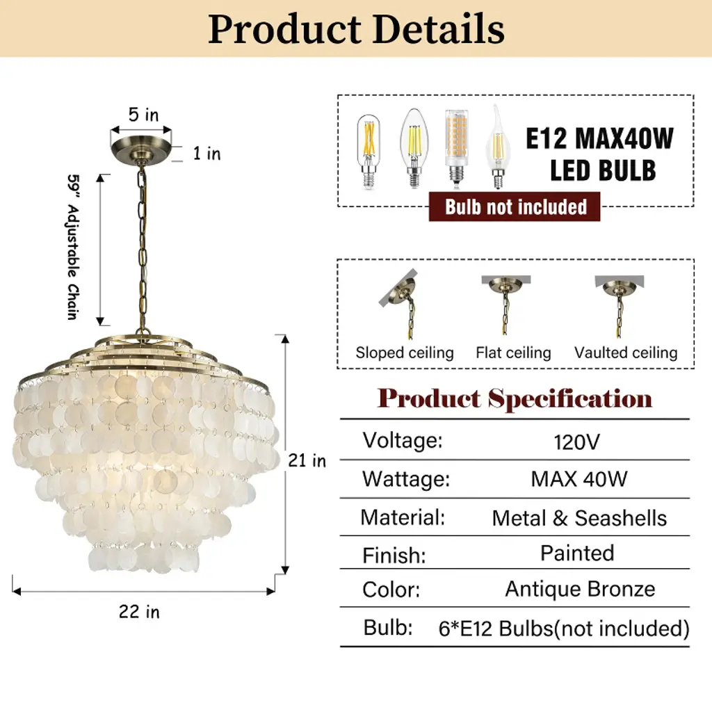 Indulge in the beauty of the ocean with our 6-Light Glam Coastal Capiz Tiered Chandelier, a stunning harmony of nature and delicacy. This chandelier features four luscious tiers of natural seashells delicately suspended from a frame that glimmers with an antique gold finish, embodying the charm of a starburst bronze frame found in our other cherished designs. Each tier boasts an array of natural seashell accents, as light permeates through the seashell shades, it casts a soft, ambient glow, creating a warm and inviting atmosphere in any room. The chandelier's structure is accentuated by an antique gold finish, offering a modern twist on the traditional bronze, ensuring it stands out as a piece of art even when not illuminated. With a cord adjustable from 27 inches to a striking 81 inches, this chandelier is adaptable to rooms of varying heights, from cozy spaces to grandiose settings. Perfect for a range of interiors, this chandelier is designed to enhance your dining room, living room, bedroom, entryway, or even a kids' room or restaurant with its exquisite beauty. Our Glam Coastal Capiz Tiered Chandelier is not just a lighting fixture; it is a statement of timeless elegance, designed to infuse your home with the laid-back luxury of coastal living and the chic allure of a glamorous lifestyle.