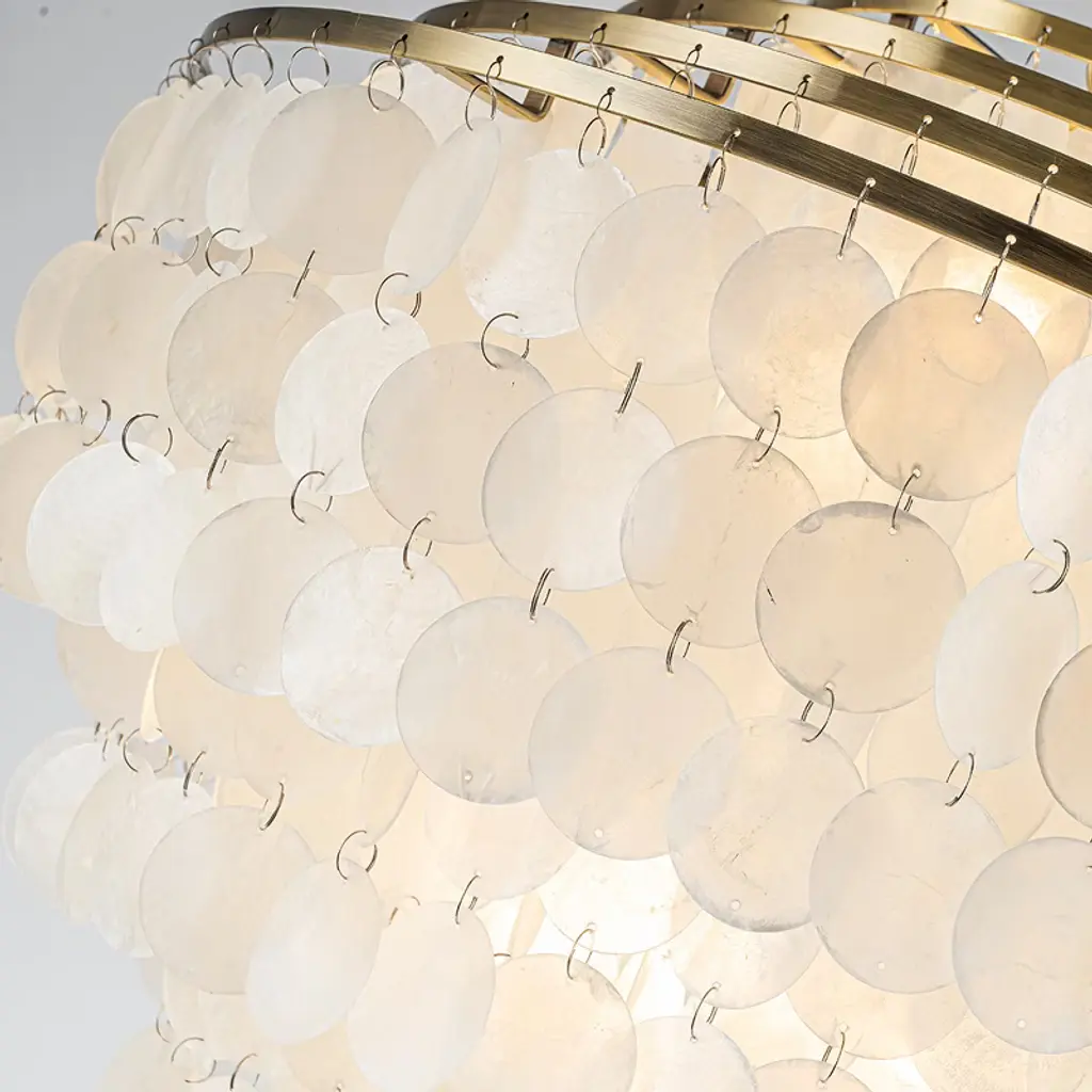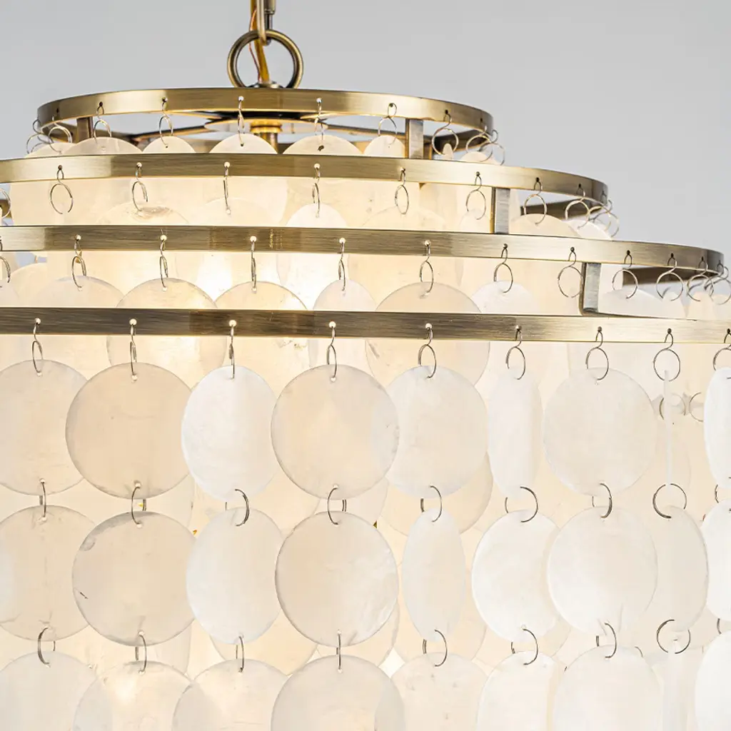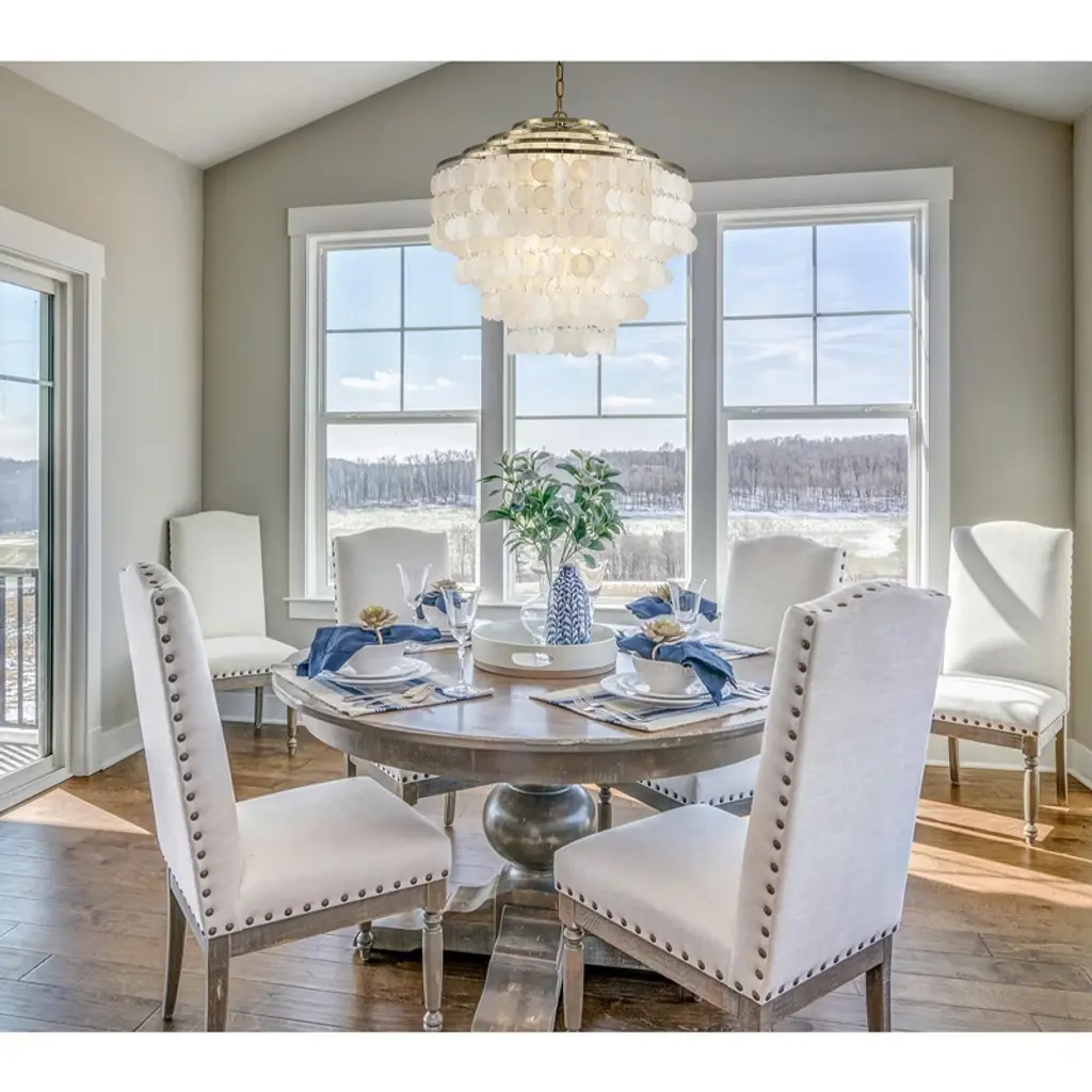Indulge in the beauty of the ocean with our 6-Light Glam Coastal Capiz Tiered Chandelier, a stunning harmony of nature and delicacy. This chandelier features four luscious tiers of natural seashells delicately suspended from a frame that glimmers with an antique gold finish, embodying the charm of a starburst bronze frame found in our other cherished designs. Each tier boasts an array of natural seashell accents, as light permeates through the seashell shades, it casts a soft, ambient glow, creating a warm and inviting atmosphere in any room. The chandelier's structure is accentuated by an antique gold finish, offering a modern twist on the traditional bronze, ensuring it stands out as a piece of art even when not illuminated. With a cord adjustable from 27 inches to a striking 81 inches, this chandelier is adaptable to rooms of varying heights, from cozy spaces to grandiose settings. Perfect for a range of interiors, this chandelier is designed to enhance your dining room, living room, bedroom, entryway, or even a kids' room or restaurant with its exquisite beauty. Our Glam Coastal Capiz Tiered Chandelier is not just a lighting fixture; it is a statement of timeless elegance, designed to infuse your home with the laid-back luxury of coastal living and the chic allure of a glamorous lifestyle.