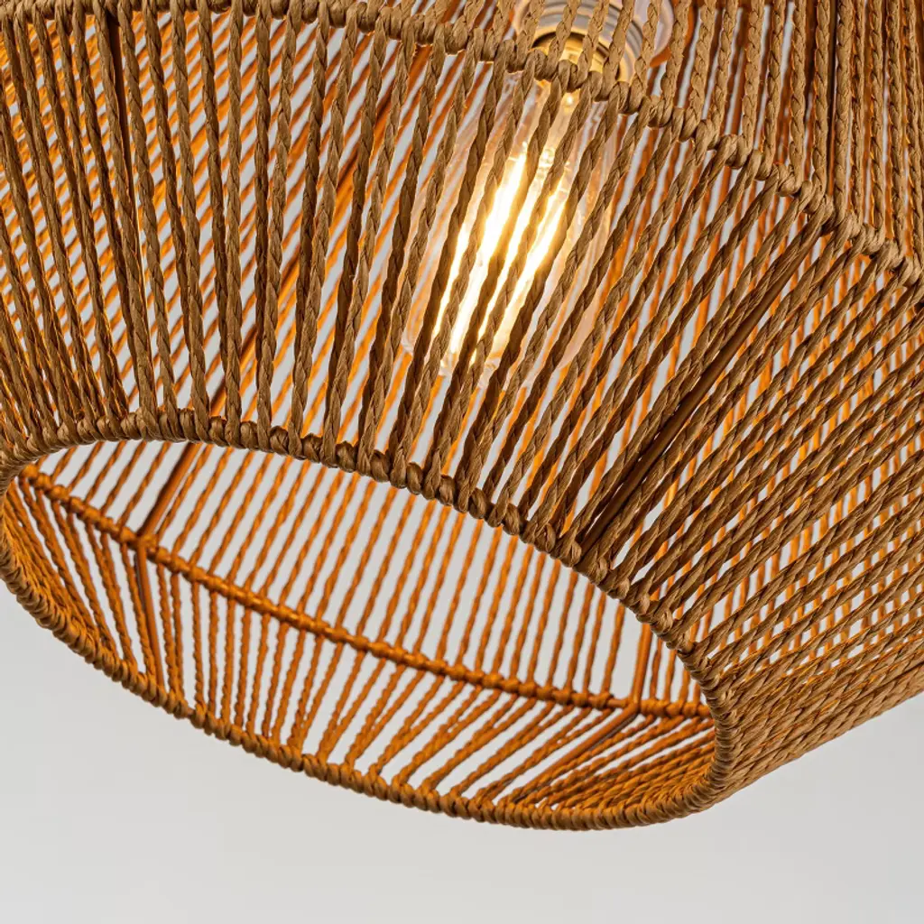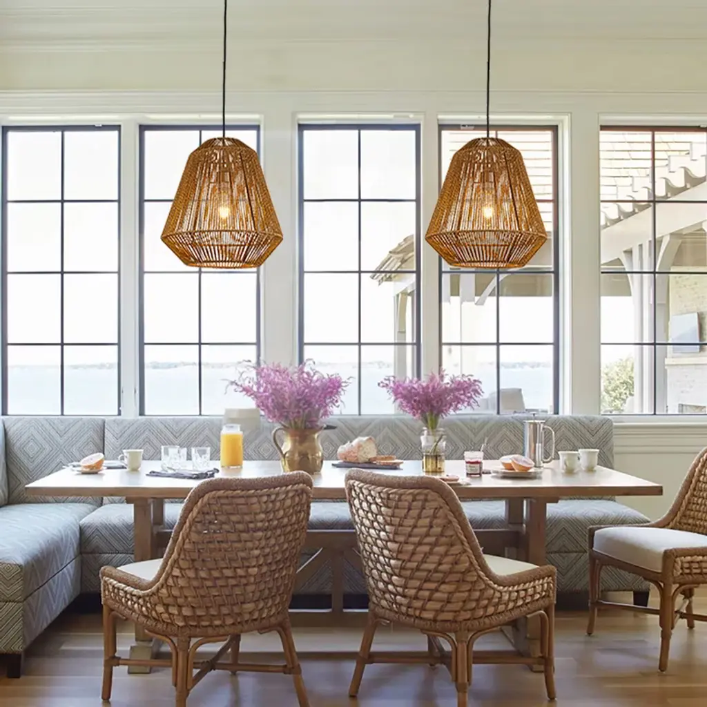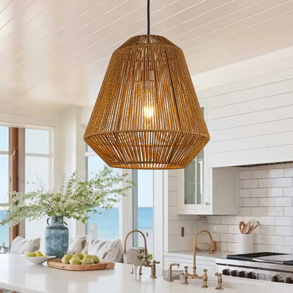 The pendant's natural aesthetic is complemented by its versatile design, which makes it a perfect match for a range of interiors. Whether your home speaks the language of rustic Farmhouse charm, breezy Coastal vibes, sleek Modern Farmhouse elegance, or eclectic Bohemian flair, this light fixture is designed to harmonize with your personal style. Each pendant is handcrafted by skilled artisans who carefully weave natural rattan into a unique lantern design. Embrace the organic appeal of the natural rattan material, which casts a warm, inviting glow. This meticulous process ensures that every piece is as authentic as it is beautiful, bringing an organic texture to your home's decor. With dimensions designed for versatility, this pendant light is an ideal choice for brightening your foyer, creating ambiance in your living room, adding character above your dining room table, complementing the casual comfort of a dinette room, or focusing attention on your kitchen island. This pendant is not just a lighting element; it's a centerpiece that stands out. The adjustable cord length allows for custom fitting in various settings, ensuring that it hangs at just the right height to capture the eye and illuminate your space. Step into a world where handcrafted design meets organic beauty with our Natural Rattan Pendant Light. Let it be more than just a light source; let it be a statement of your commitment to style, quality, and natural elegance.