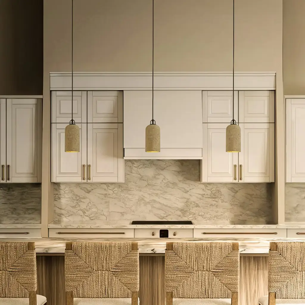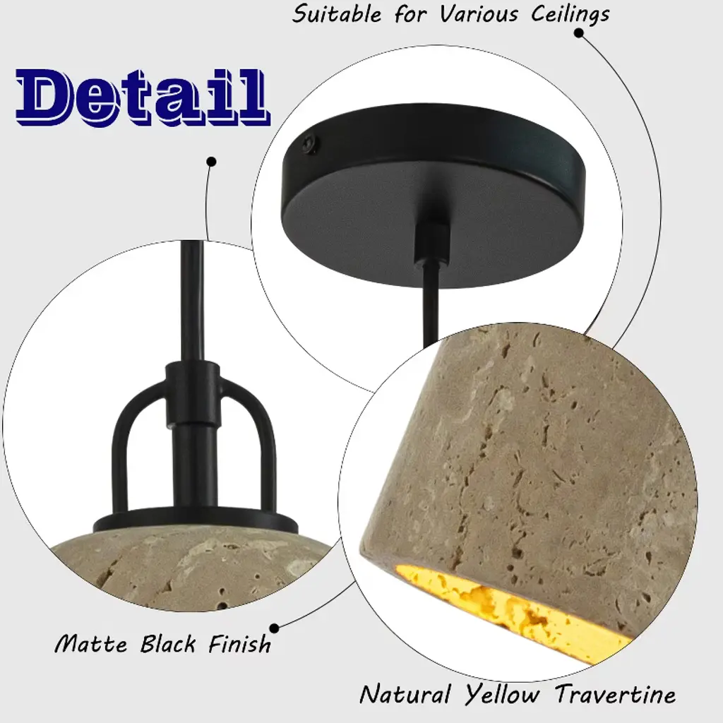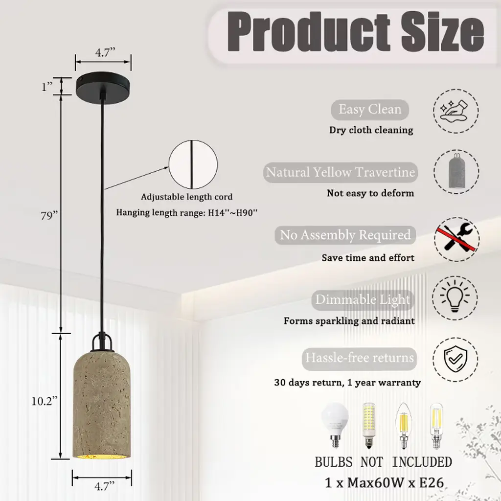 Infuse your space with natural elegance with this 2-pack of modern travertine stone pendant lights. Each pendant is crafted from hand-carved yellow travertine stone, with a cylindrical shade that highlights rich earthy textures and organic patterns-making every piece uniquely one of a kind.The matte black canopy adds a sleek contrast, perfectly balancing rustic charm with modern sophistication. With adjustable hanging lengths from 13" to 90", these pendants adapt beautifully to various ceiling heights. Use them side by side above a kitchen island, in a hallway, or over a dining table for a layered lighting effect. Whether styled together or separately, their minimalist design blends seamlessly with modern, modern farmhouse, rustic, coastal, traditional, and farmhouse interiors. Ideal for creating a warm, ambient glow in bedrooms, living rooms, or reading nooks, they're equally at home in commercial settings like boutique hotels or cafes seeking natural elegance.These fixtures are compatible with E26 base bulbs (not included) and dimmer switches, allowing you to fine-tune the lighting to fit any mood or occasion.