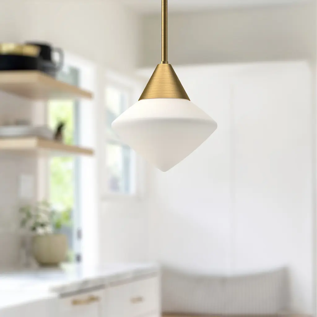 A modern take on schoolhouse fixtures adorning public spaces in the 1950s, meet the Nora collection. This collection is designed with a unique star silhouette molded from Opal Matte glass surrounded by vintage-inspired metallic elements.