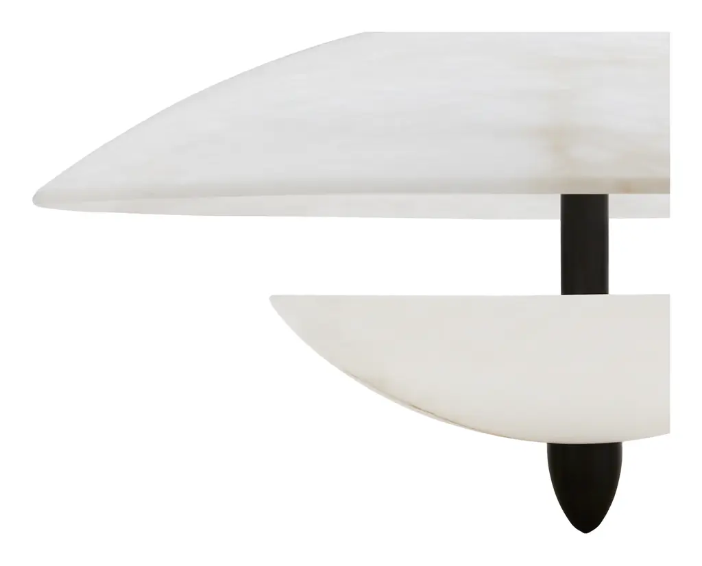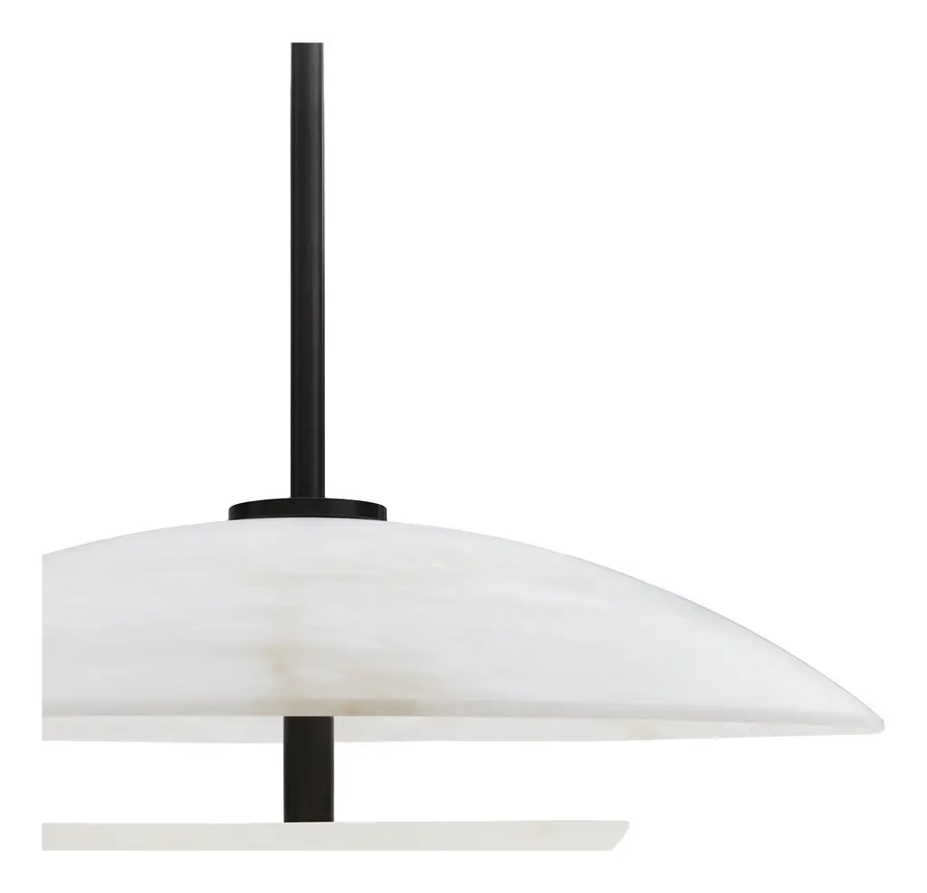 There’s no better way to say it — our Alora Pendant is just plain cool. A luxe take on mid-century space age design, Alora is comprised of two differently-sized discs crafted from gorgeous Spanish alabaster, which are suspended on a sleek, bronze-plated iron rod. This connecting piece extends into a matching bronze-plated iron hanging rod, which can be adjusted to control Alora’s drop from the ceiling to suit your space. Sure to turn heads wherever it hangs, it’s the perfect finishing touch for any sophisticated, modern home, whether it’s casting its glow on an entryway, kitchen island or chic powder room. •spanish alabaster•bronze-plated iron•adjustable bronze hanging rod•requires 40W max/type E14 bulb x 3•hardwire •professional installation required•each is unique; variations in color and veining of natural stone should be expected Dimensions•13" diameter x 27.5"H•canopy: 8" diameter x 1.5"H•hanging rods: 11.75" long, 19.5" long, 27.5" long; 59" long total •40 lbs