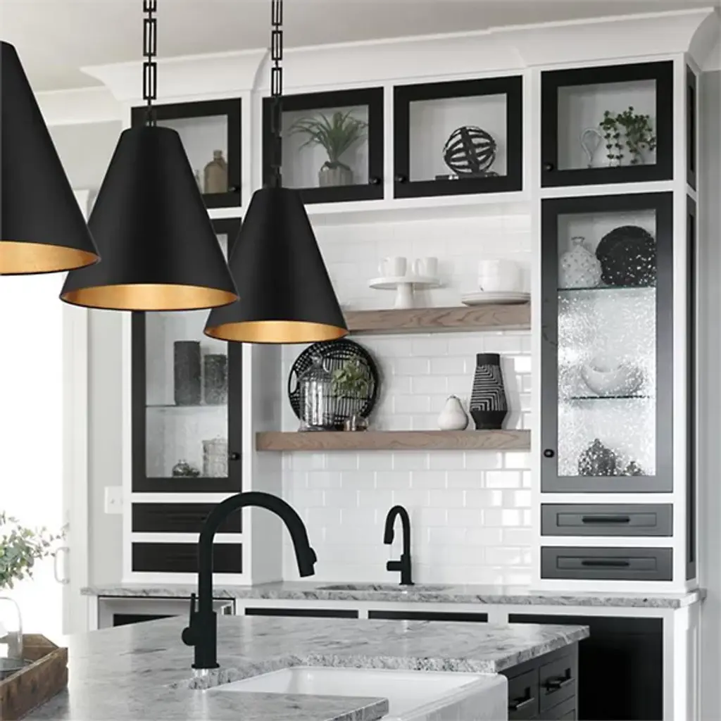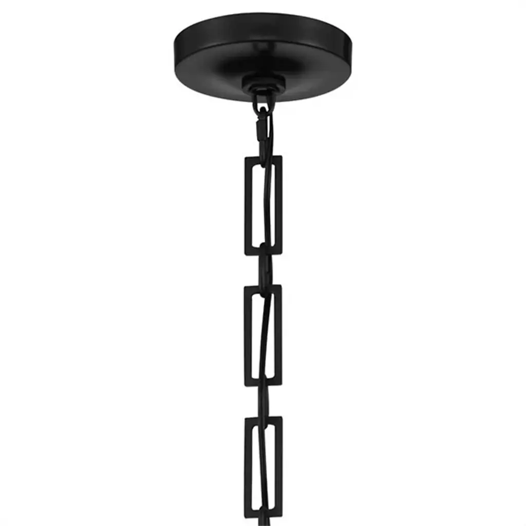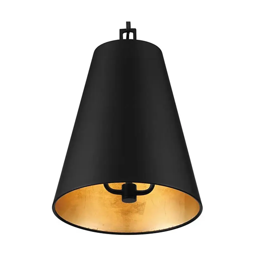 Bold style and brilliant light comprise the Alston Pendant by Crystorama. This modern fixture drops from a rounded ceiling mount to a geometric linked chain that gives the piece its signature aesthetic. A conical metal shade is suspended below, surrounding a set of three bulbs that produce a pleasant downward glow. A painted interior finish warms its light while reflecting it, offering a contrasting visual accent and modern flair.