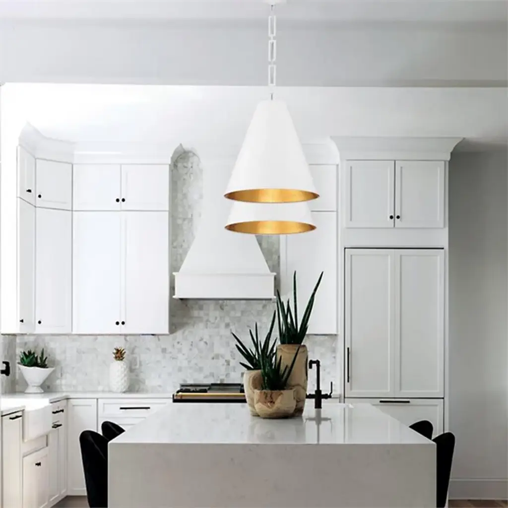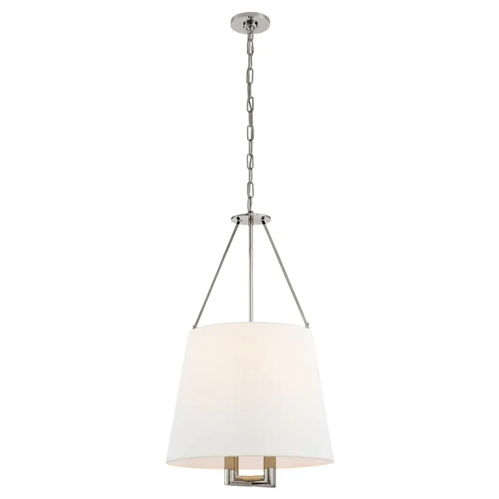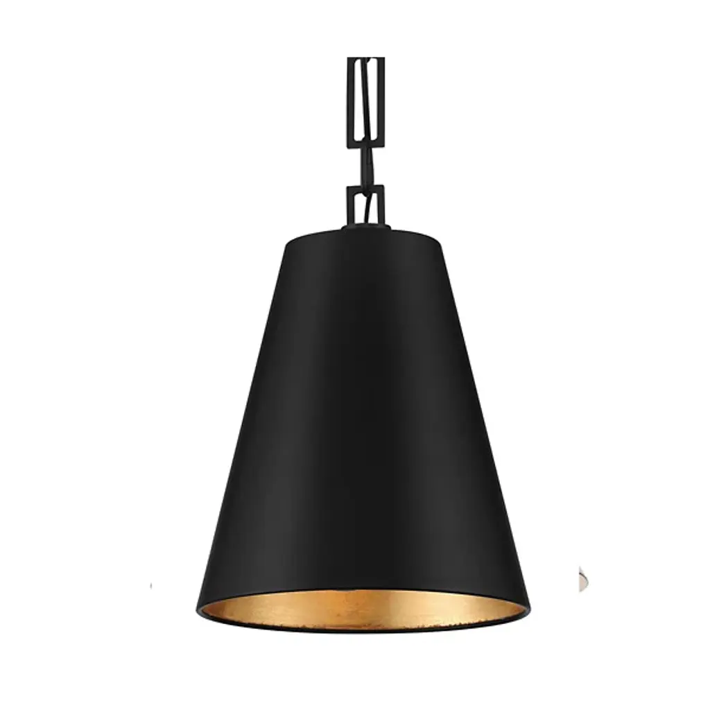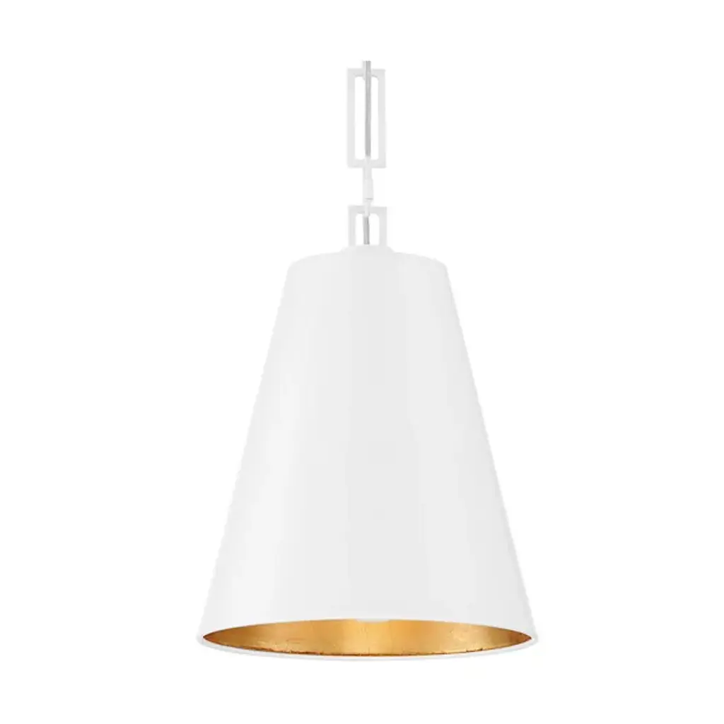 Bold style and brilliant light comprise the Alston Pendant by Crystorama. This modern fixture drops from a rounded ceiling mount to a geometric linked chain that gives the piece its signature aesthetic. A conical metal shade is suspended below, surrounding a set of three bulbs that produce a pleasant downward glow. A painted interior finish warms its light while reflecting it, offering a contrasting visual accent and modern flair.