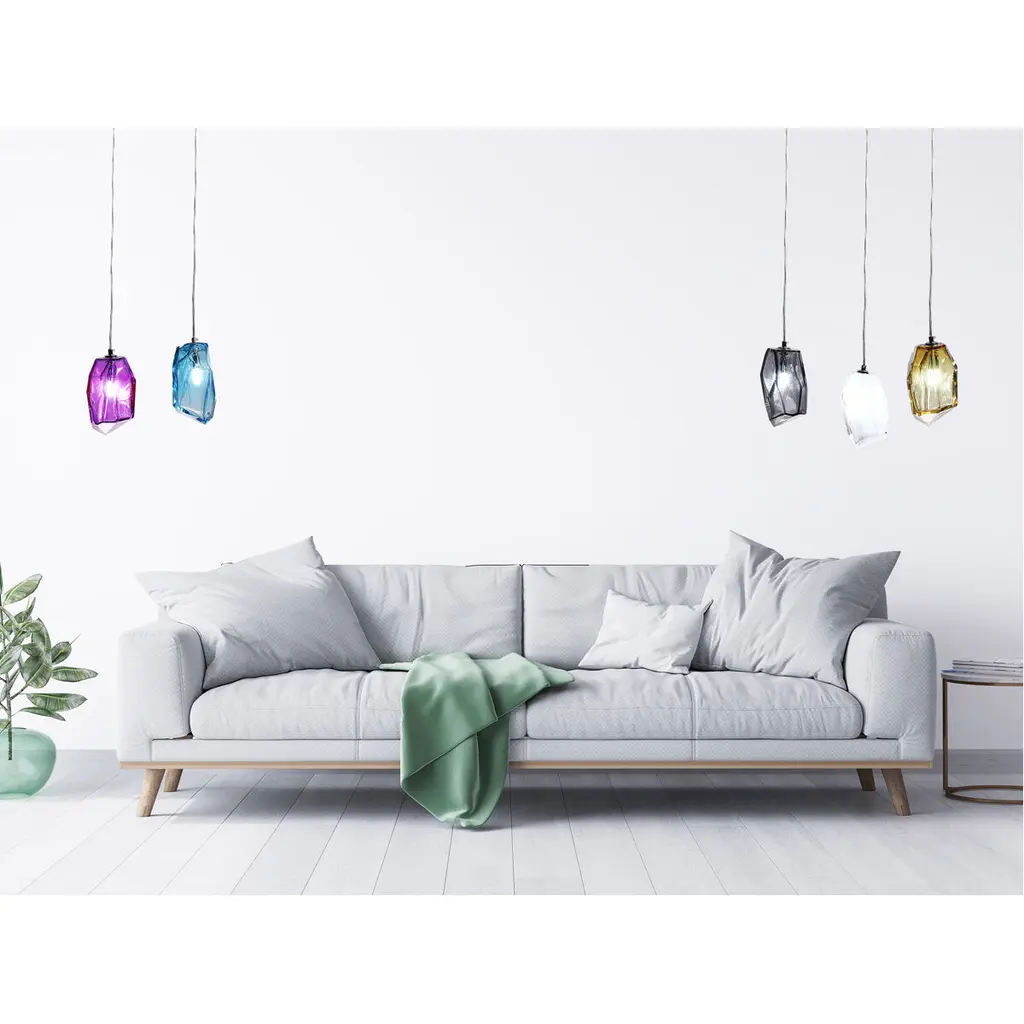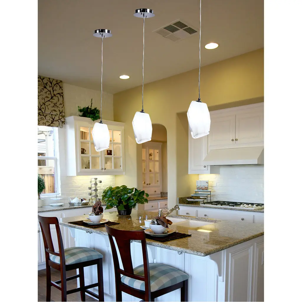 Always at the cutting edge of home design trends, we are pleased to present our Altair White Handcrafted Art Glass Mini Pendant. The breathtaking fixture features a jewel shaped shade with irregular edges in crisp bright white that is crafted using Favrile art glass first developed by L.C. Tiffany. Favrile glass is crafted by embedding the color within the glass itself. This handcrafting can cause variations in color, size, and texture, which means that no 2 pieces are exactly alike. The pendant hangs from a round metal ceiling canopy and wire tube that are finished in lustrous Polished Chrome to enhance the jewel like beauty of the glass. The hanging cord can be adjusted for height. An innovative way to illuminate a bar, breakfast nook or island, try hanging our Altair White Handcrafted Art Glass Mini Pendant in multiples (and multiple colors) for an up to the minute look your family and friends will enjoy for years to come. NOTE: Due to the nature of handmade art glass, colors, sizes and patterns may vary slightly.