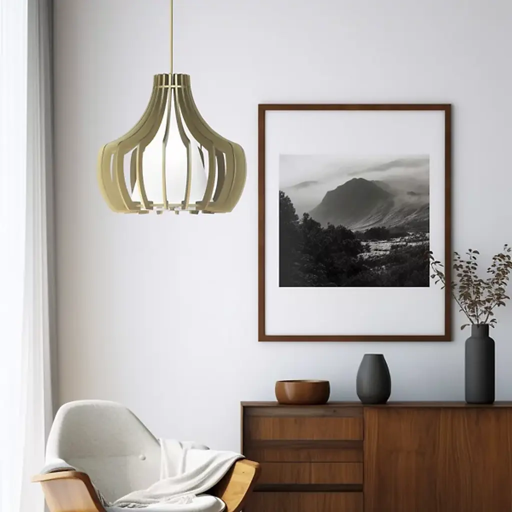 Unique, elegant, and endearing. The Aly Pendant from Seascape Lamps offers an entrancing, layered design that dispatches arcing ribs of birch plywood down around a conical linen shade. Made in the USA, it’s a simple fixture in its design conception, descending from a disc canopy and placing potent lamping inside both shades. The slim curves of the birch wood highlight the textured linen within, enhancing the ambient glow with slender shadows while a pool of direct downlight pours out below the fixture unabated.