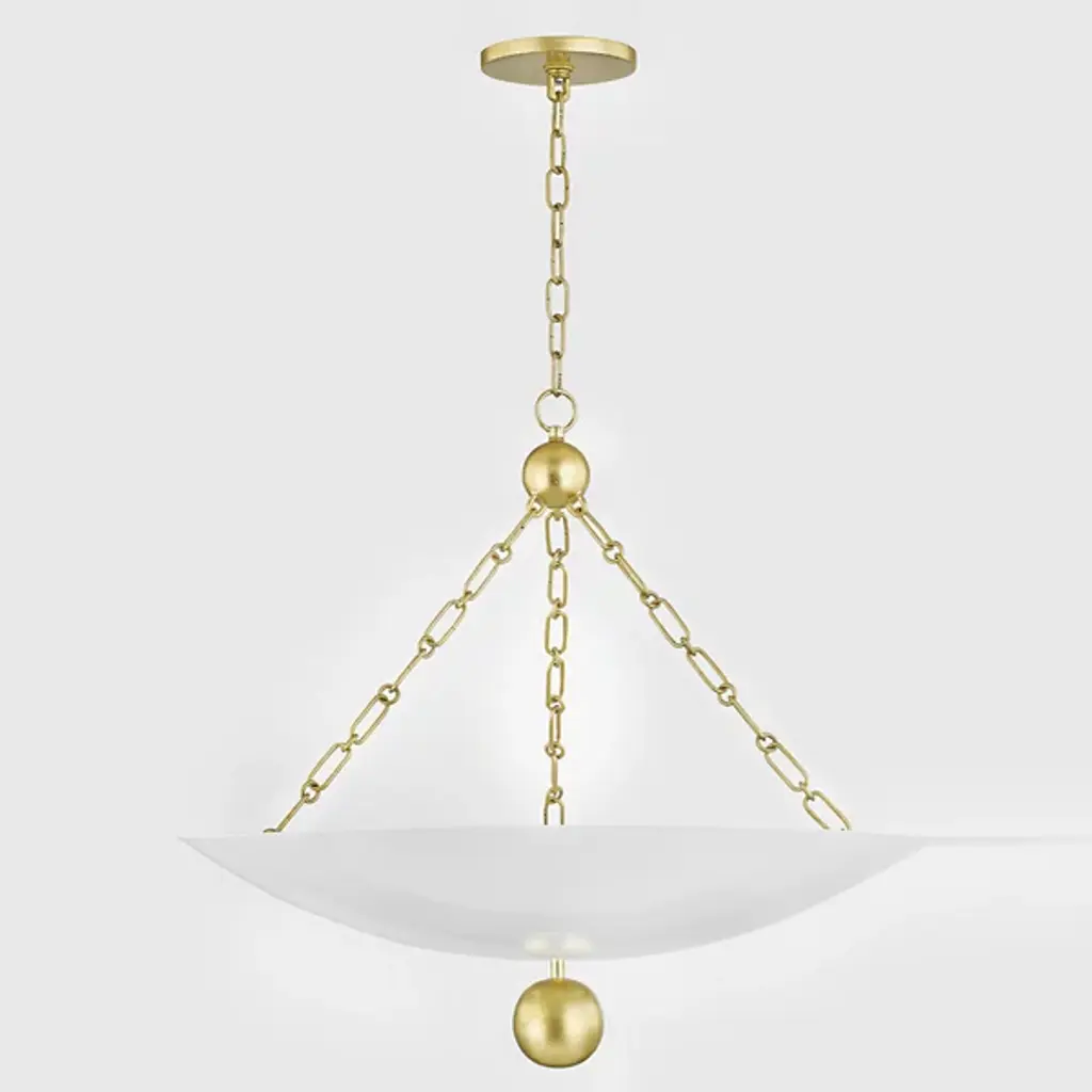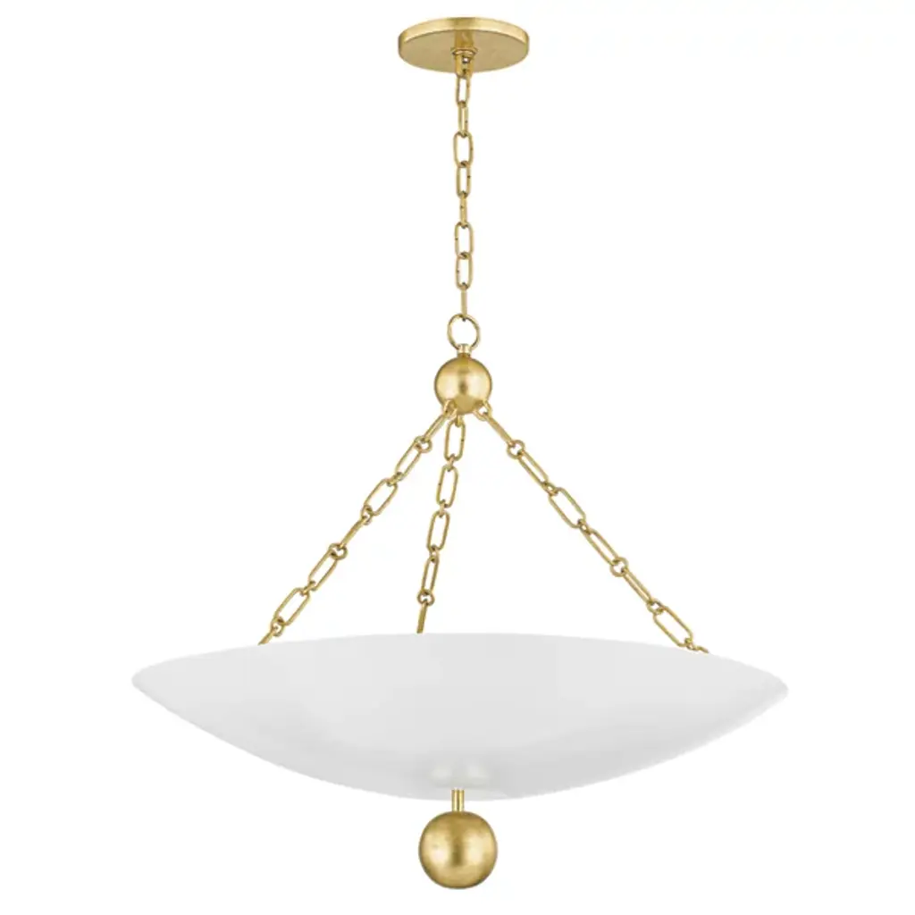 Drawing inspiration from the world of jewelry, the Amali Pendant by Mitzi brings elegance to any interior, transforming even the simplest setting into a sophisticated, modern space. This pendant exudes warmth and refinement, featuring a Soft White bowl shade suspended from a Vintage Gold Leaf chain and canopy. Accentuating its luxurious appeal are decorative golden spheres reminiscent of dazzling baubles, enhancing the pendant's aesthetic charm. Made from durable steel with a metal shade, the design brings a touch of Transitional delicacy to the elegant design, while its damp-listed design gives it go-anywhere flair.