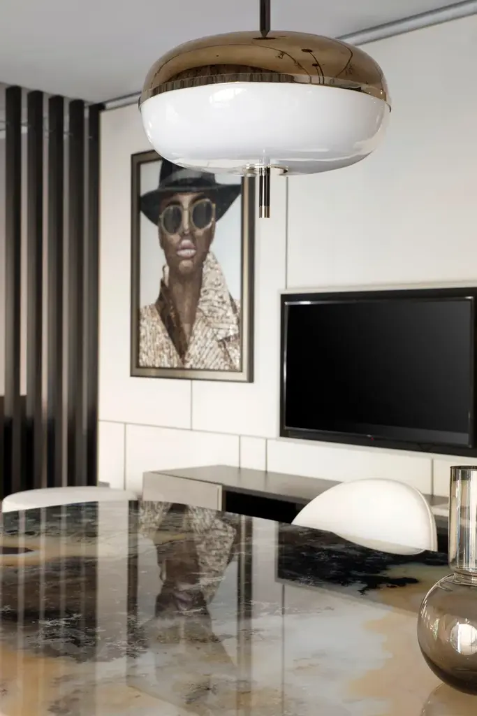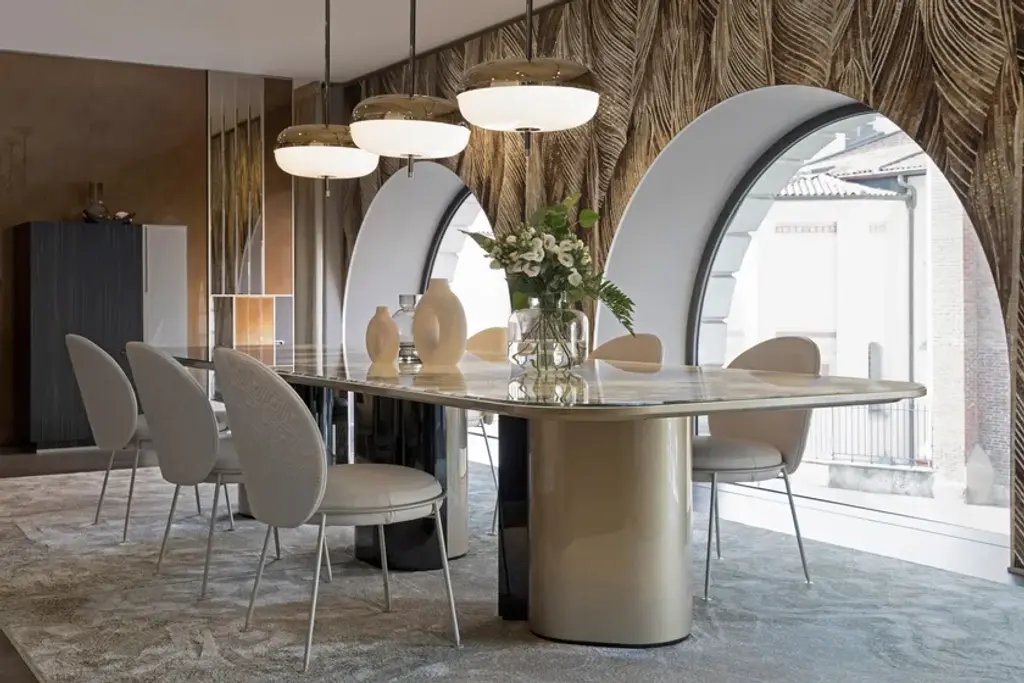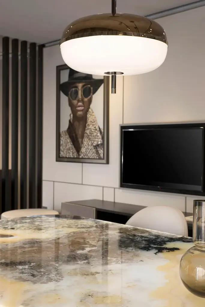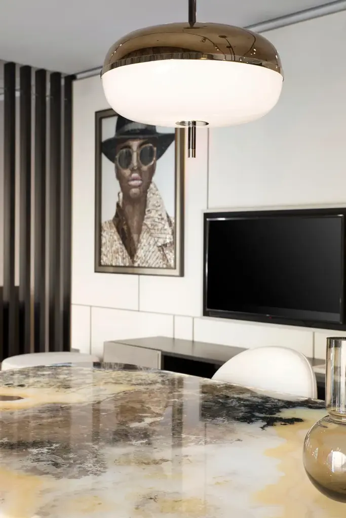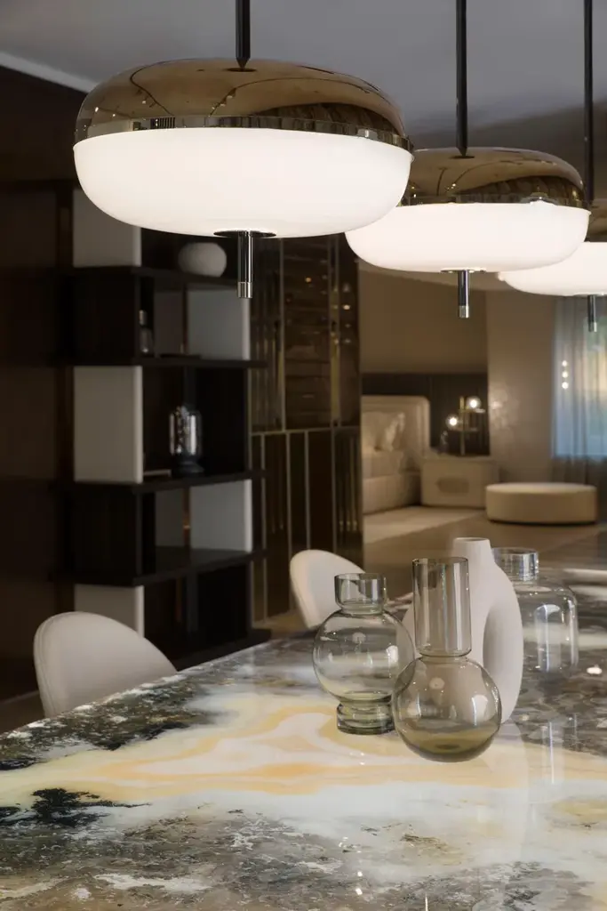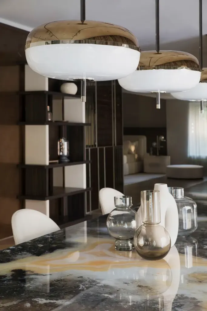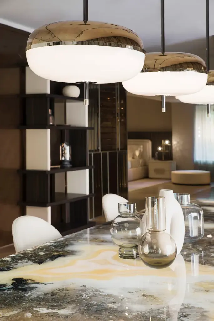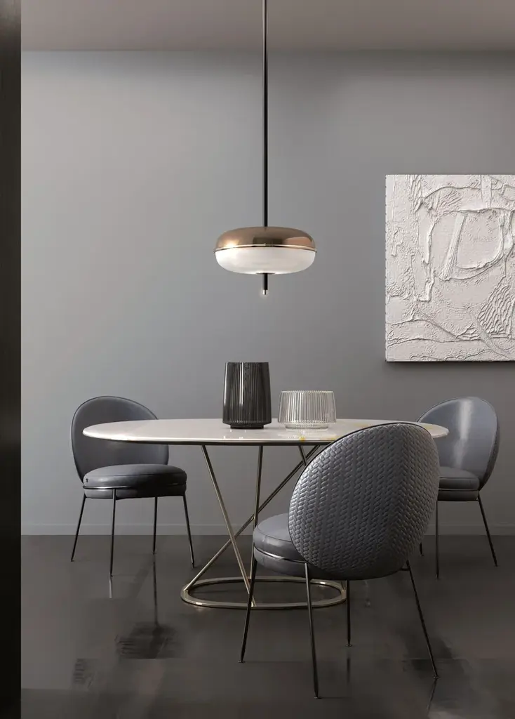 Amaretto is a ceiling lamp made with metal structure in polished black nickel and polished champagne finish. Decorative blown glass in white opal and bronze mirror finish.BULB INFORMATION: 4 X 5,8 W -12V 2700K - 23,2W - 3452 LUMENDifferent voltage on requestCERTIFICATION: CE