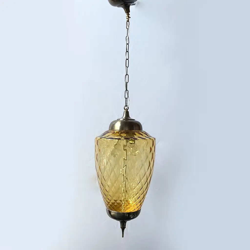 A stupendous 1950s design, this pendant lamp is a gem of the Venetian glassmaking tradition. Elegant and refined, it is handmade of Murano glass rendered in an amber shade that enhances the rhomboid textured motif decorating its lantern shape. Completed with a metal frame, it supports three E14 bulbs. Please consult the Concierge for further details and requests.