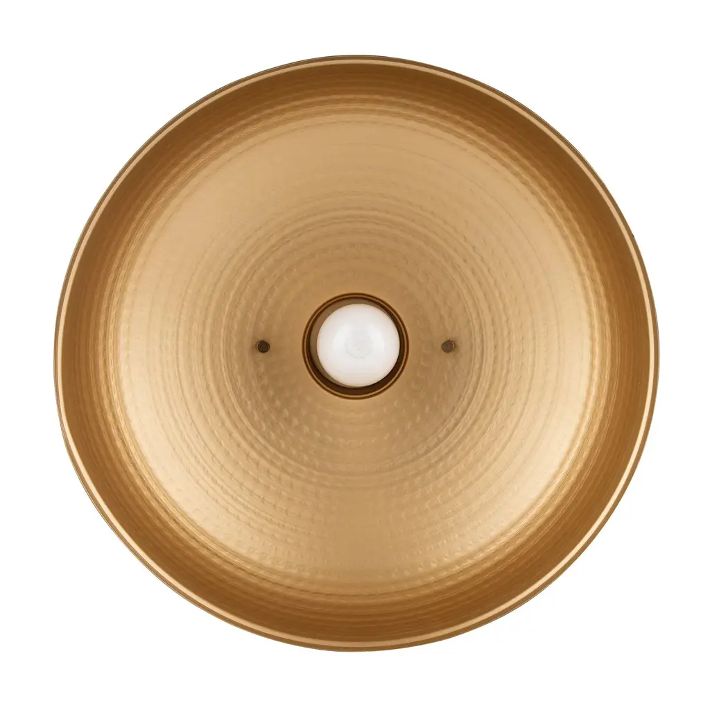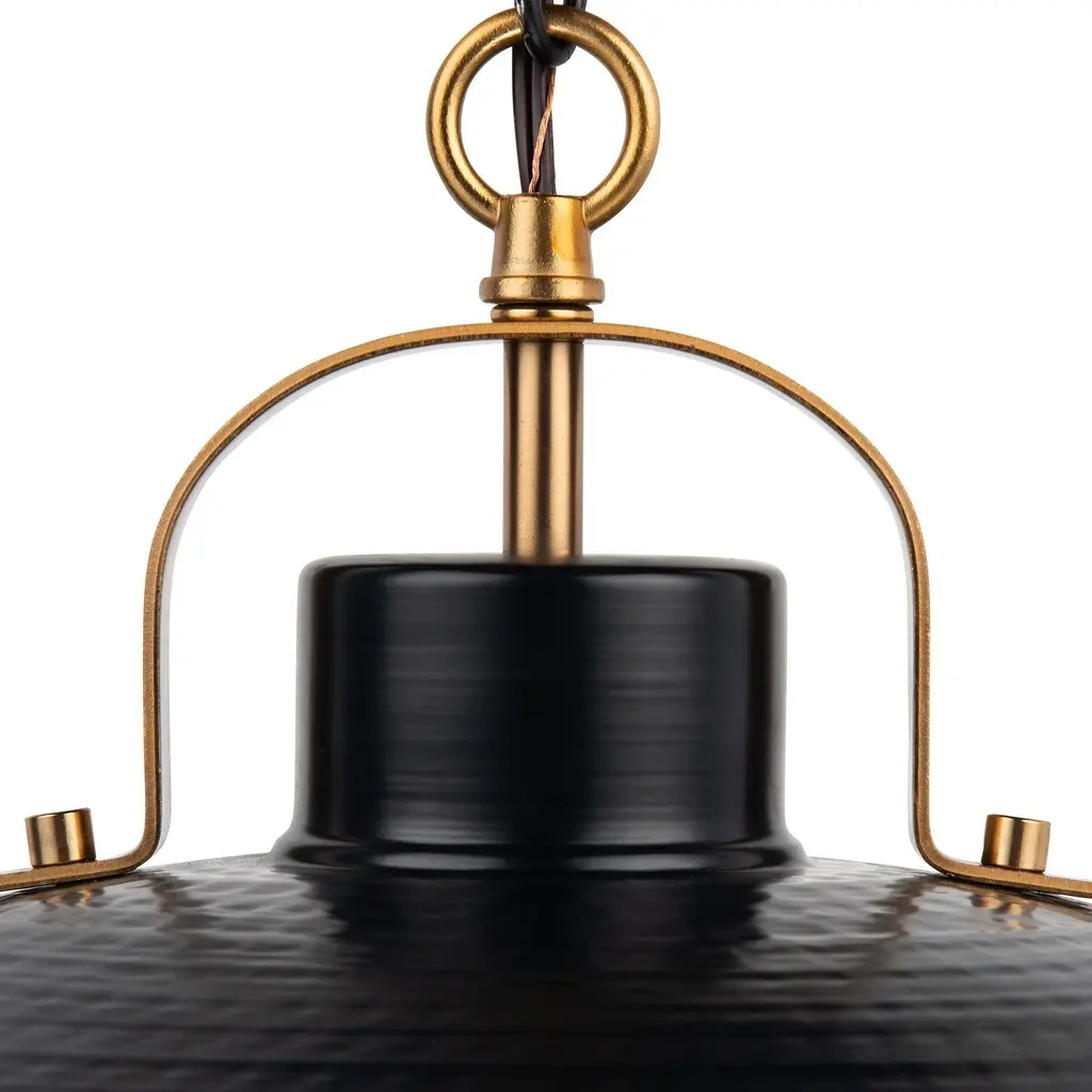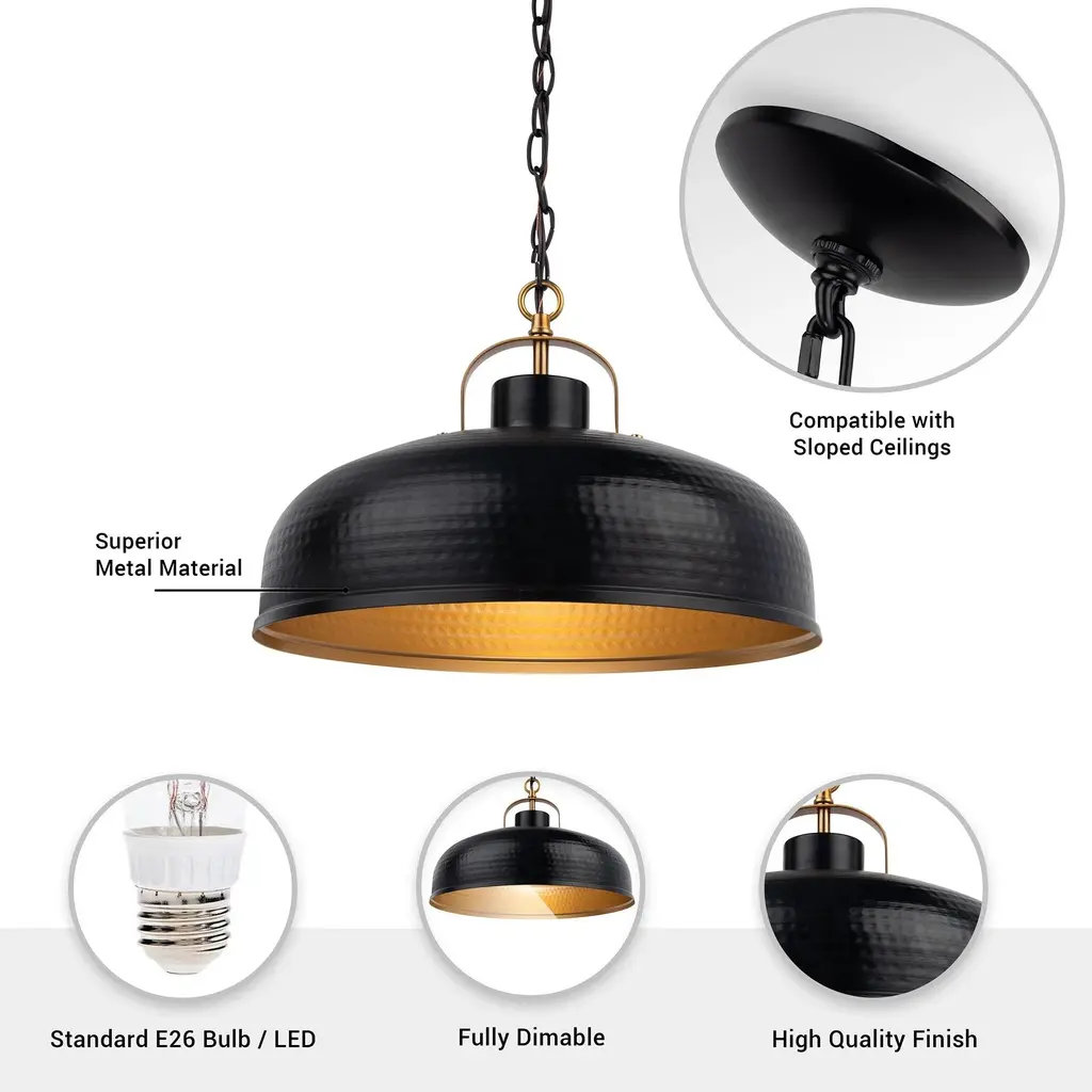 Black & gold dimmable light ceiling mounted pendant, with a restoration designed appearance. The pendant is features a gold finish inside and a beautiful hammered black finish outside to complete the design. It can support one 60W bulb (not included) and is fully dimmable. Giving you options to adjust how much light you want in the location.【Dual-Tone Restoration Design】 : Combines a striking hammered black exterior with a contrasting gold-finished interior, creating a vintage-inspired aesthetic that adds timeless elegance to any space.【Dimmable Lighting Flexibility】 : Fully dimmable functionality allows precise control over brightness levels, enabling you to set the perfect ambiance for dining, relaxation, or task lighting.【Ceiling-Mounted Versatility】 : Designed for easy ceiling installation, this pendant seamlessly integrates into kitchens, dining areas, entryways, or modern farmhouse-style interiors.【High-Quality Metal Construction】 : Crafted from durable metal with a textured hammered finish, ensuring long-lasting durability and a rugged yet refined industrial charm.【60W Bulb Compatibility】 : Supports one standard E26 60W bulb (not included), offering flexibility to choose LED, incandescent, or Edison-style bulbs for customized warmth and energy efficiency.