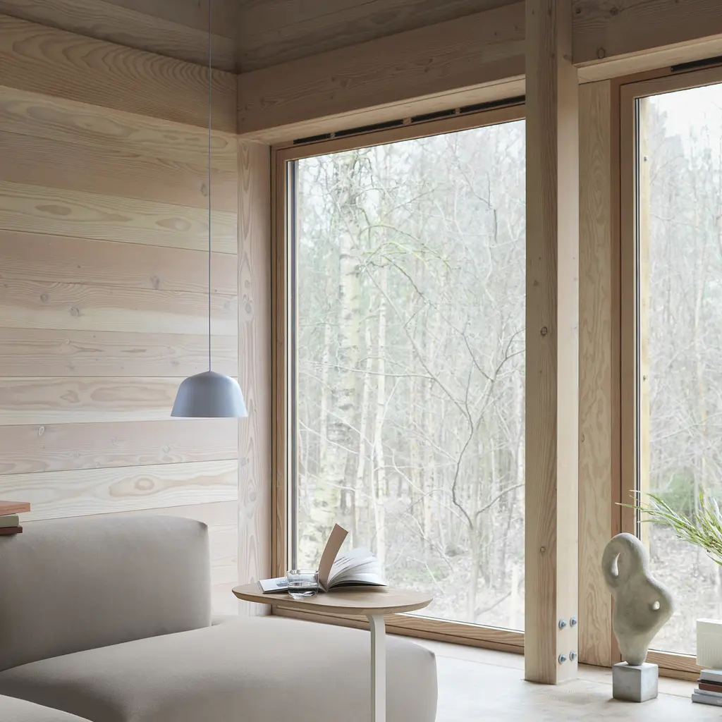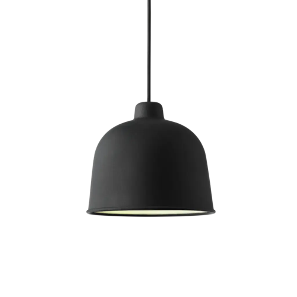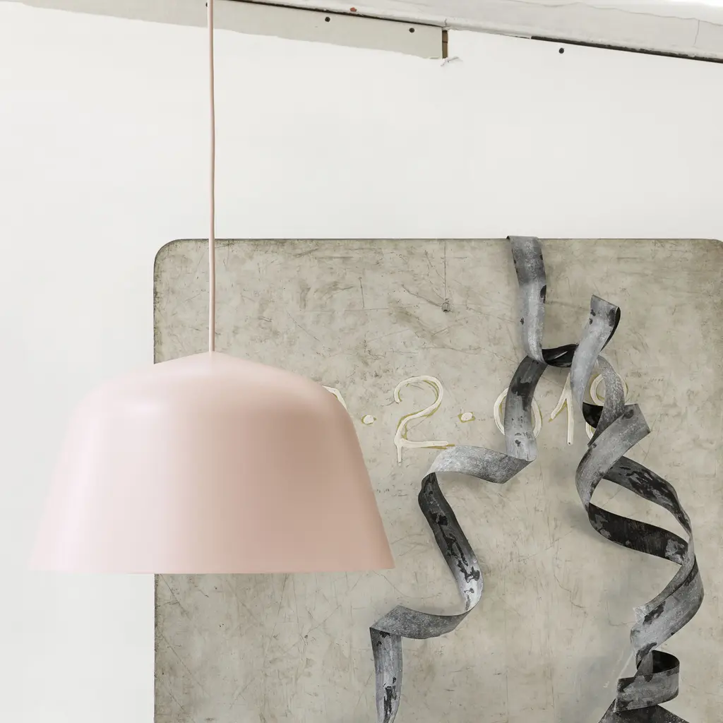Swedish designers Gabriella Gustafson and Mattias Ståhlbom of TAF Architects specified the suspension cord be color-matched to the hand-painted shade to play up the contrast between linear and rounded shapes. In press-spun aluminum, the shade's interior is painted a soft white for a tonal contrast to the Nordic palette—and to provide maxim illumination. Danish maker Muuto once again brings its hallmark "new perspective" to light.