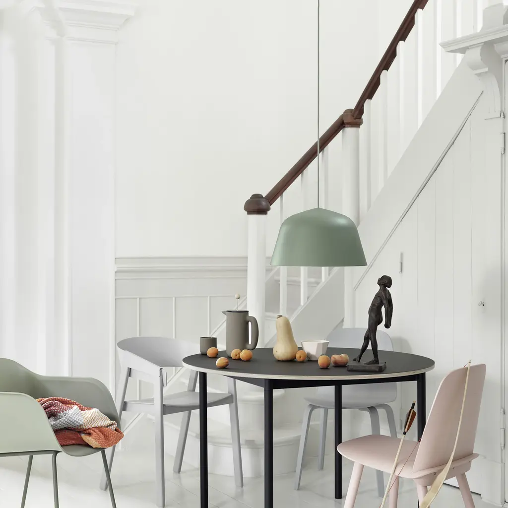 Swedish designers Gabriella Gustafson and Mattias Ståhlbom of TAF Architects specified the suspension cord be color-matched to the hand-painted shade to play up the contrast between linear and rounded shapes. In press-spun aluminum, the shade's interior is painted a soft white for a tonal contrast to the Nordic palette—and to provide maxim illumination. Danish maker Muuto once again brings its hallmark "new perspective" to light.