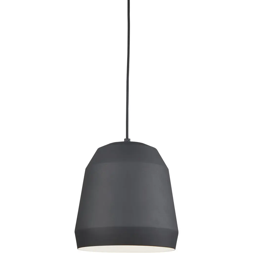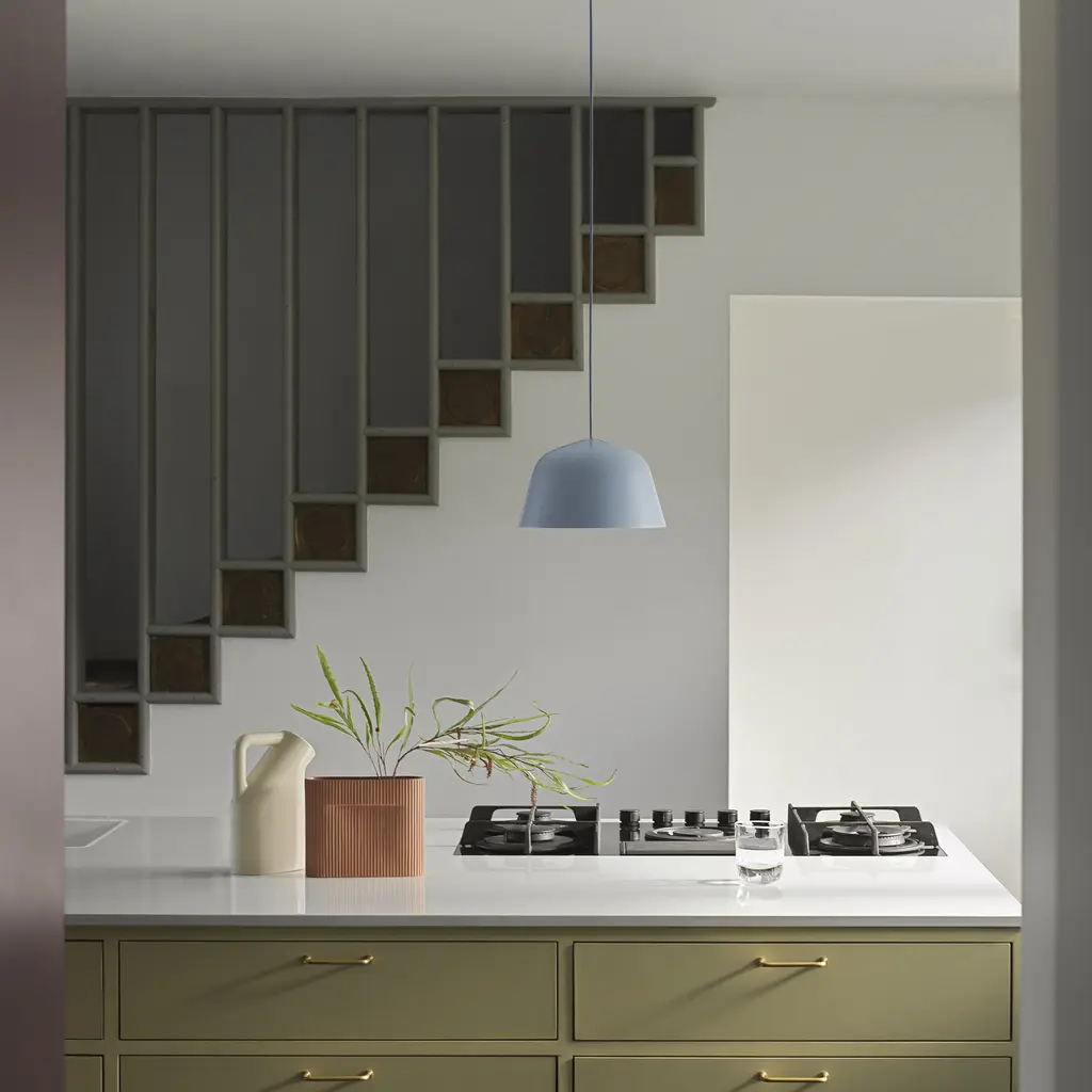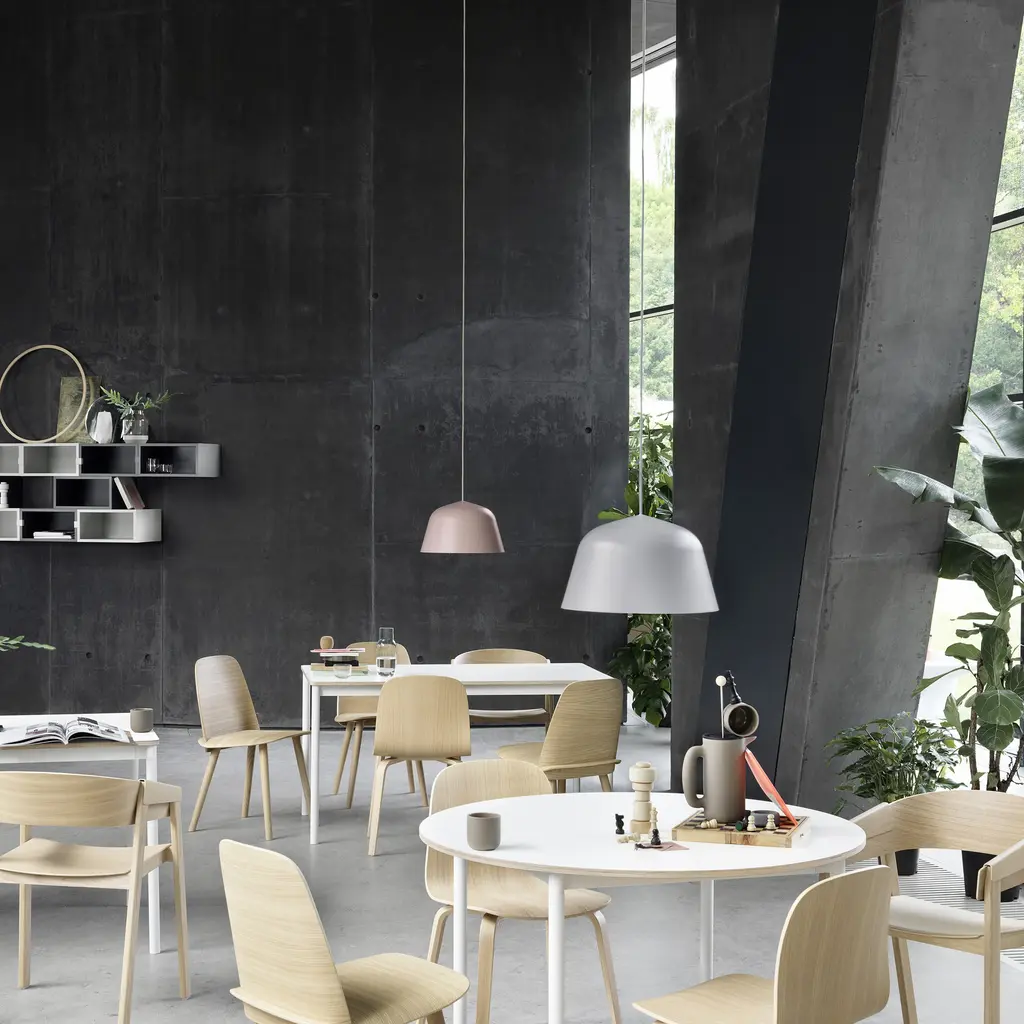 Swedish designers Gabriella Gustafson and Mattias Ståhlbom of TAF Architects specified the suspension cord be color-matched to the hand-painted shade to play up the contrast between linear and rounded shapes. In press-spun aluminum, the shade's interior is painted a soft white for a tonal contrast to the Nordic palette—and to provide maxim illumination. Danish maker Muuto once again brings its hallmark "new perspective" to light.