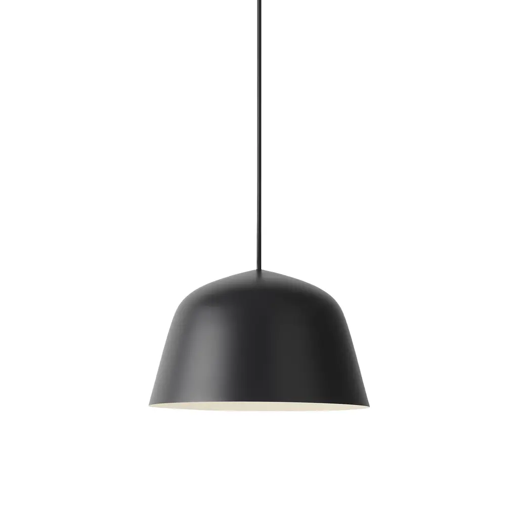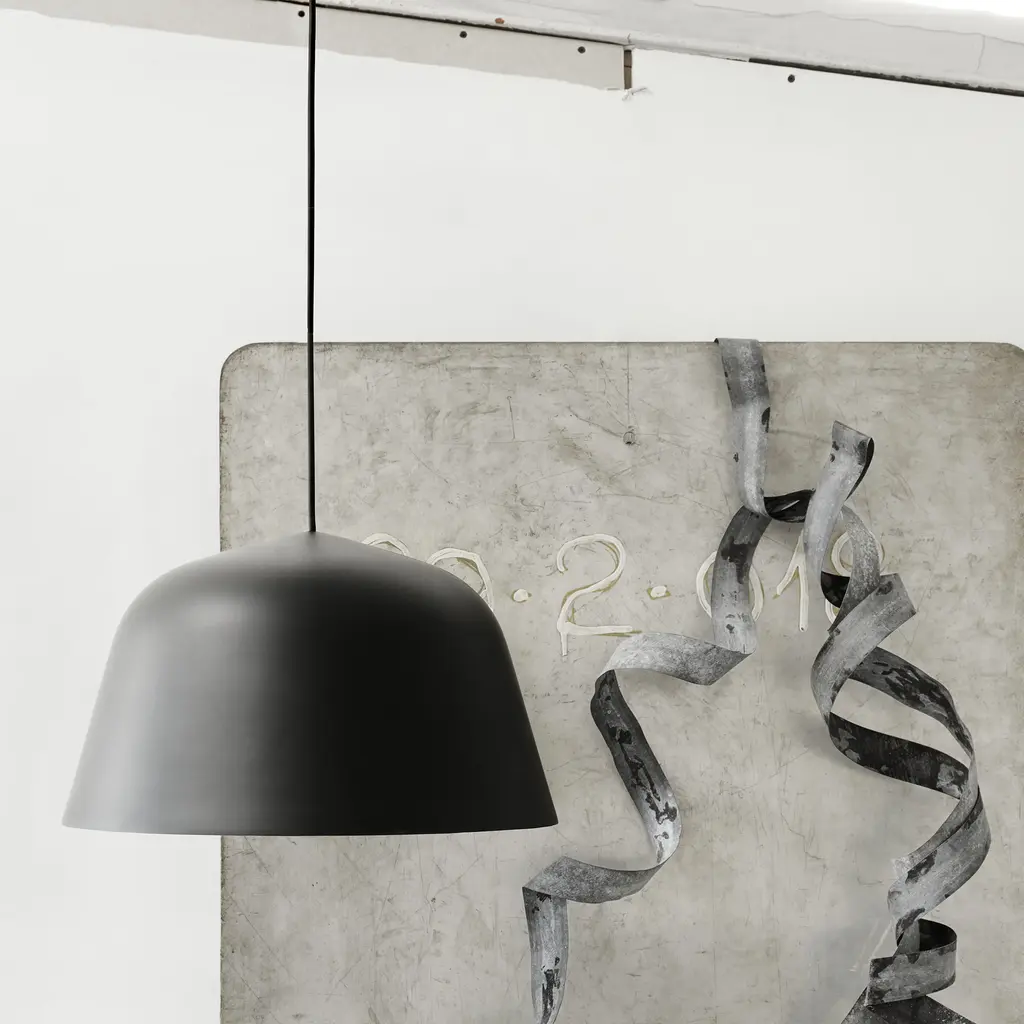 Swedish designers Gabriella Gustafson and Mattias Ståhlbom of TAF Architects specified the suspension cord be color-matched to the hand-painted shade to play up the contrast between linear and rounded shapes. In press-spun aluminum, the shade's interior is painted a soft white for a tonal contrast to the Nordic palette—and to provide maxim illumination. Danish maker Muuto once again brings its hallmark "new perspective" to light.