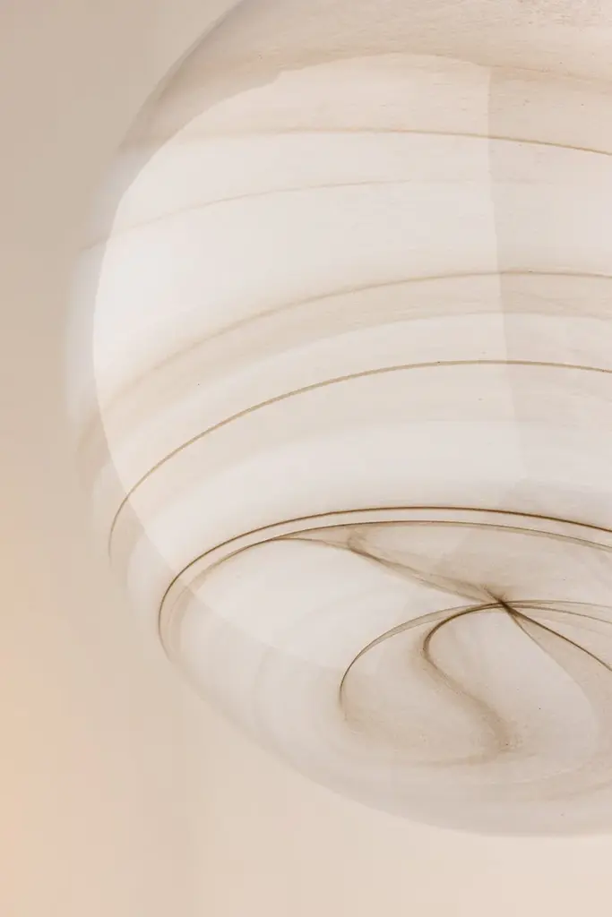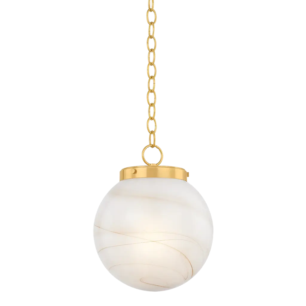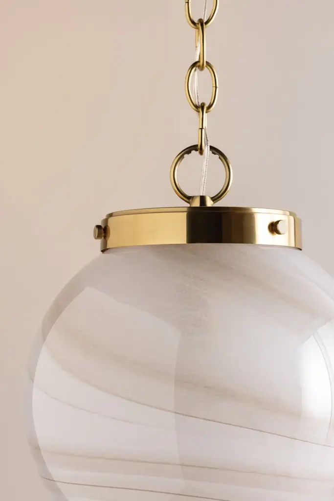The Ambra pendant's simplistic silhouette allows its distinctive glass technique to shine. Hand-blown in Mitzi’s factory, the Cappuccino Swirl glass showcases a stunning, marbled appearance with espresso-hued striations. A classic Aged Brass fitter and chain balances the dynamic glass of this pendant. Ambra is available in two sizes.