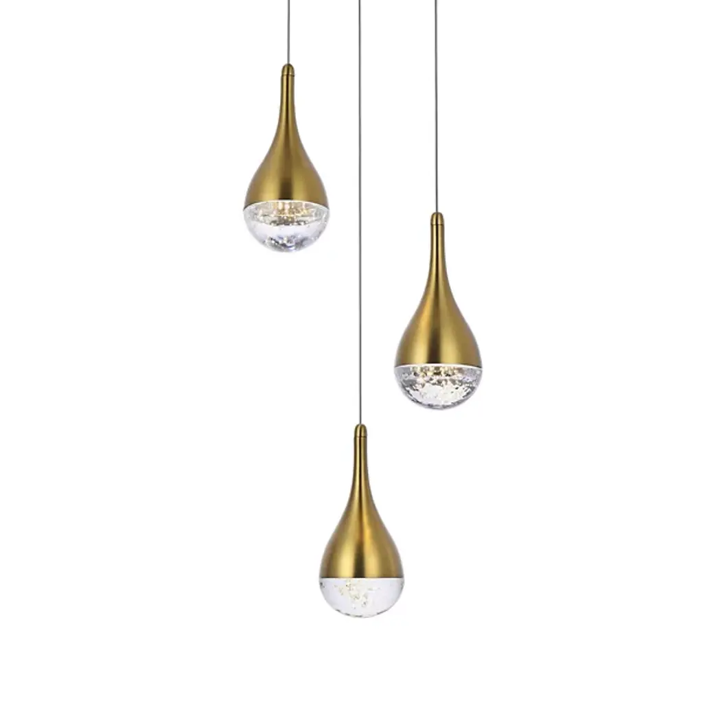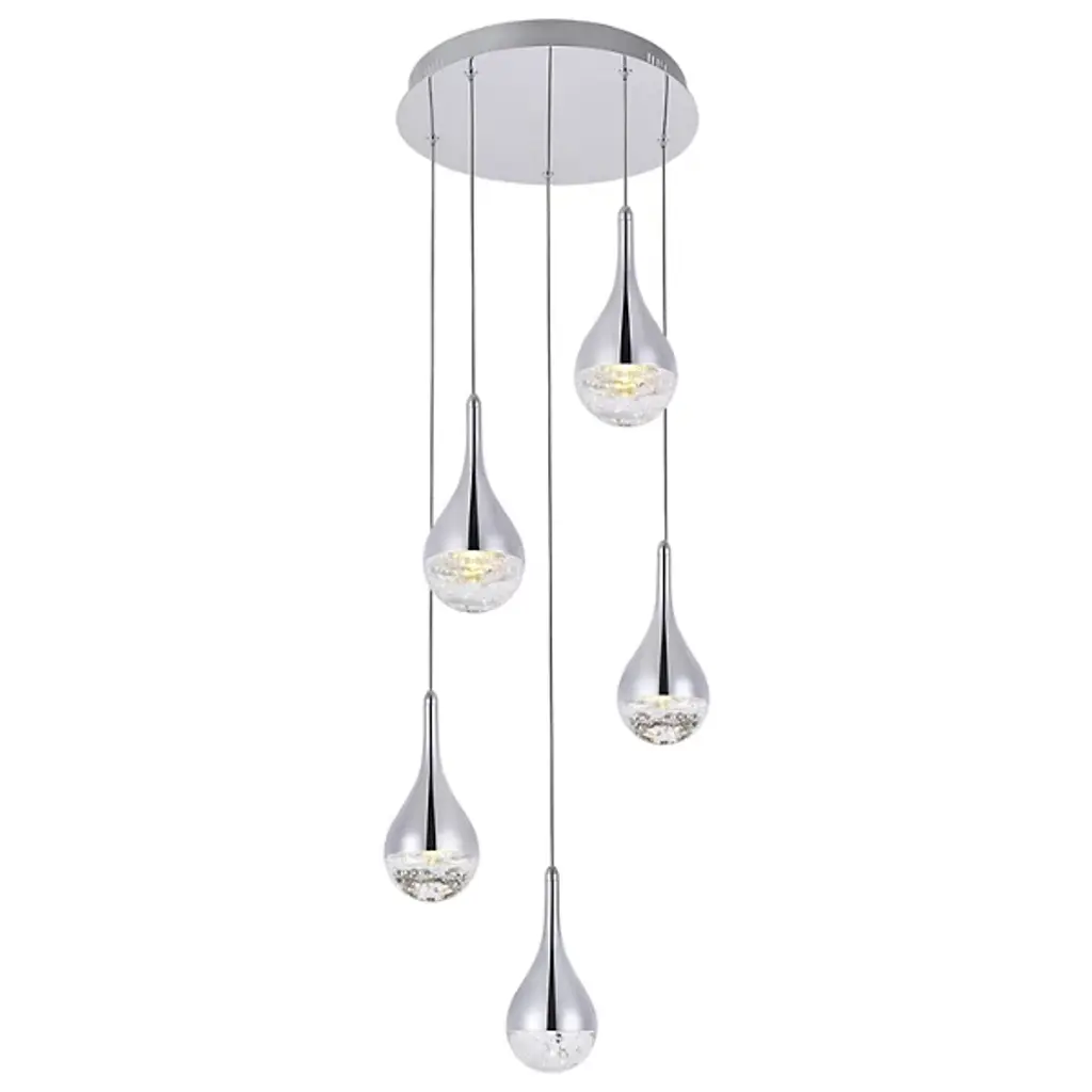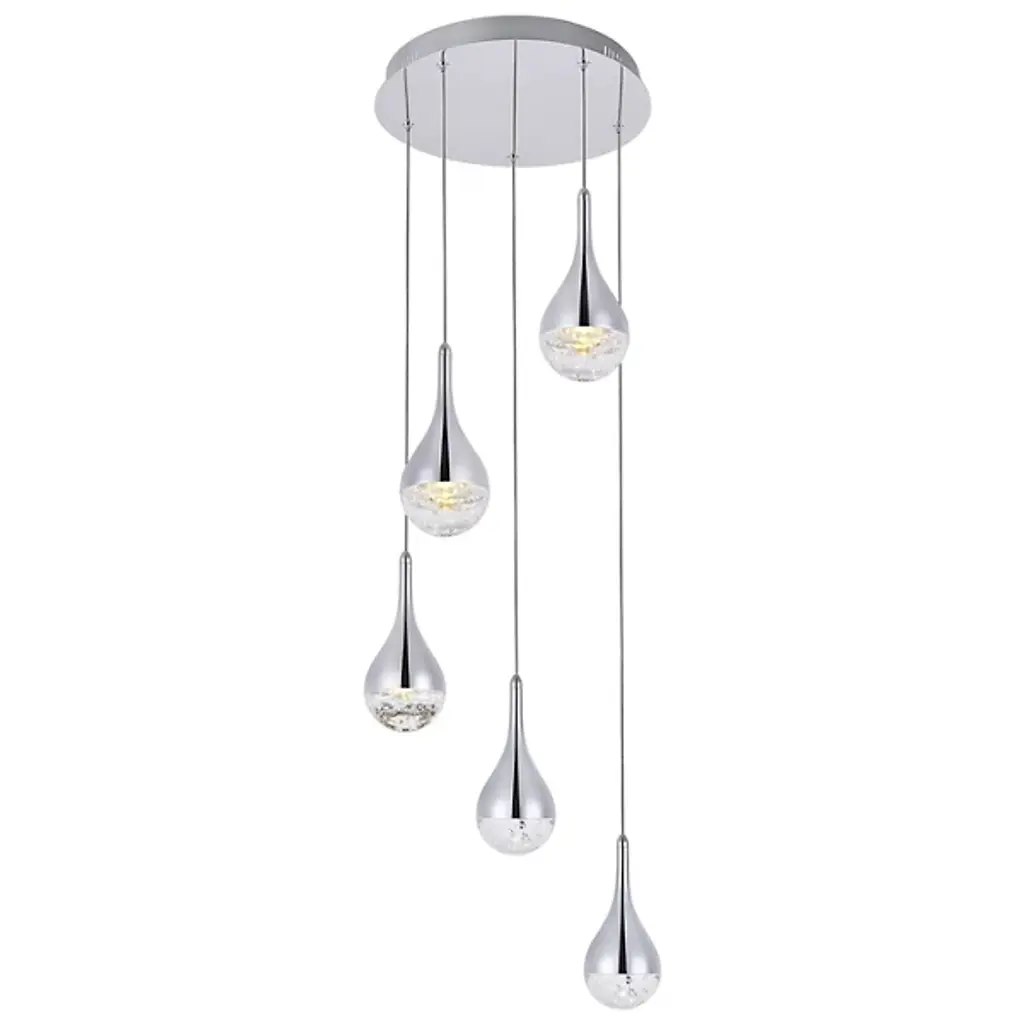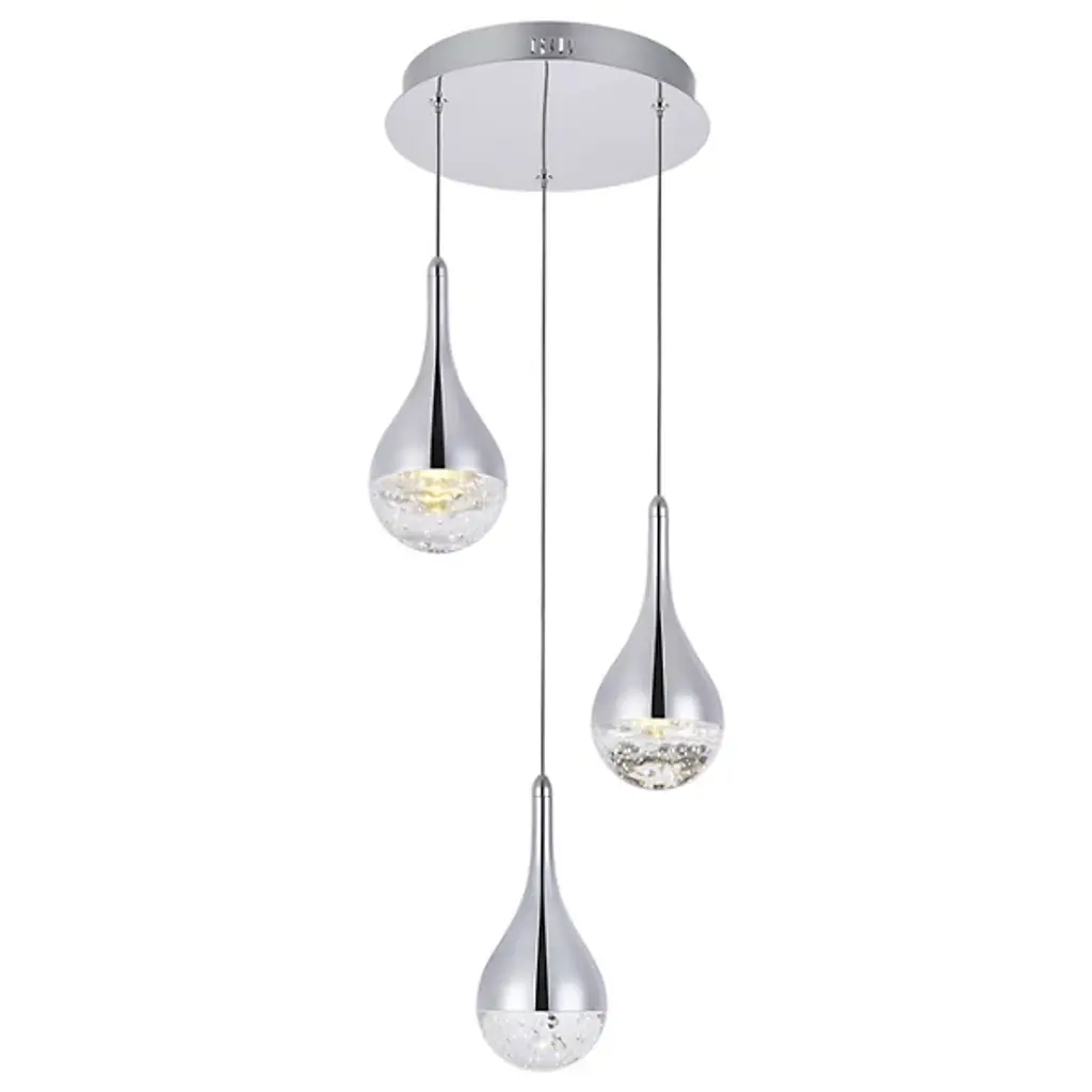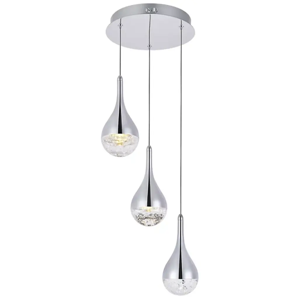 The Amherst Multi Light LED Pendant from Elegant Lighting includes three graceful teardrop forms, each cradling a constellation of sparkling crystals within its embrace. The sleek metallic exterior contrasts beautifully with the dazzling interior. Suspended from thin wires, these illuminated droplets appear to float effortlessly. The adjustable height allows for customized installation, making it perfect for dining rooms, entryways, or as a stunning focal point in a living space.