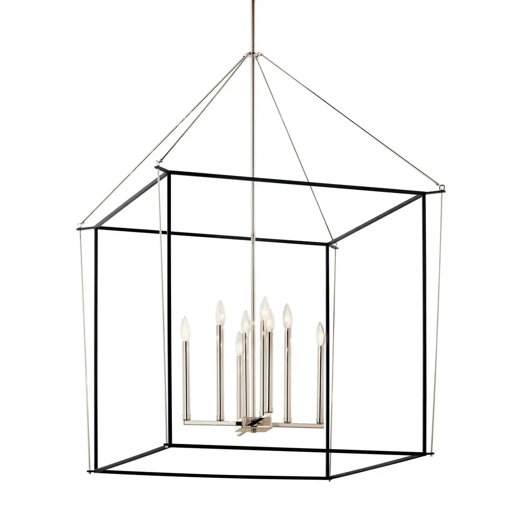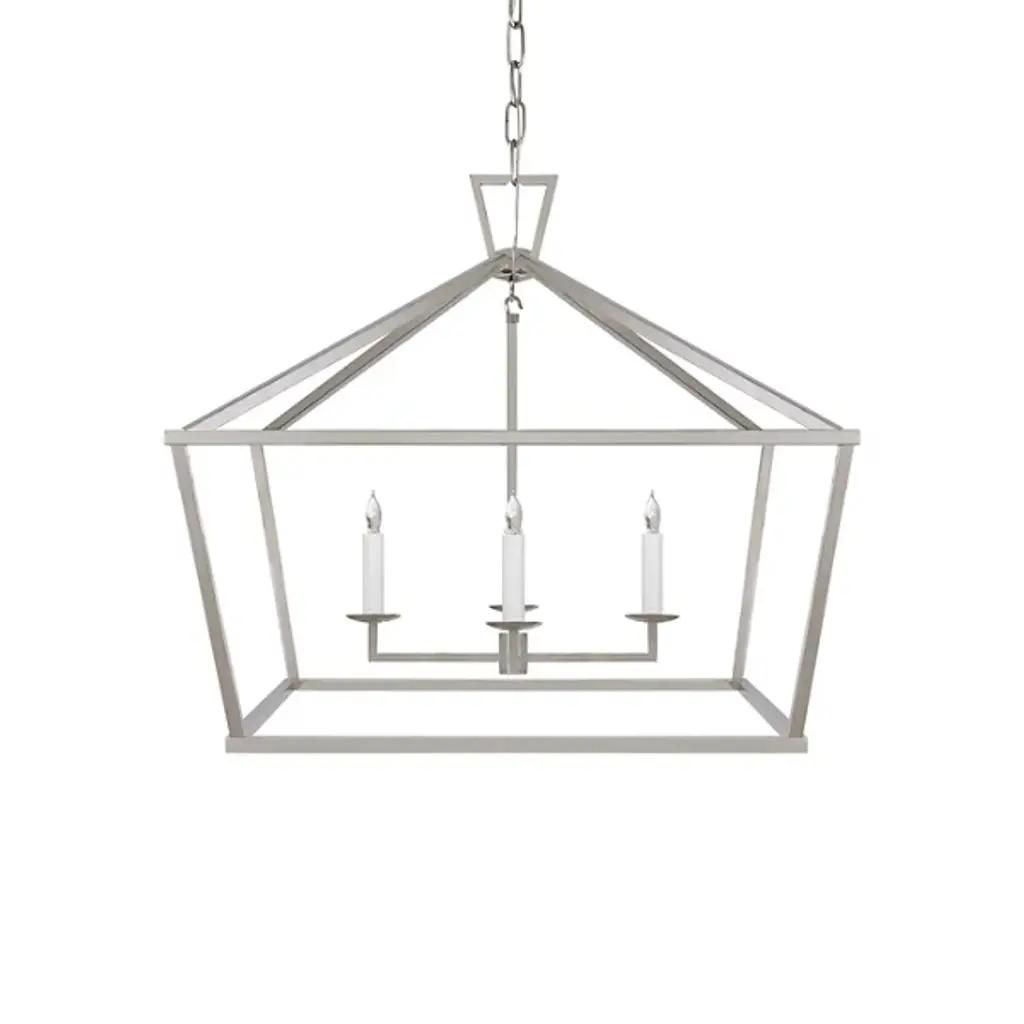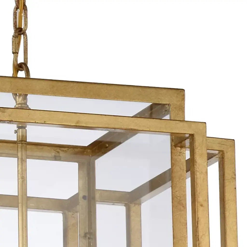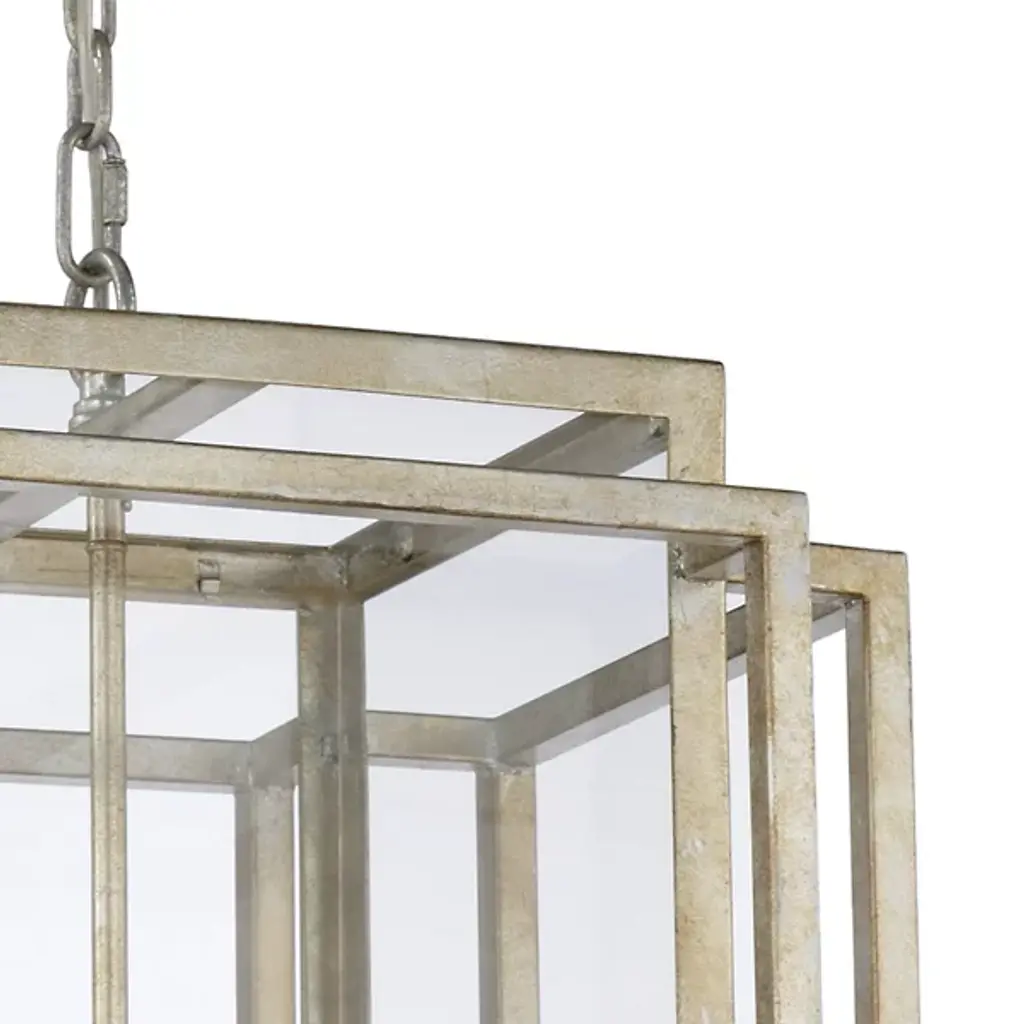 The Amherst Pendant from Wildwood pairs clear glass panels with an iron framework for a lantern-inspired design. Its four interior lights create a warm glow that enhances the metal's rich finish while projecting patterns through the glass panels. The pendant comes with a generous nine-foot chain that provides installation flexibility for various ceiling heights, from standard to soaring. It works beautifully in entryways, where it makes a welcoming first impression, or above dining tables, where its classic form adds timeless character to everyday meals.