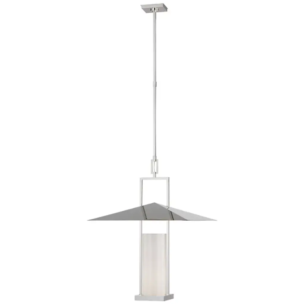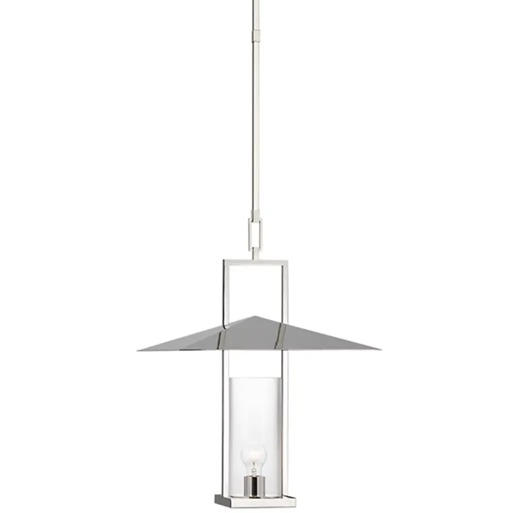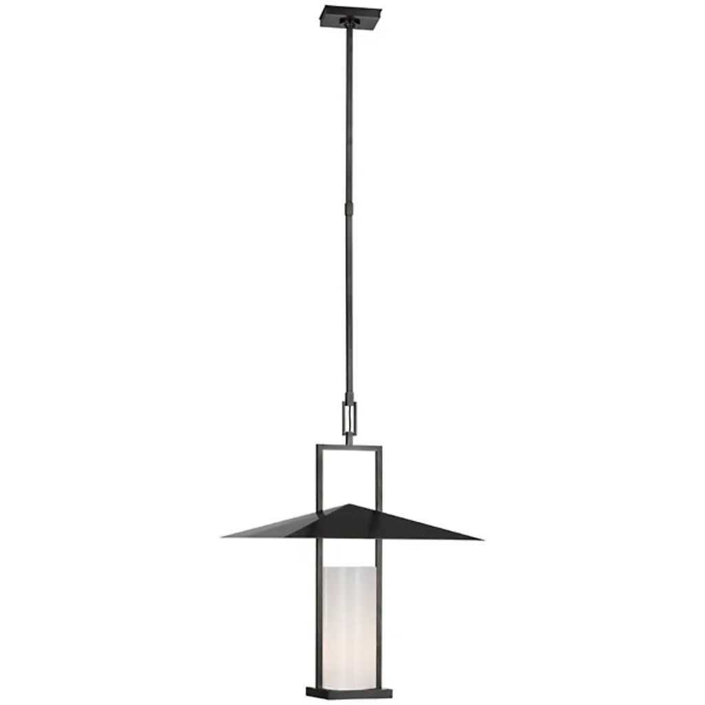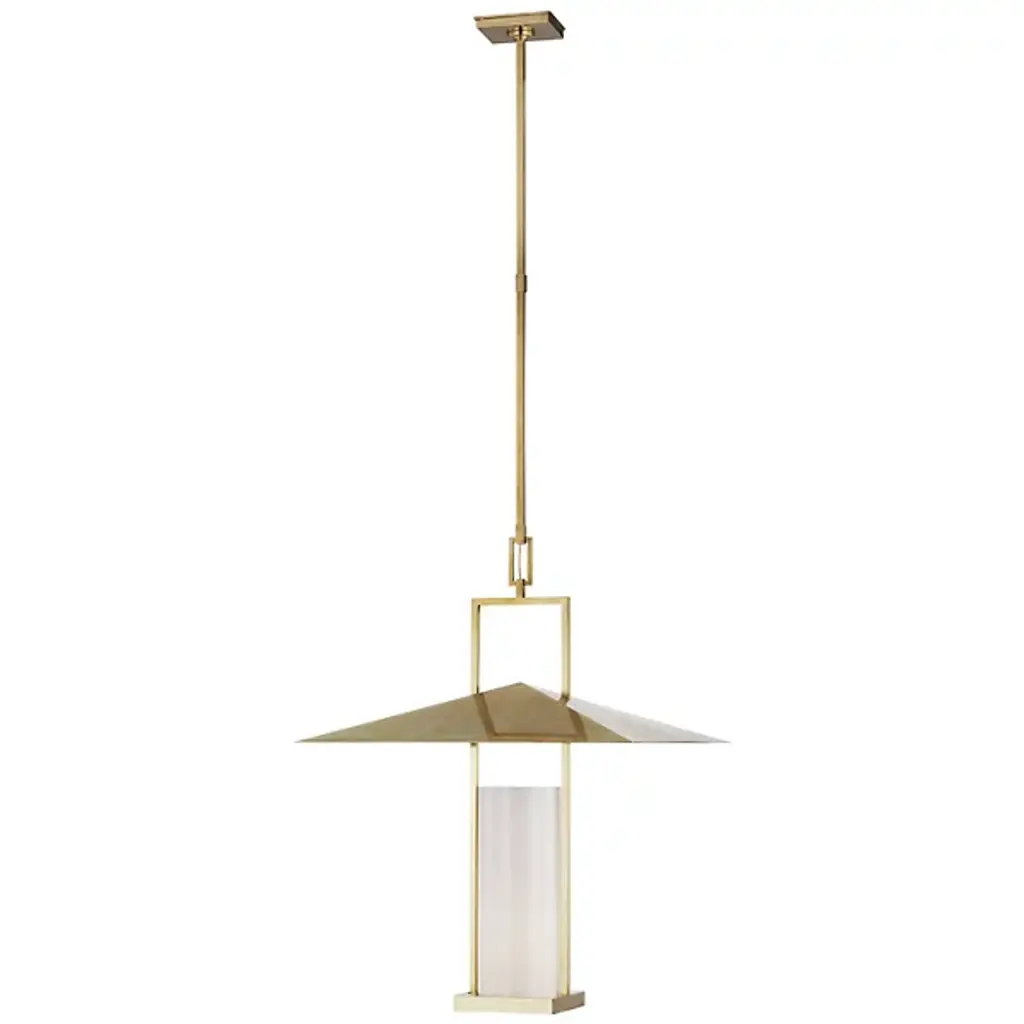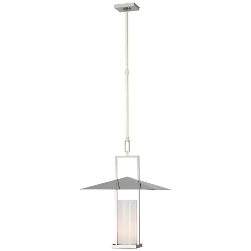 The Amity Pendant from Visual Comfort Signature, a creation by Ray Booth, presents a modern interpretation of traditional Asian lanterns. The pendant boasts a shallow canopy bisected by an elongated metal trapeze, holding a soft white glass cylinder that emits a warm and inviting glow within the interior. Whether used alone or in multiples to line a hallway, this geometric silhouette makes a unique and captivating statement, infusing any home with modern elegance.