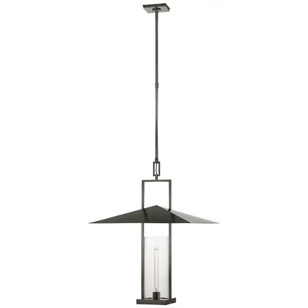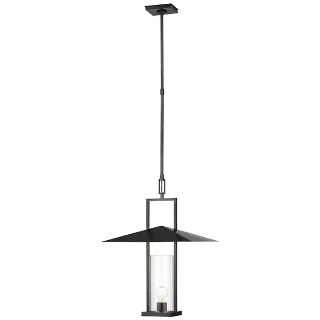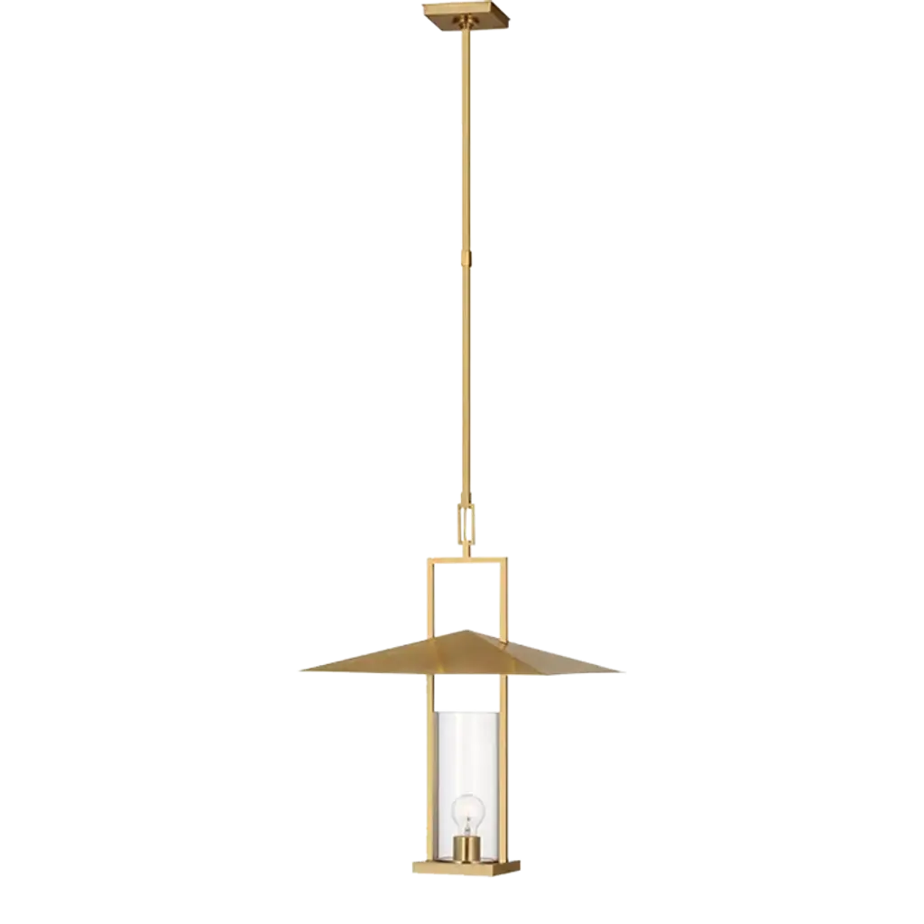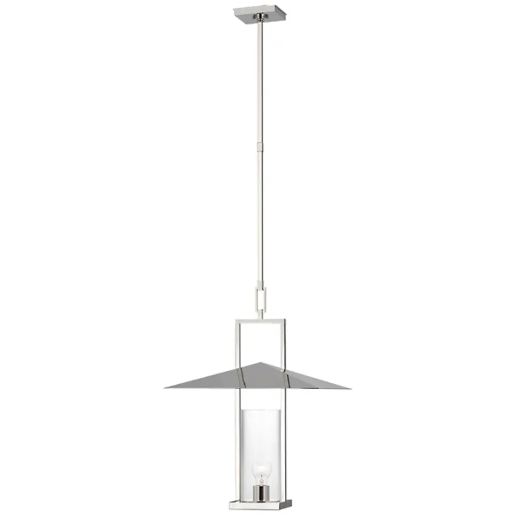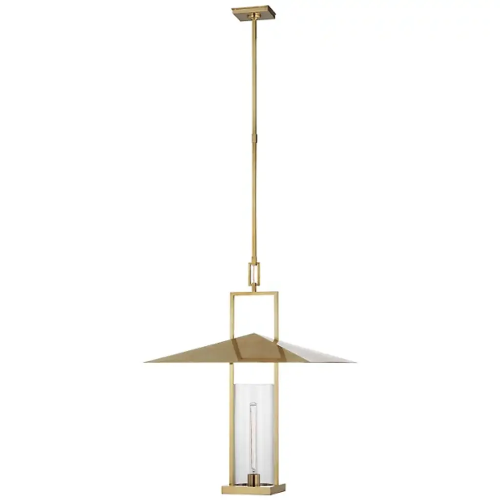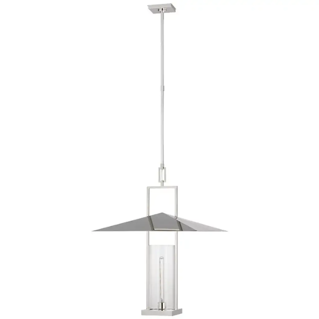 The Amity Pendant from Visual Comfort Signature, a creation by Ray Booth, presents a modern interpretation of traditional Asian lanterns. The pendant boasts a shallow canopy bisected by an elongated metal trapeze, holding a soft white glass cylinder that emits a warm and inviting glow within the interior. Whether used alone or in multiples to line a hallway, this geometric silhouette makes a unique and captivating statement, infusing any home with modern elegance.