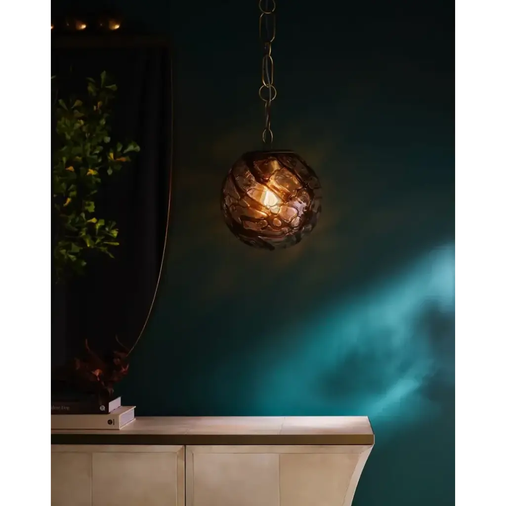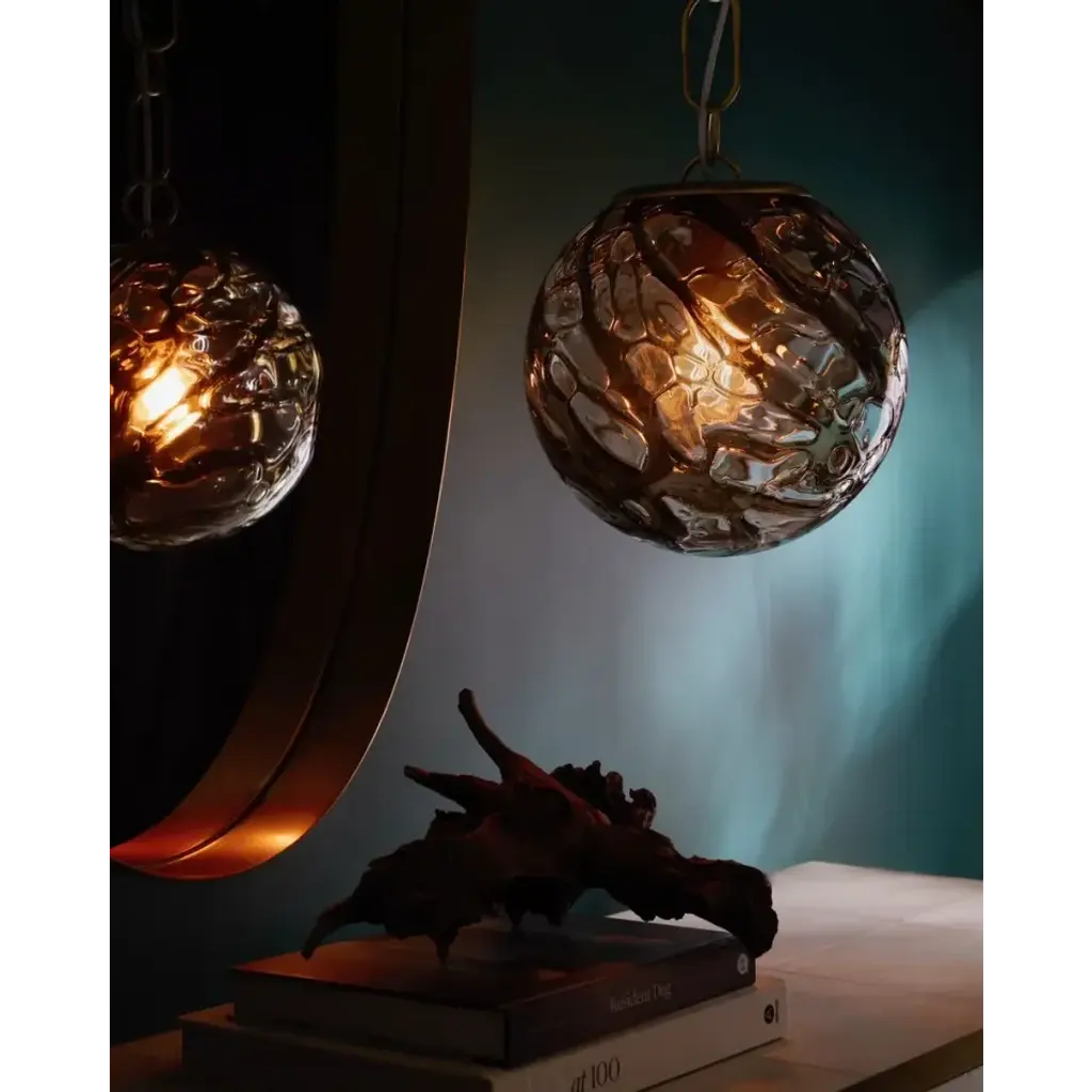 The Amo Pendant - Smoke is a stunning expression of Italian glass artistry. Made from mouth-blown glass, its organic, fluid form showcases cool gray tones that glow beautifully when illuminated. Suspended from an antique brass chain, this pendant brings handcrafted elegance and a touch of modern romance to any space.