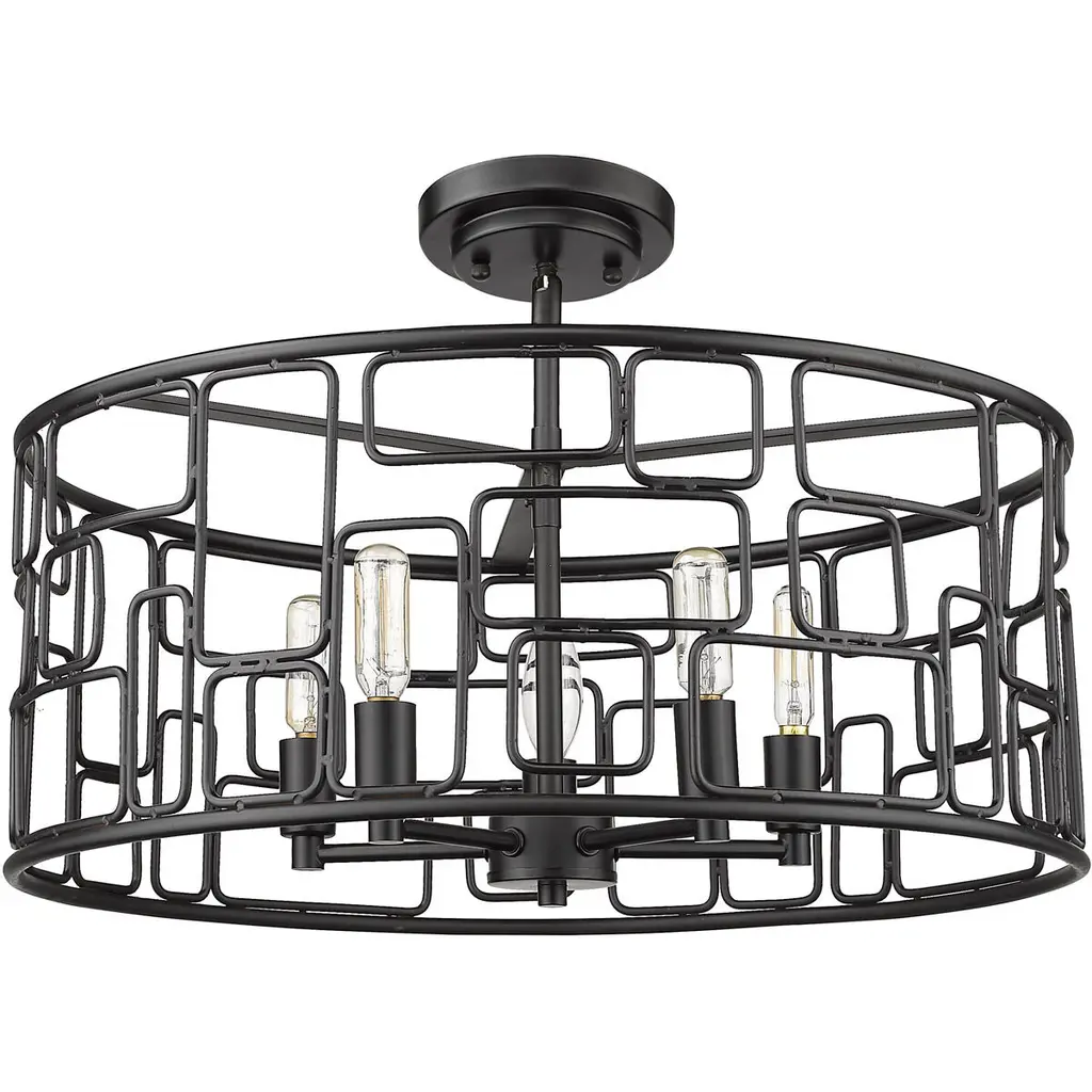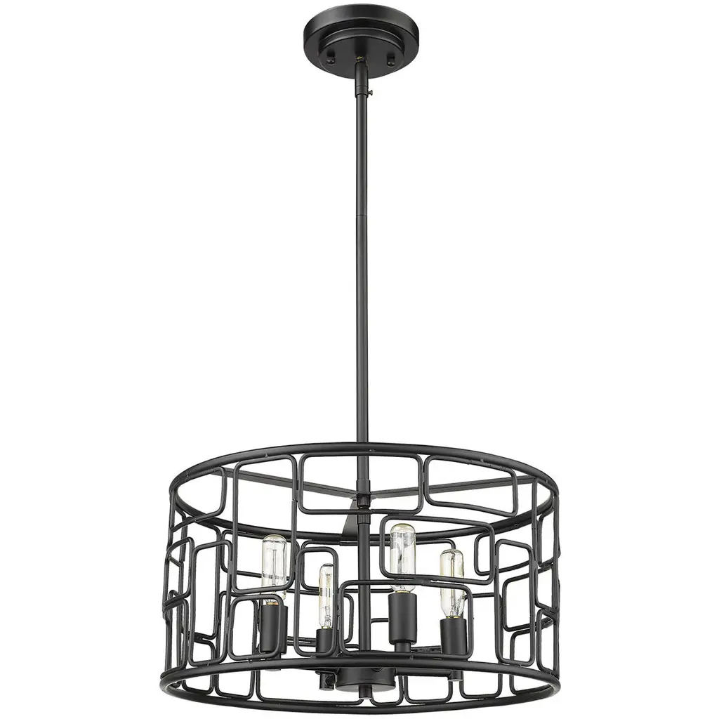 Robust, metal drum shaped shades of open geometric designs. This convertible light fixture easily transforms from a pendant into a semi-flush mount. Amoret is also sloped ceiling compatible.