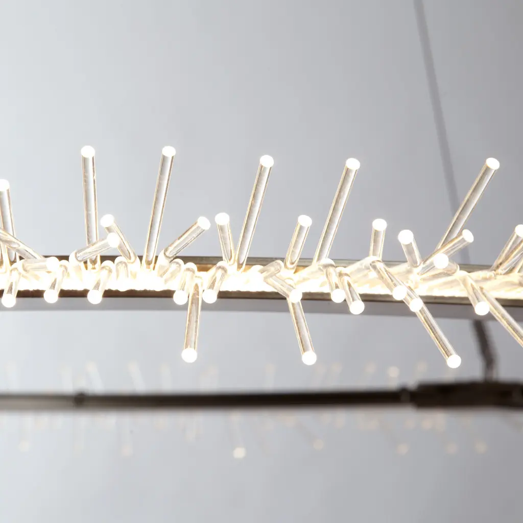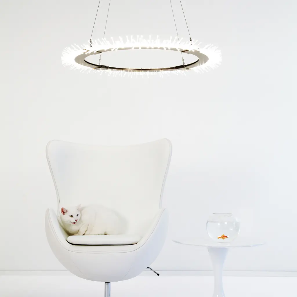 A circular LED light guide is suspended from four cables and feeds light to the Anemone’s bristles. The bristles spread light to your room as dim or bright as you’d like.