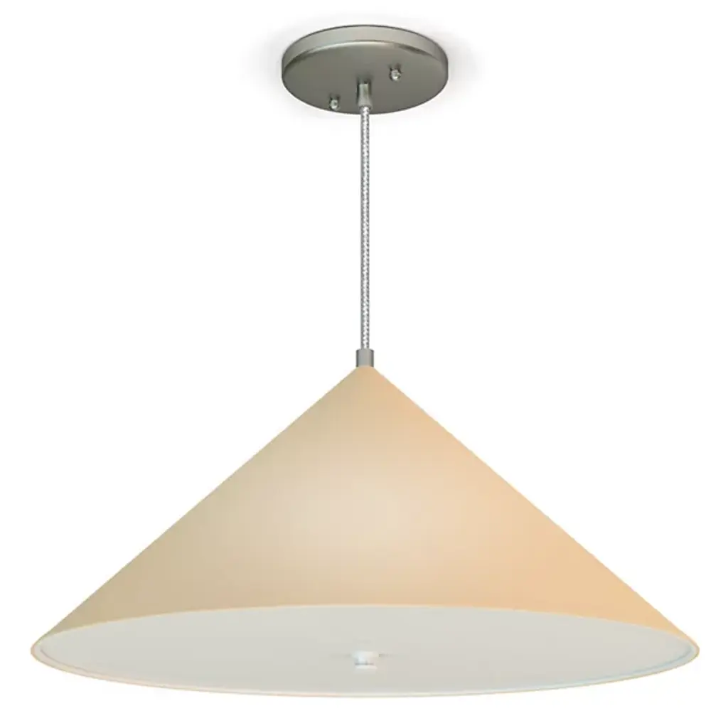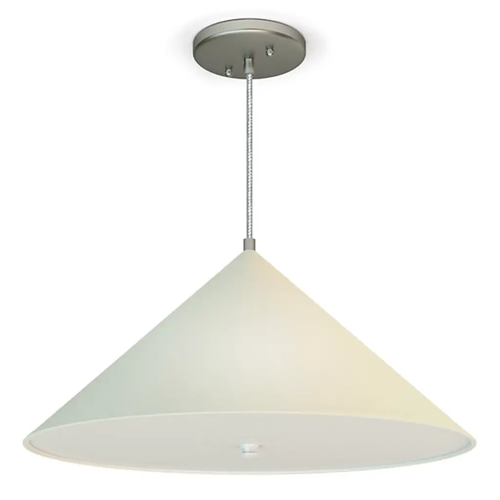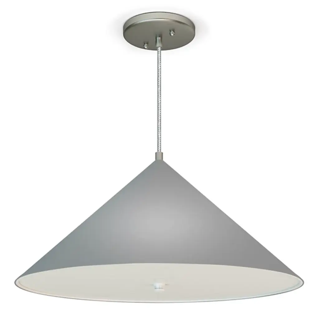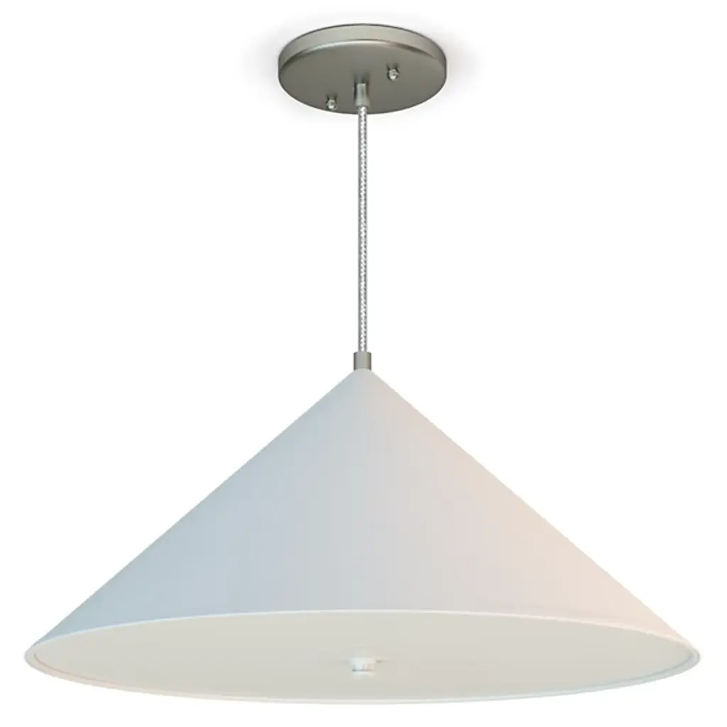 Transform your living spaces with the simple geometric shape of the Angelica Pendant from Seascape Lamps. A simple contemporary design, it descends from a circle-shaped canopy and places strong lamping inside a cone-shaped textile shade. A circular diffuser is nestled just inside the rim of the shade’s open base, held in place by a small circle accent that coordinates with the other smaller fittings. This shade arrangement reduces bright glare from the lamping and channels out a broad, even ambiance below that doesn’t overpower its environment.
