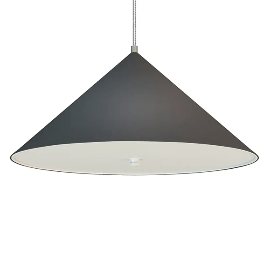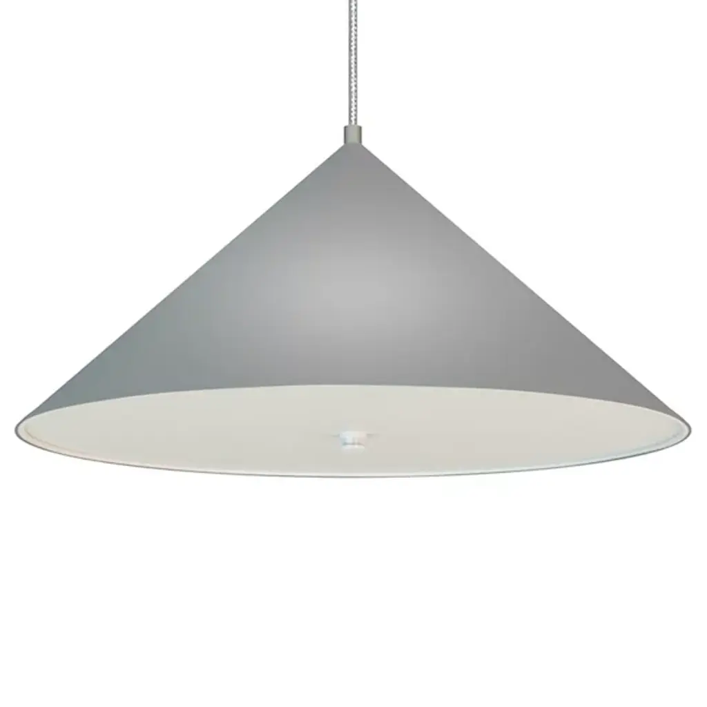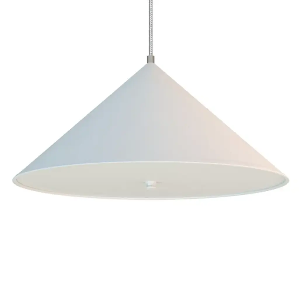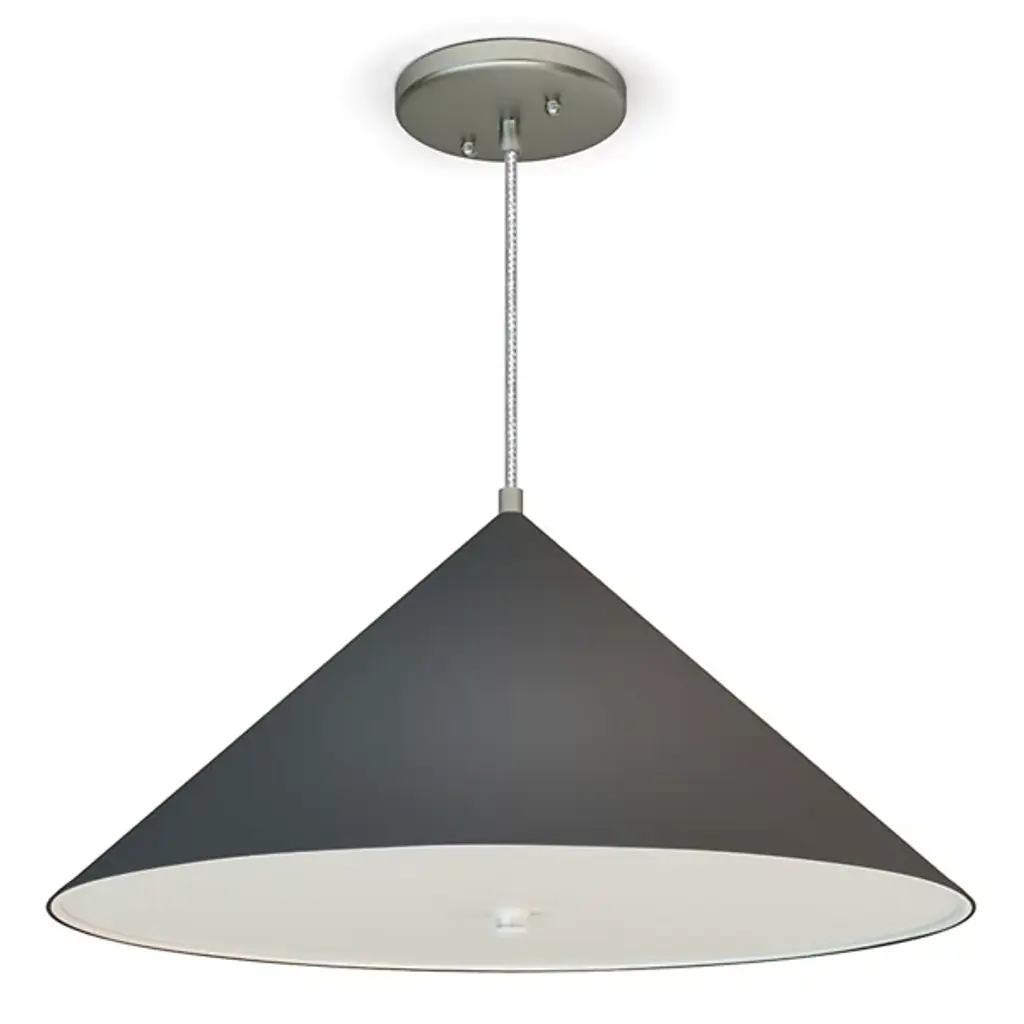 Transform your living spaces with the simple geometric shape of the Angelica Pendant from Seascape Lamps. A simple contemporary design, it descends from a circle-shaped canopy and places strong lamping inside a cone-shaped textile shade. A circular diffuser is nestled just inside the rim of the shade’s open base, held in place by a small circle accent that coordinates with the other smaller fittings. This shade arrangement reduces bright glare from the lamping and channels out a broad, even ambiance below that doesn’t overpower its environment.