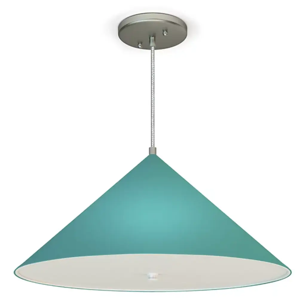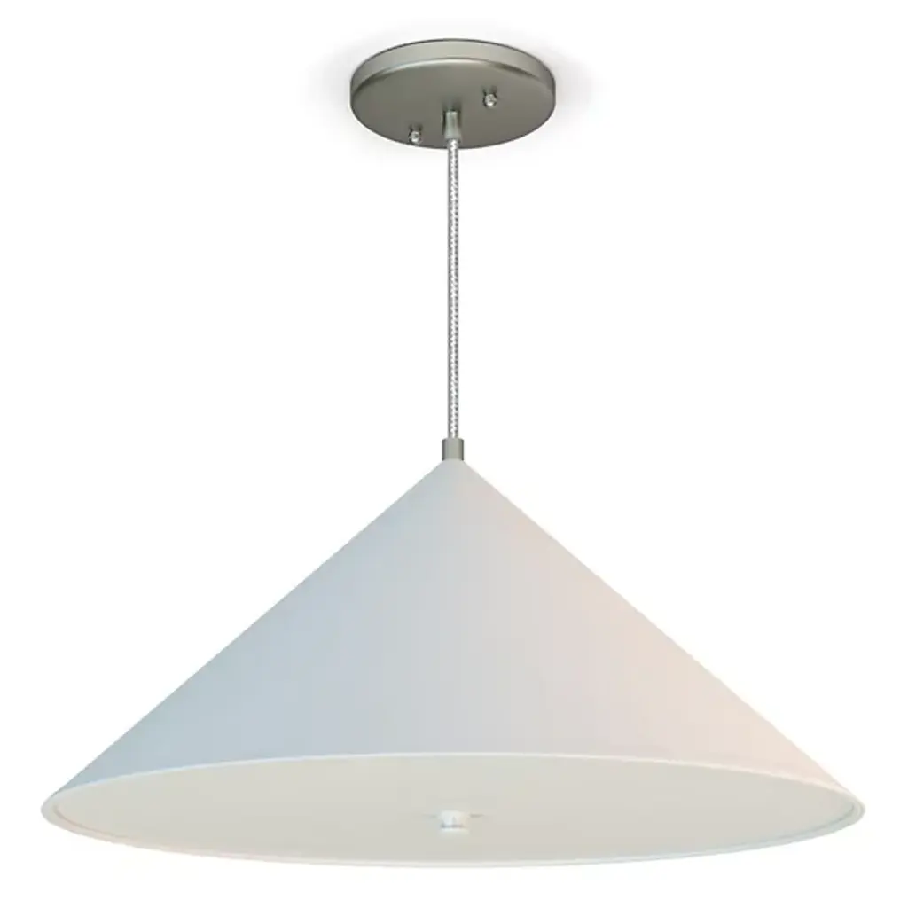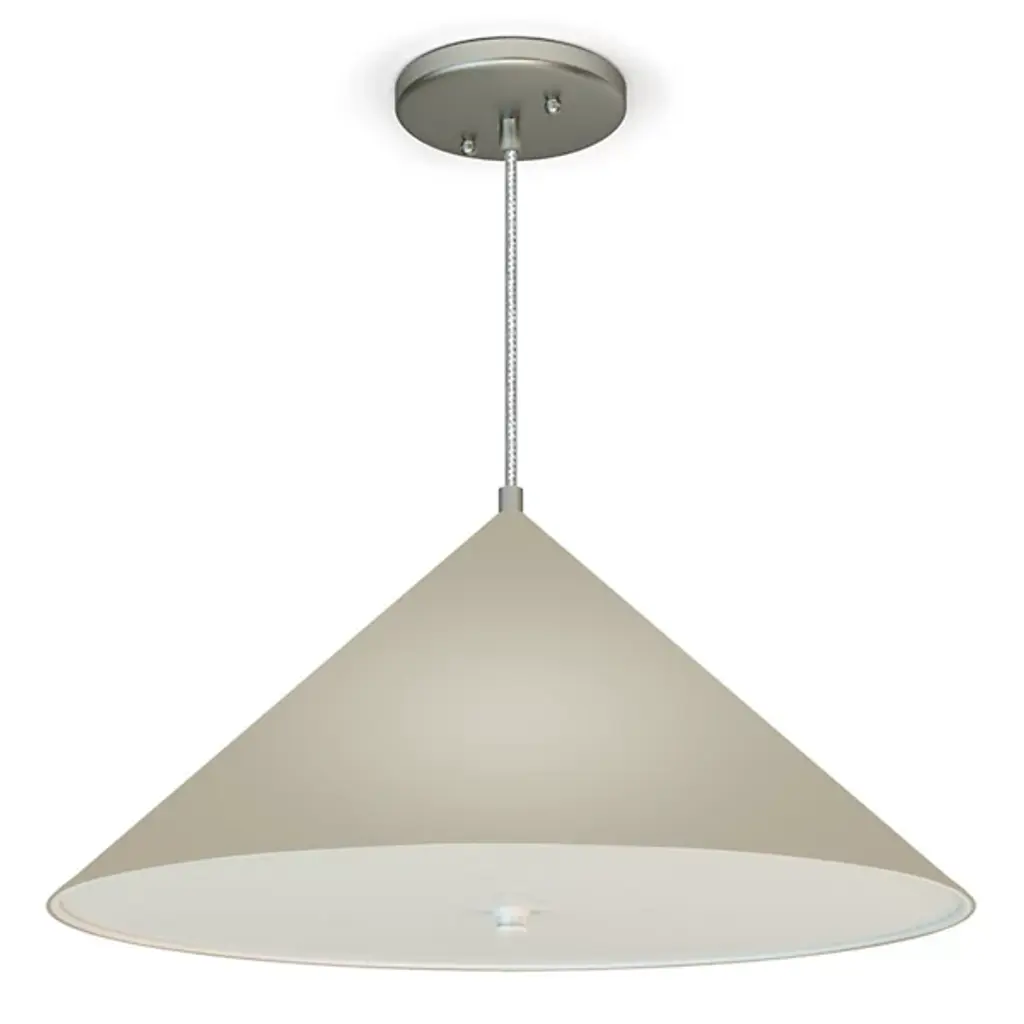 Transform your living spaces with the simple geometric shape of the Angelica Pendant from Seascape Lamps. A simple contemporary design, it descends from a circle-shaped canopy and places strong lamping inside a cone-shaped textile shade. A circular diffuser is nestled just inside the rim of the shade’s open base, held in place by a small circle accent that coordinates with the other smaller fittings. This shade arrangement reduces bright glare from the lamping and channels out a broad, even ambiance below that doesn’t overpower its environment.