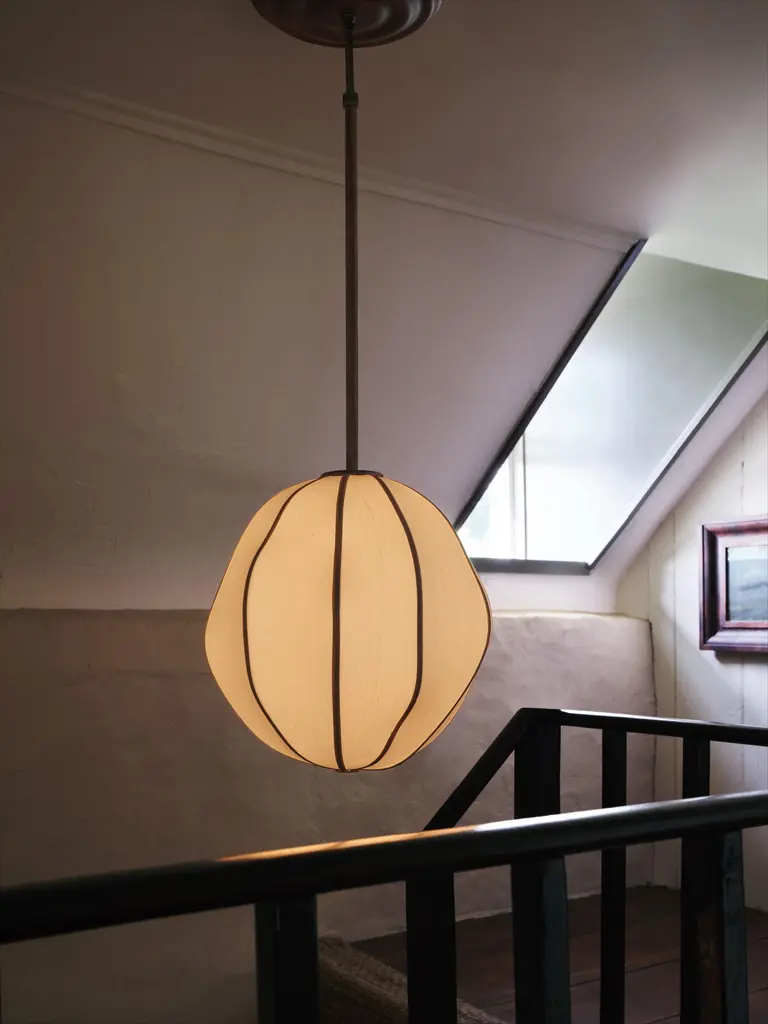 A perforated hardwood post stretches from floor to ceiling, allowing the lamp armature to be moved up or down to the desired height. A hand-upholstered silk globe is suspended from the end of the armature, providing a warm glow.Materials: White Oak or Black Walnut with Silk Lampshade.Dimensions: 18" W x 18" D x Variable H (min. 23")also available in small and large sizesCustomization: Available.Lamping: 1 E26 bulb, max 75W. Small/Medium: 5.5W dimmable LED bulb included, 465 lumens. Large: 9W dimmable LED bulb included, 800 lumens. 2700K color temperature. 120V, UL approved. (240V available)