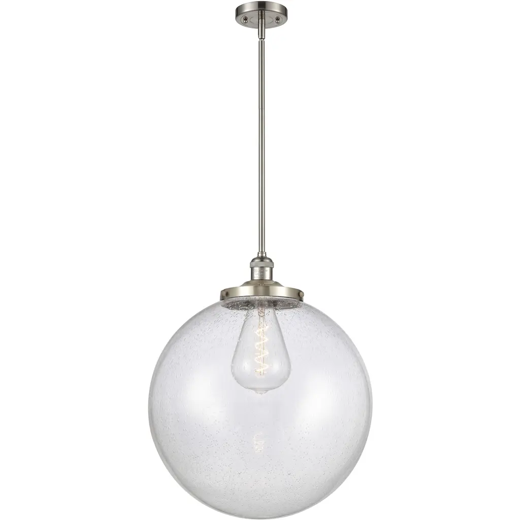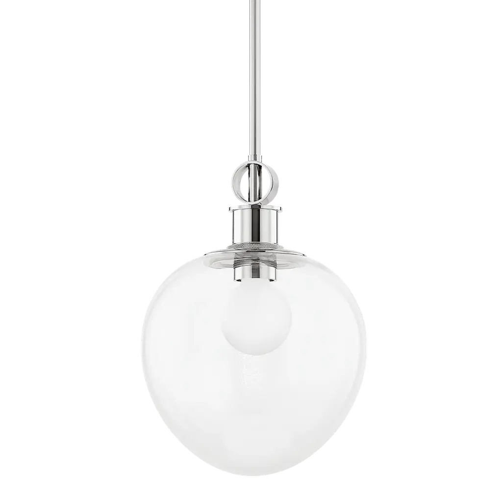 Simple yet savvy, the Anna Pendant is a modern classic that will work in any space. A linear, polished nickel or aged brass pipe drops down to reveal an oval glass dome housing a single light source. Also available in a larger size.